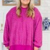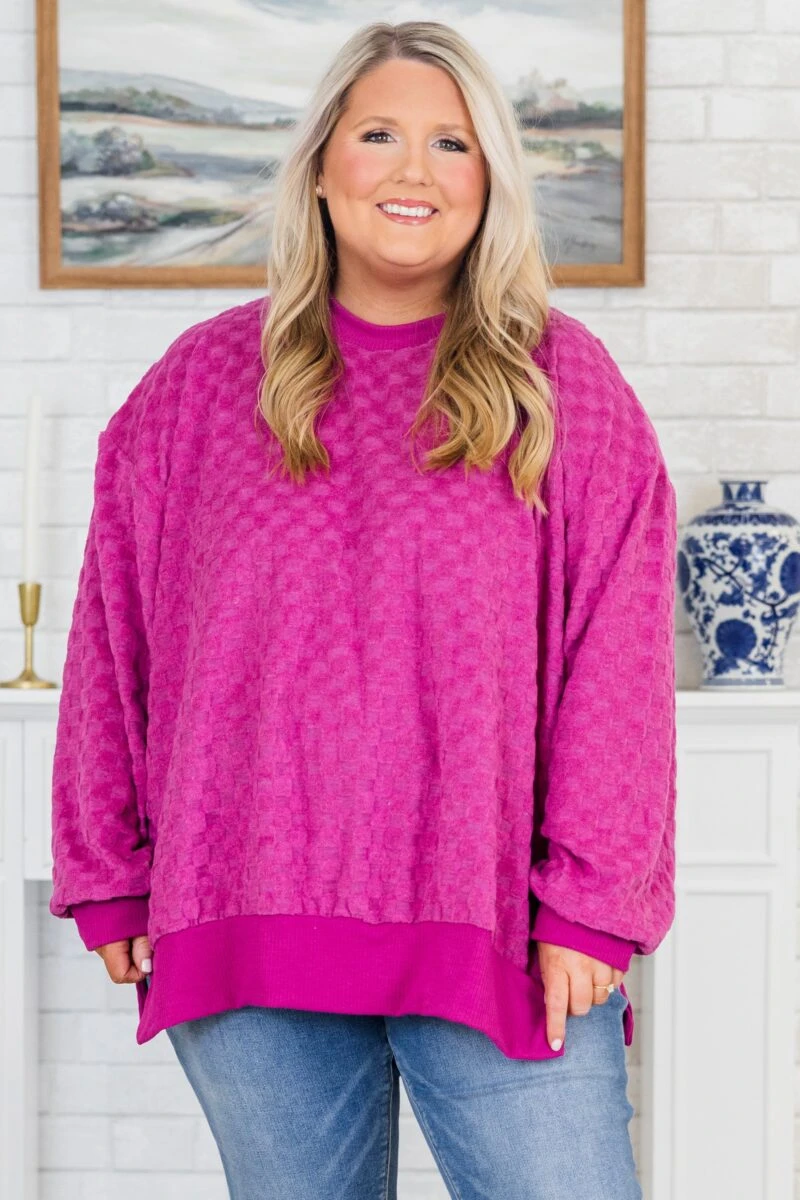 Unleash your inner joy with this sweater! This playful and unique sweater features a textured checkered dolman top and side slits for added style and comfort! Spread happiness and style wherever you go with this quirky and fun addition to your wardrobe!