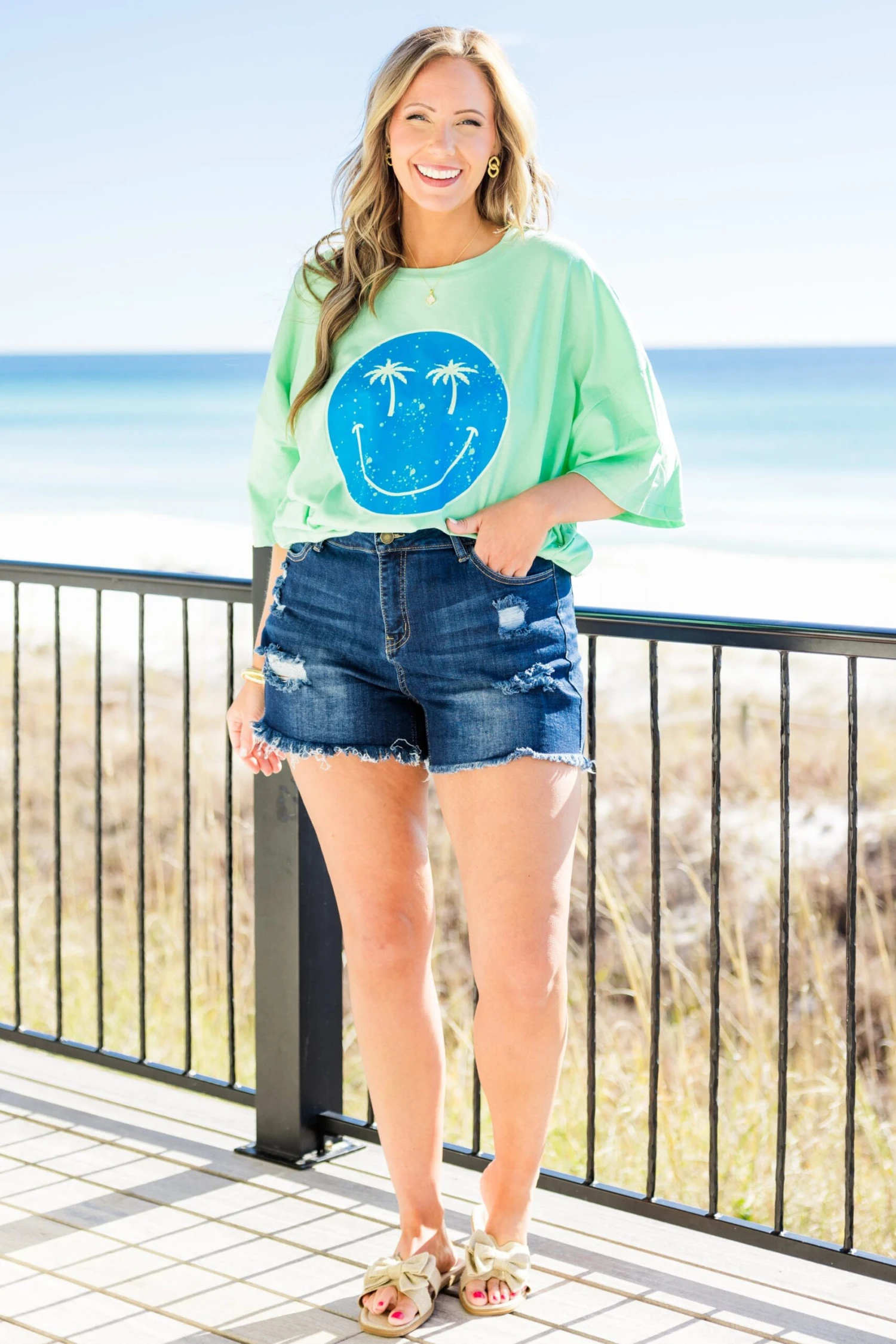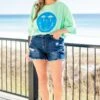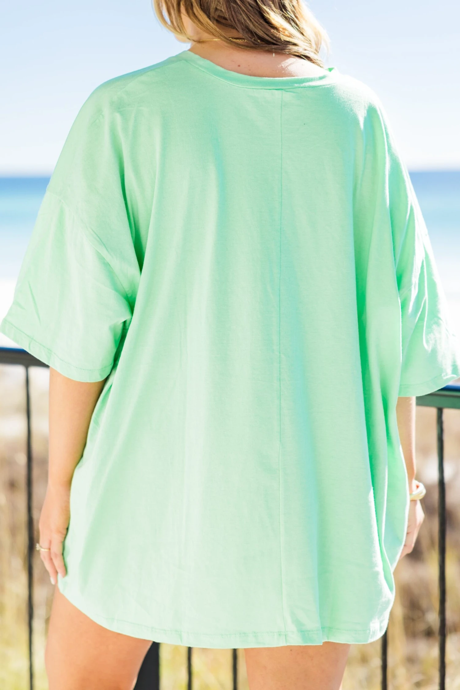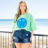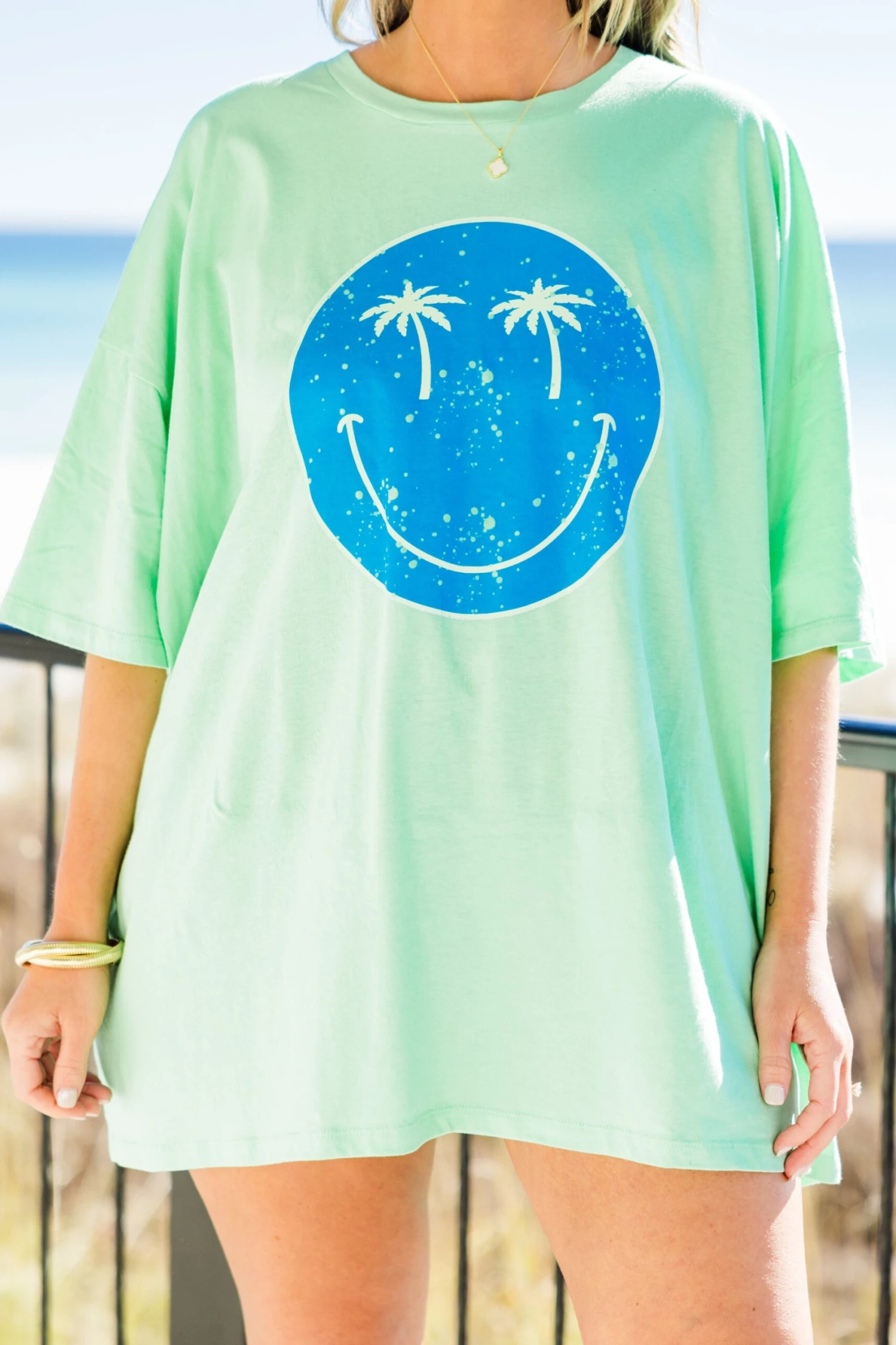 Spread good vibes with this oversized boyfriend tee featuring a tropical inspired smiley face! Perfect for casual days, this soft green mint shirt radiates positivity and comfort! Plus, the relaxed fit is perfect for lounging under palm trees or anywhere, really! Get ready for some palm-slinging fun!
