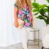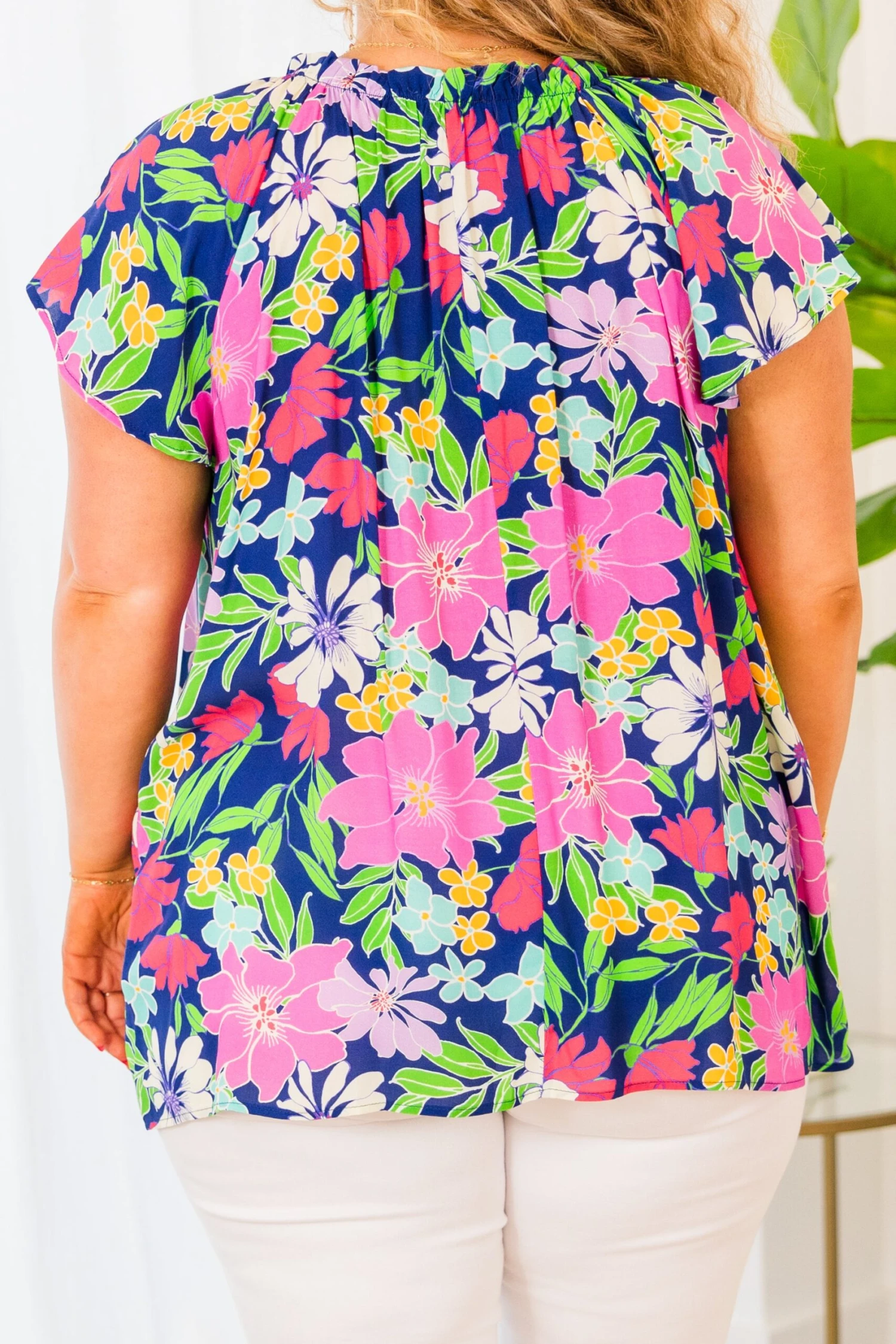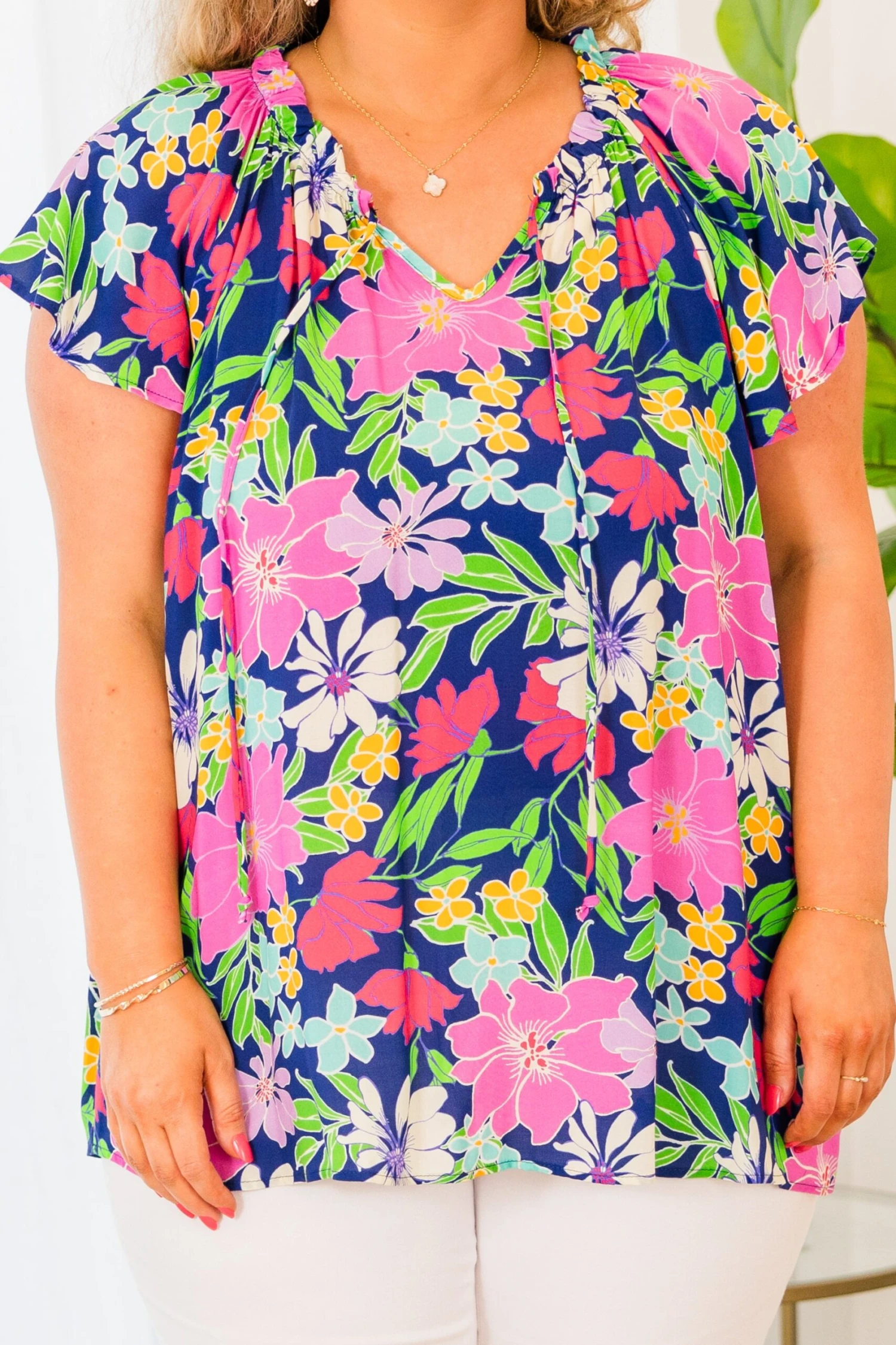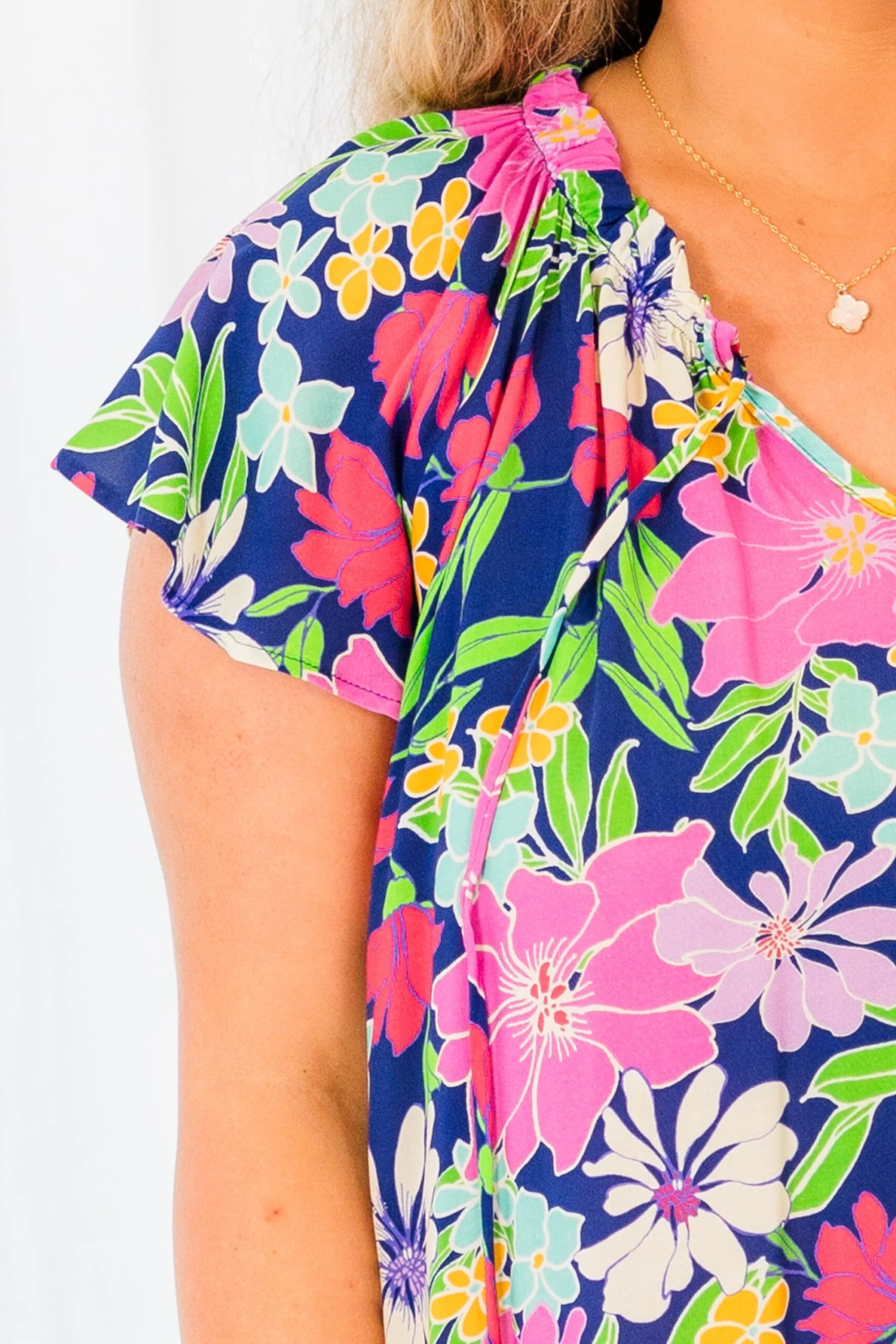 Upgrade your vacation wardrobe with our Ready For Growth top in navy! Stand out in the bold floral print and feel confident with the subtle ruffle on the neckline! Perfect for your next getaway adventure!