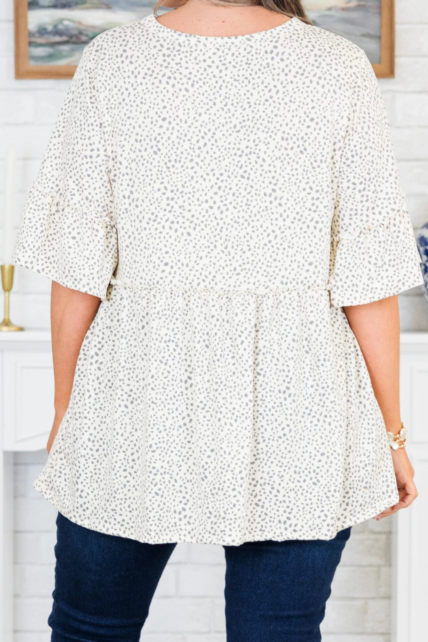 Embrace your wild side with this tunic, featuring a playful babydoll silhouette and a fierce animal print! The bell sleeves and ruffle detailing add a touch of whimsy to this ivory-grey top! It’s time to reclaim your style!