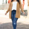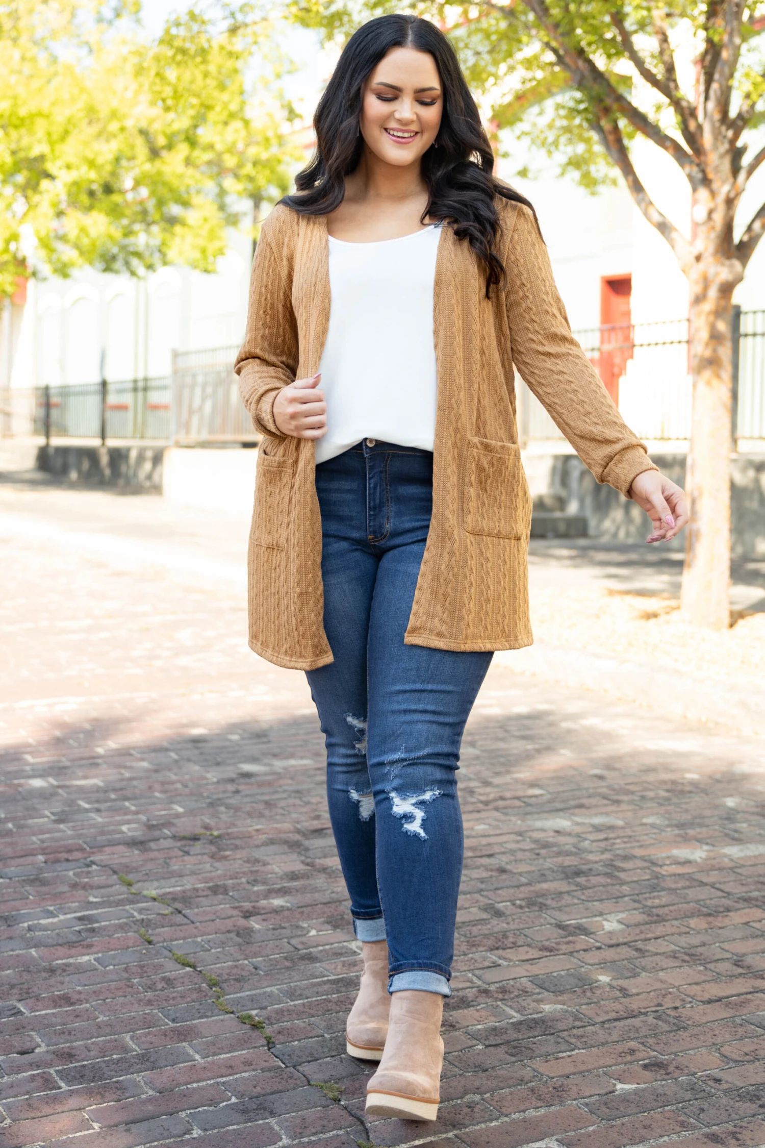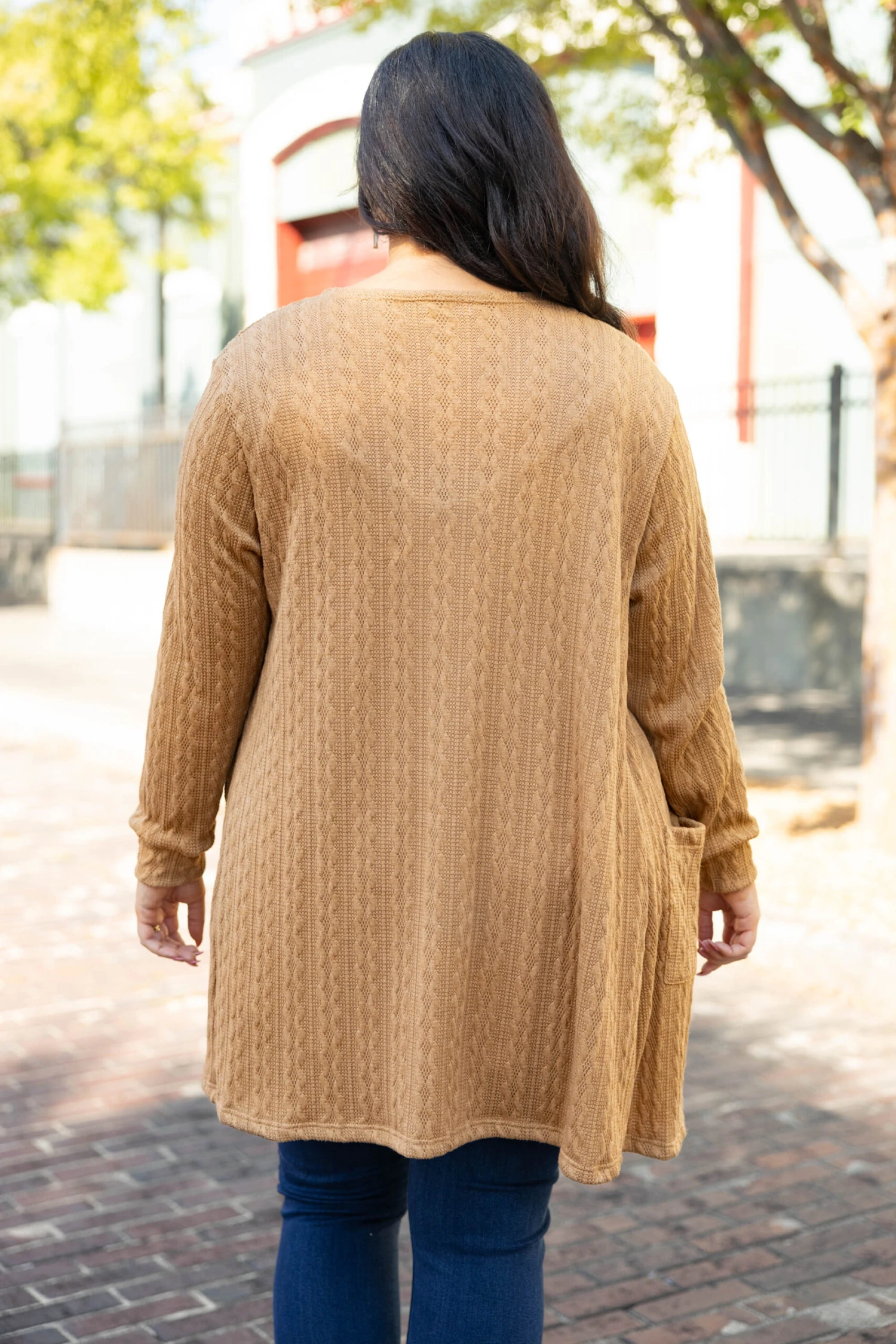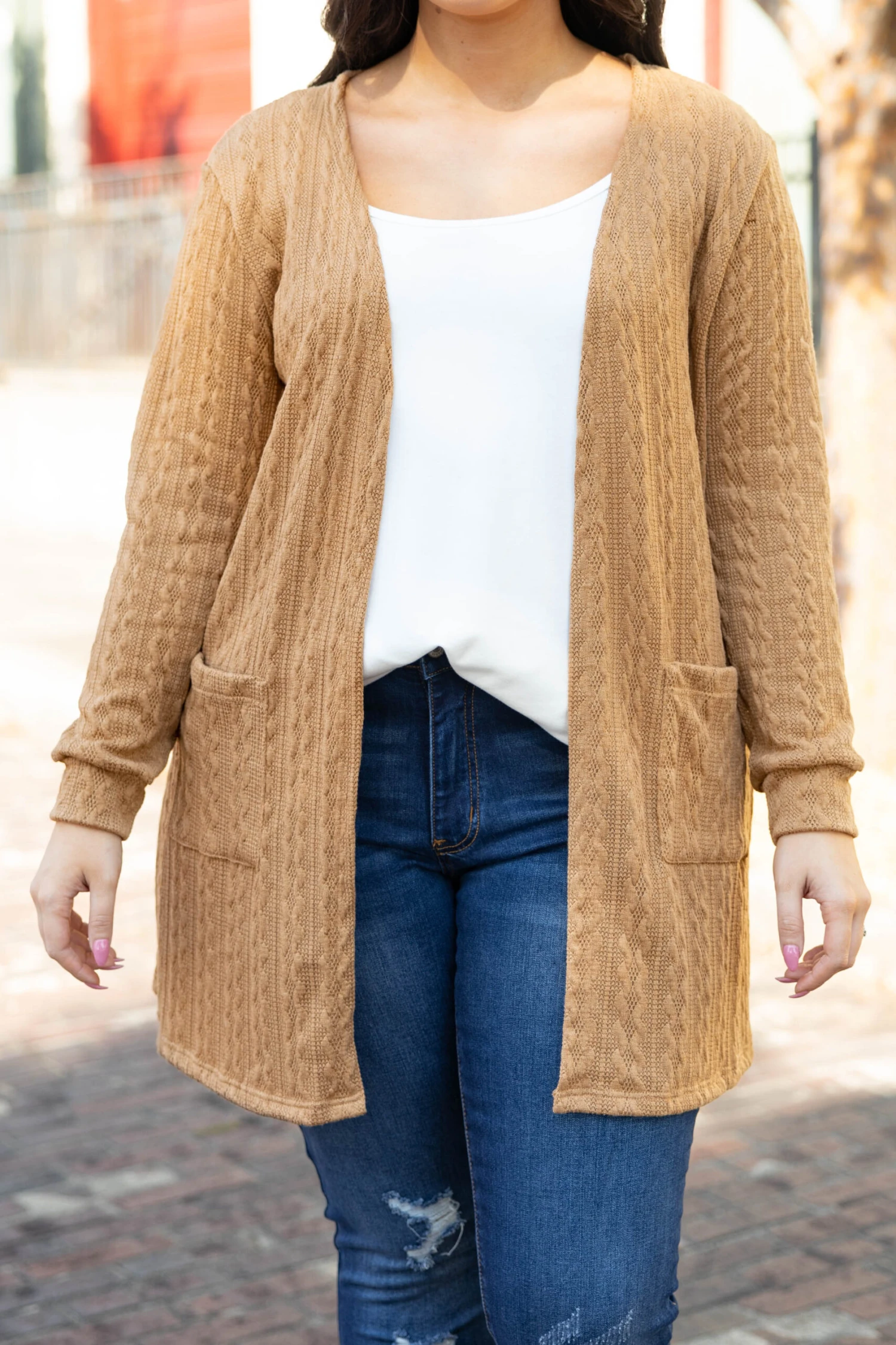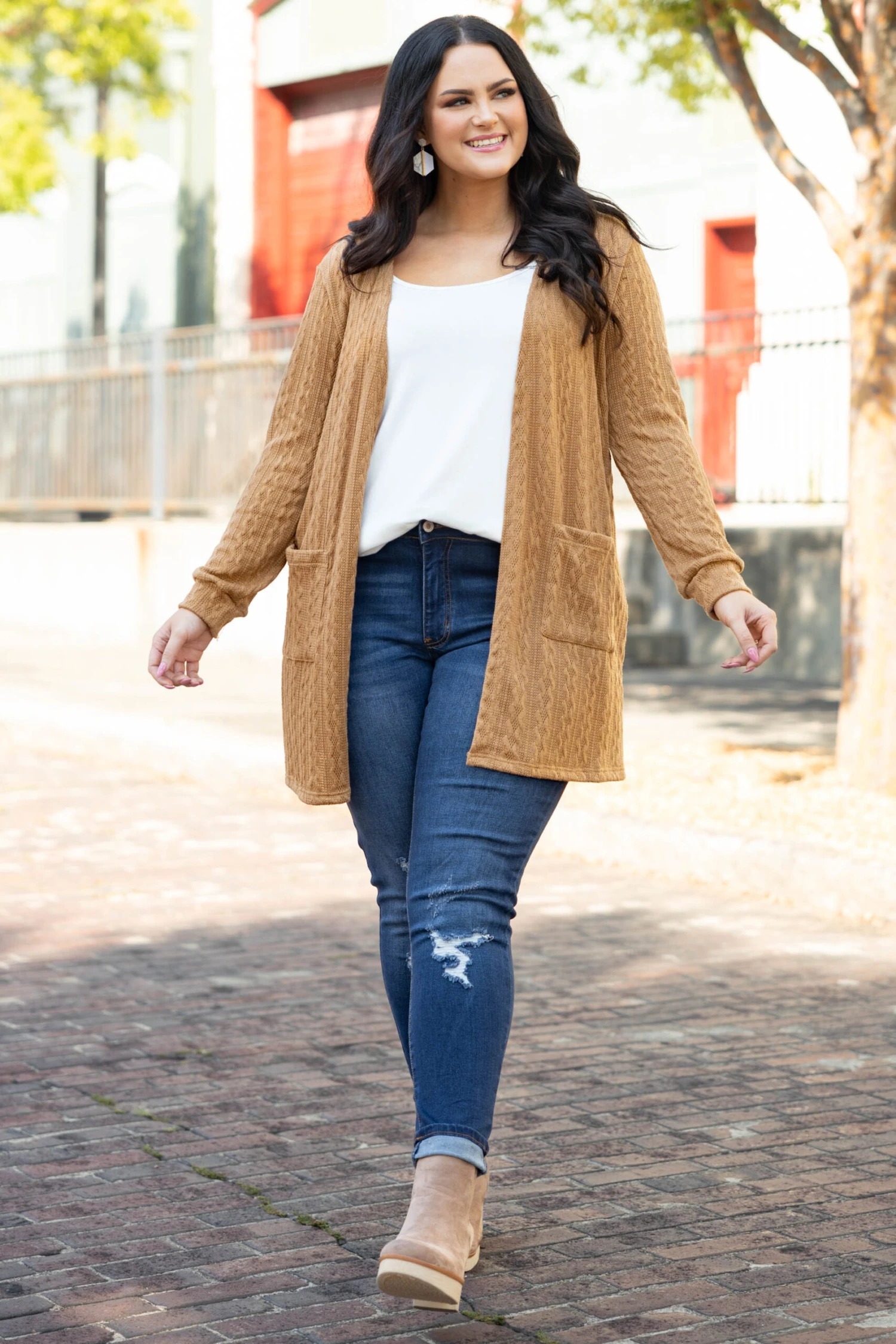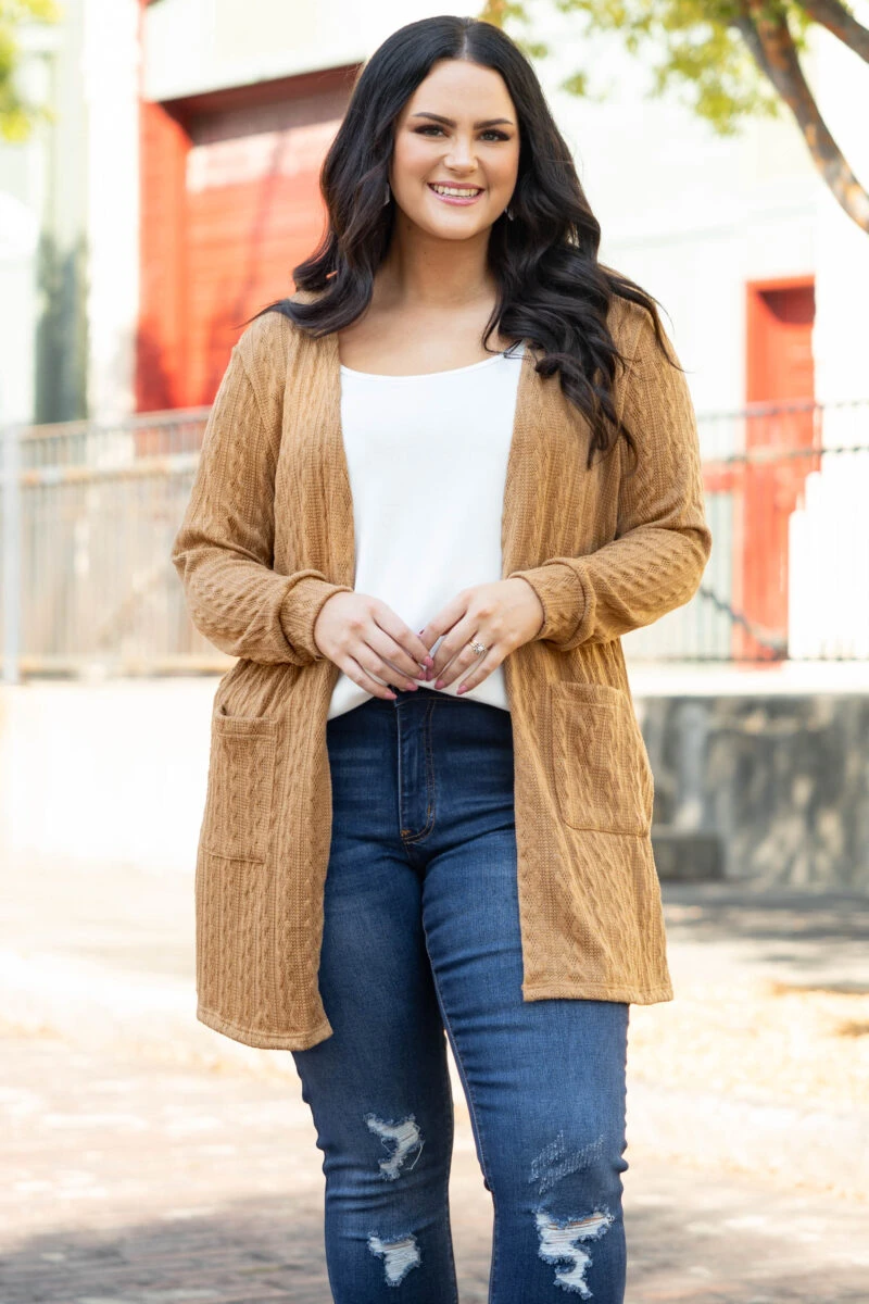 You’ll leave a lasting impression on the crowd in this beautiful cardigan! The soft brown color and ribbed texture is SO cute and trendy! The stretchy material is so comfy and is perfect for every day wear! Style this cardigan with a solid top and skinnies or a cute dress and booties for a casual, chic look!