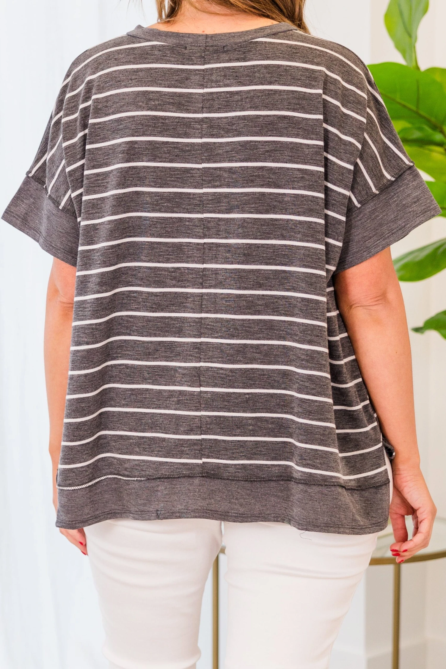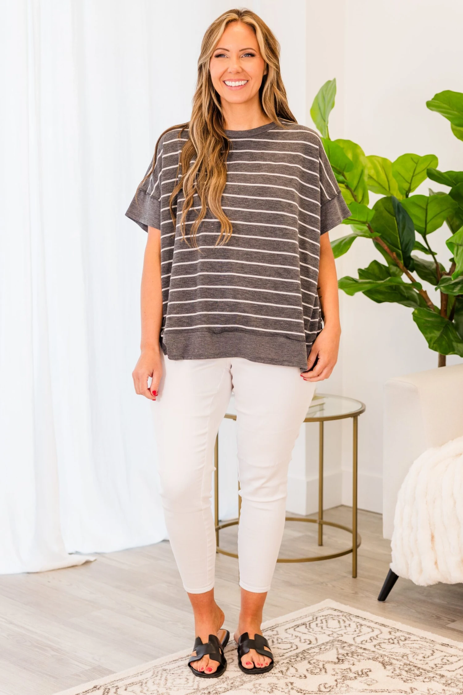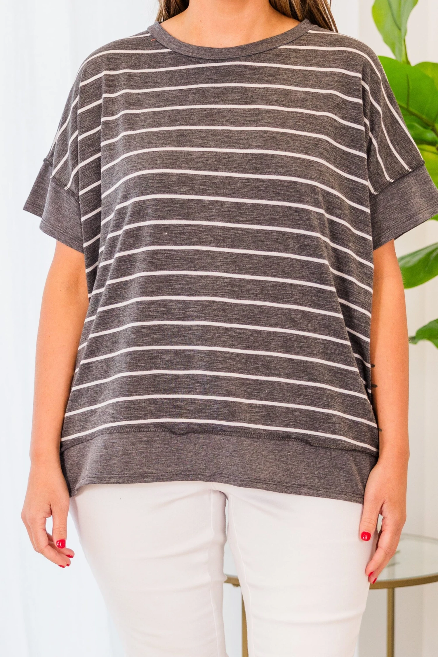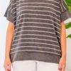 This is the top that you’ll want to wear every day! This top has a lovely striped design and a figure flattering fit that you won’t be able to get enough of! Comfy and cute is the trend for the season! Style this top with some skinnies or leggings for a casual, chic look!Â