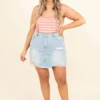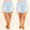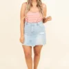 We love this light denim skirt! This cutie has the perfect amount of distressing and a trendy raw hemline. Simply pair this with your favorite summer top and cute sandals for a fun and flirty look!