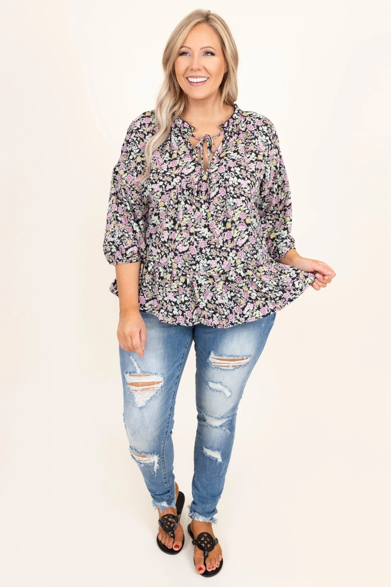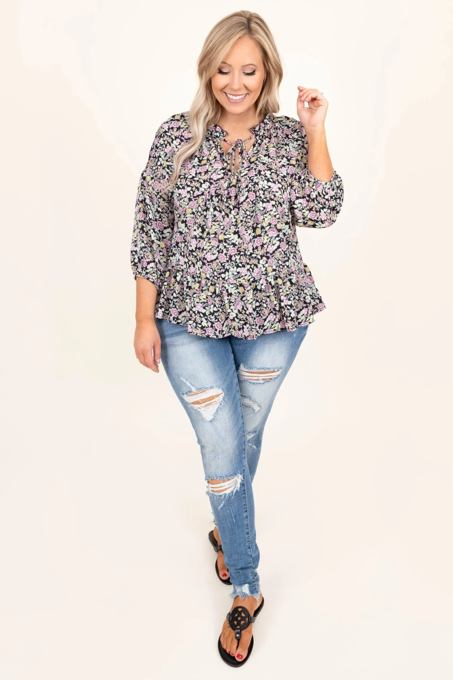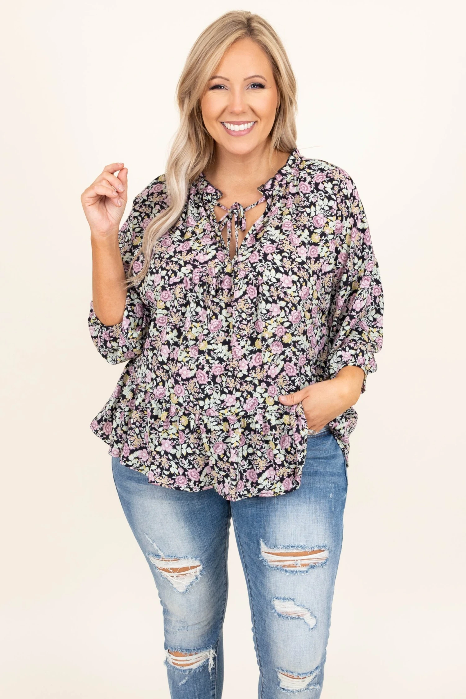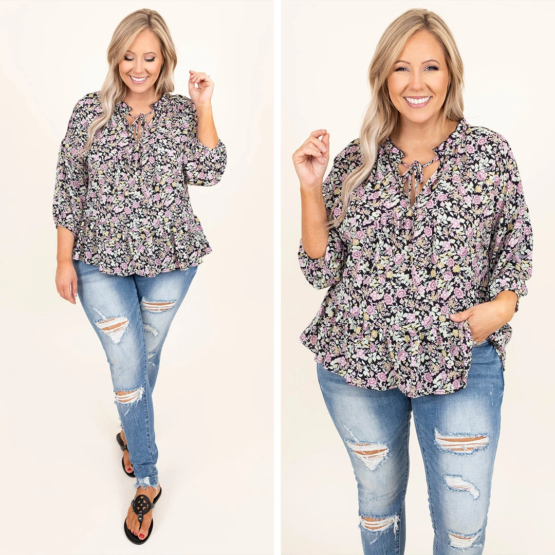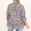 Work it in this top! The black color makes the floral pattern really pop and the ruffles at the bottom and the collar are so cute! We love the tie at the neck that gives this cutie something extra and the bubble sleeves which are super trendy! Style it with some skinnies or shorts for a runway ready look!