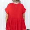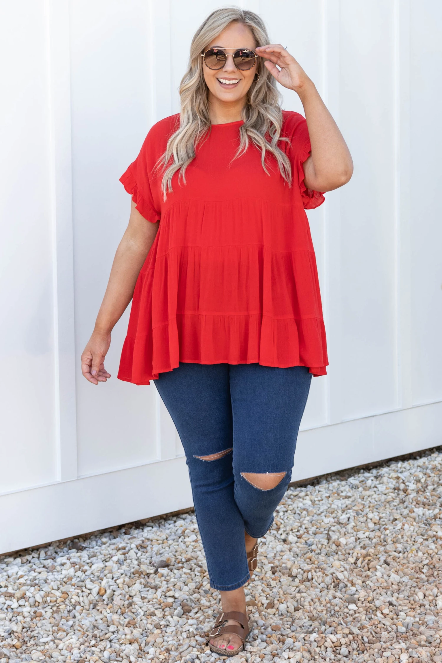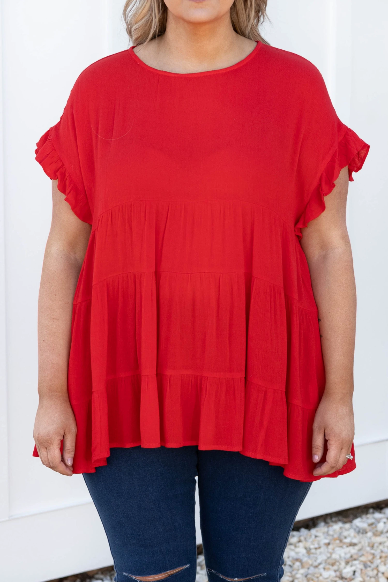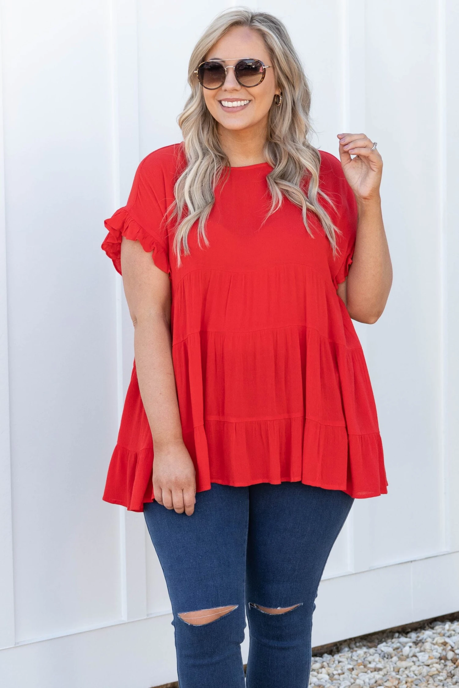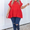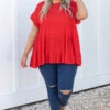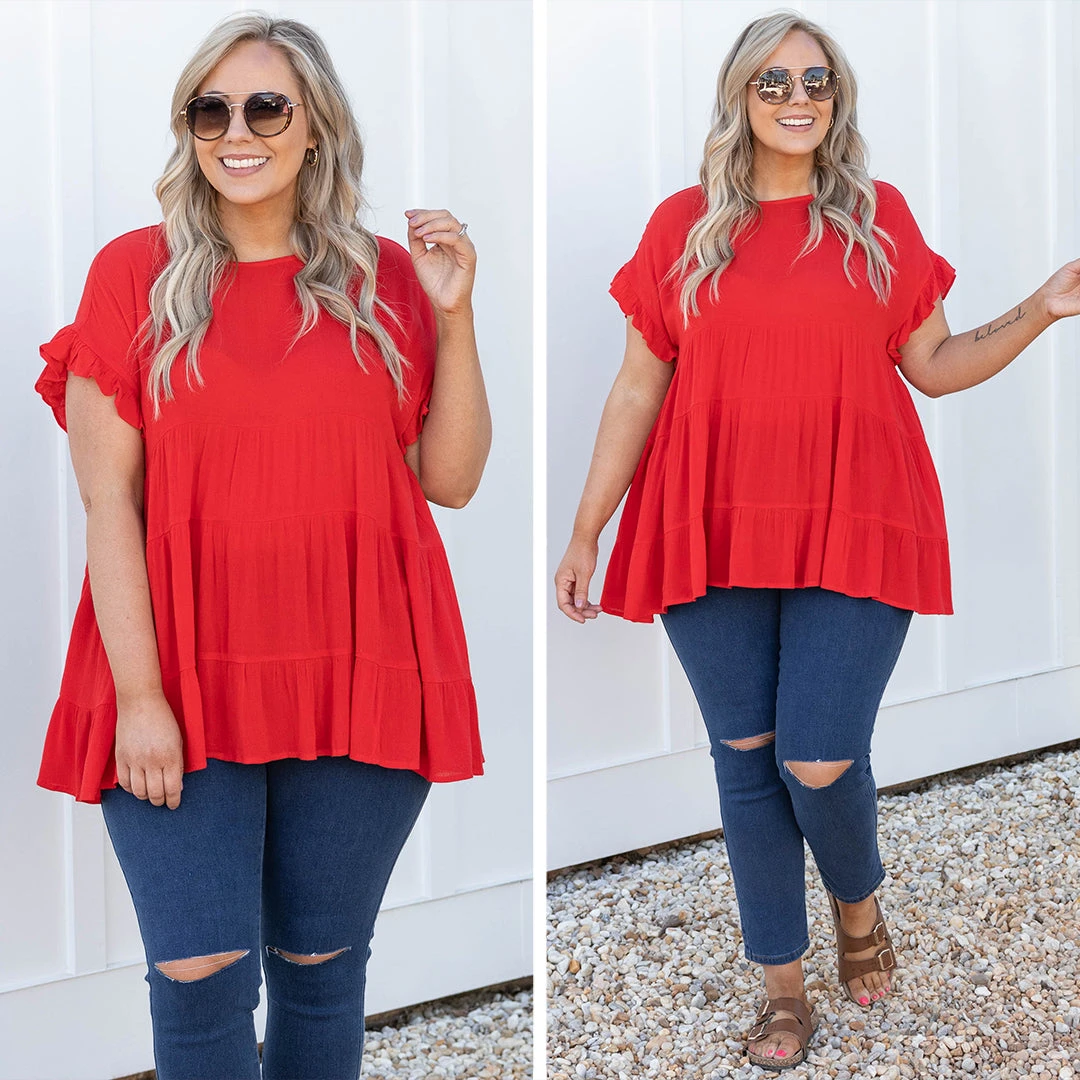 This is the perfect basic top! The solid red color is so great for this time of year and the babydoll style always looks so good on everyone! The ruffles on the sleeves are just the cherry on top of this cutie! Style this with some great skinnies and sandals for a stylish look!