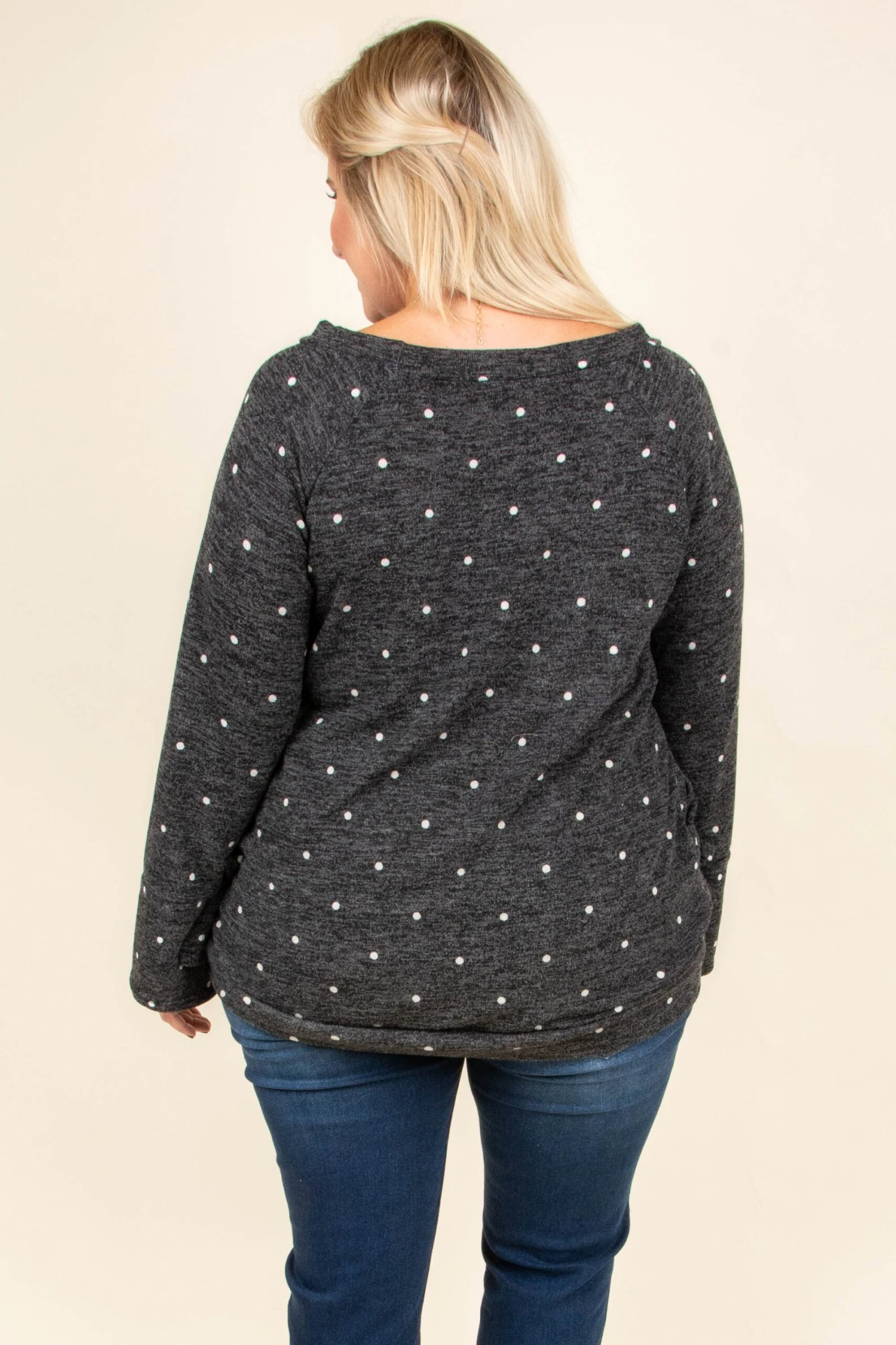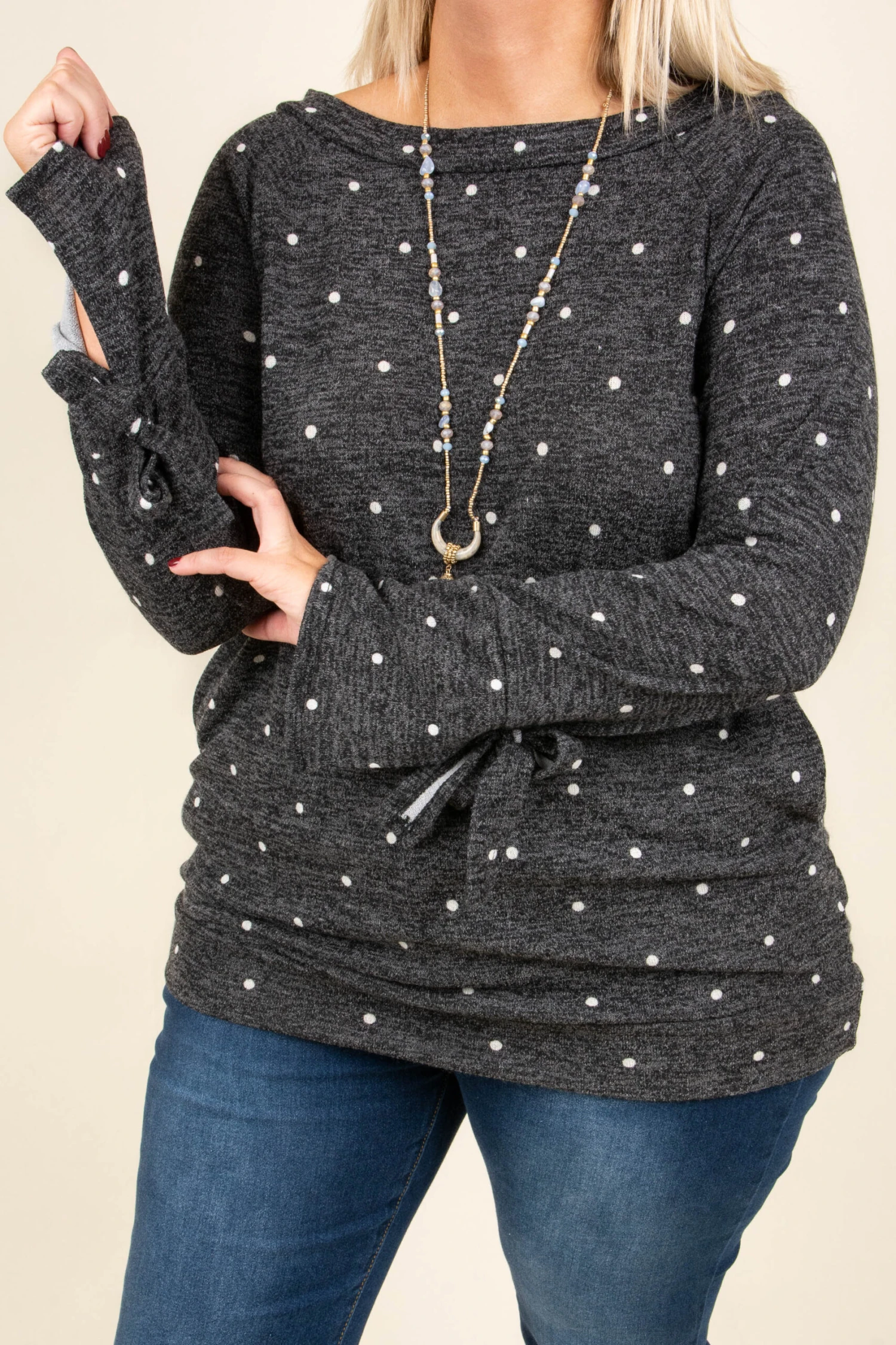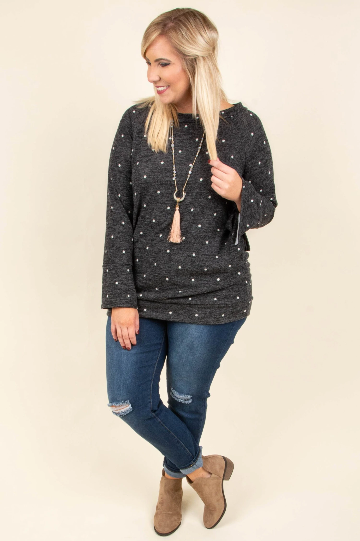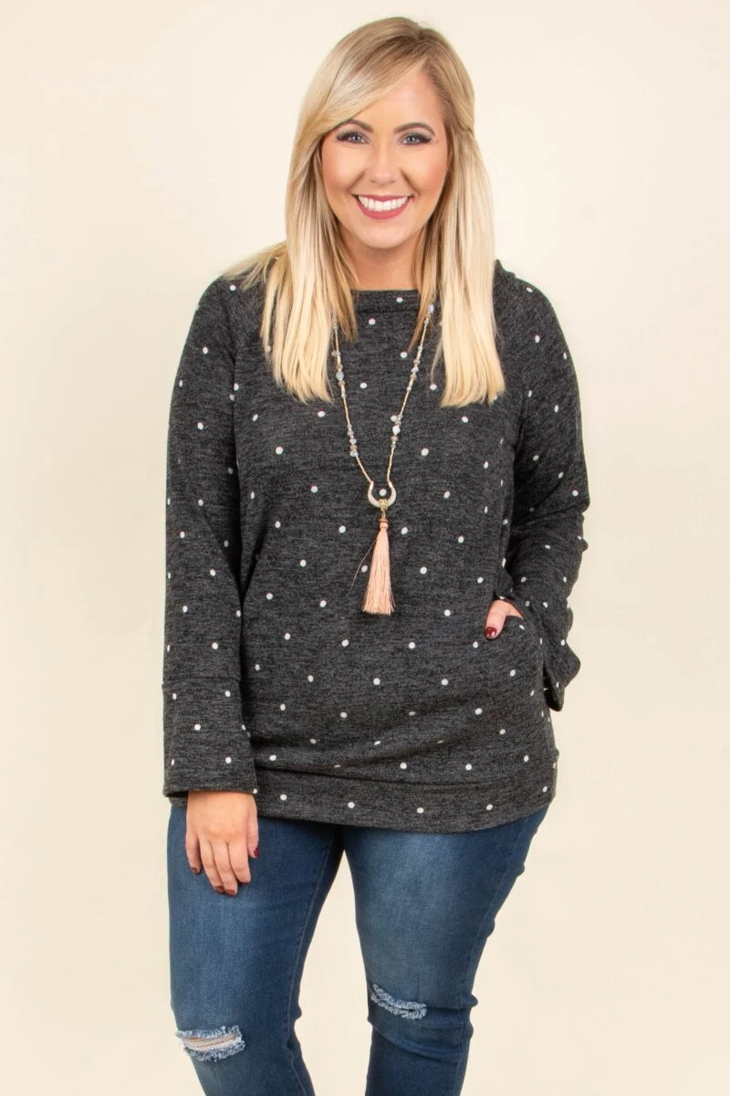 This pretty polka dot top will steal your heart! It has an ultra-soft, comfy fabric and the most adorable polka dot print. Plus, look at those CUTE tie sleeves! Throw this girly top on with skinnies and booties for a stylish outfit!