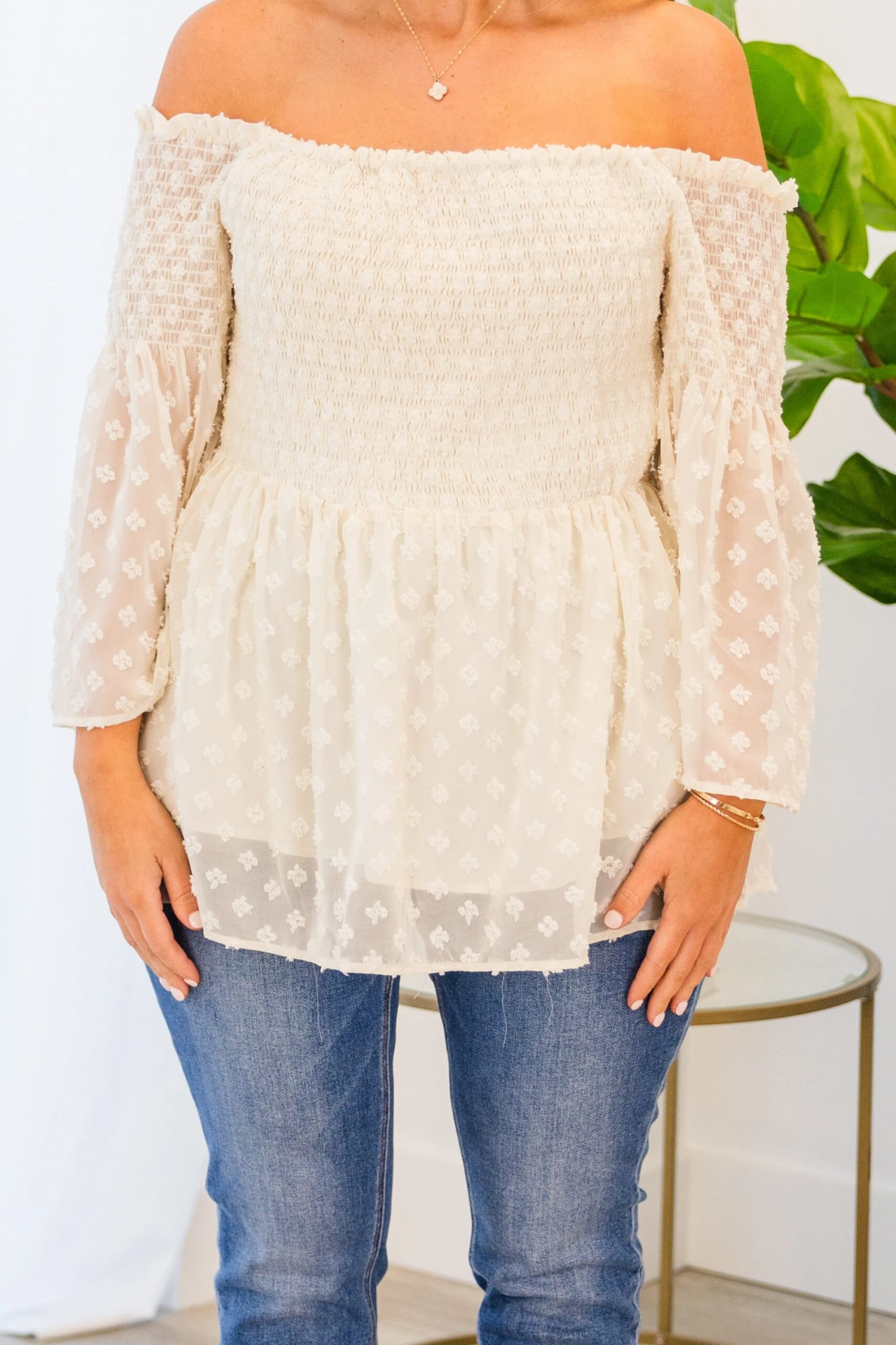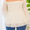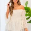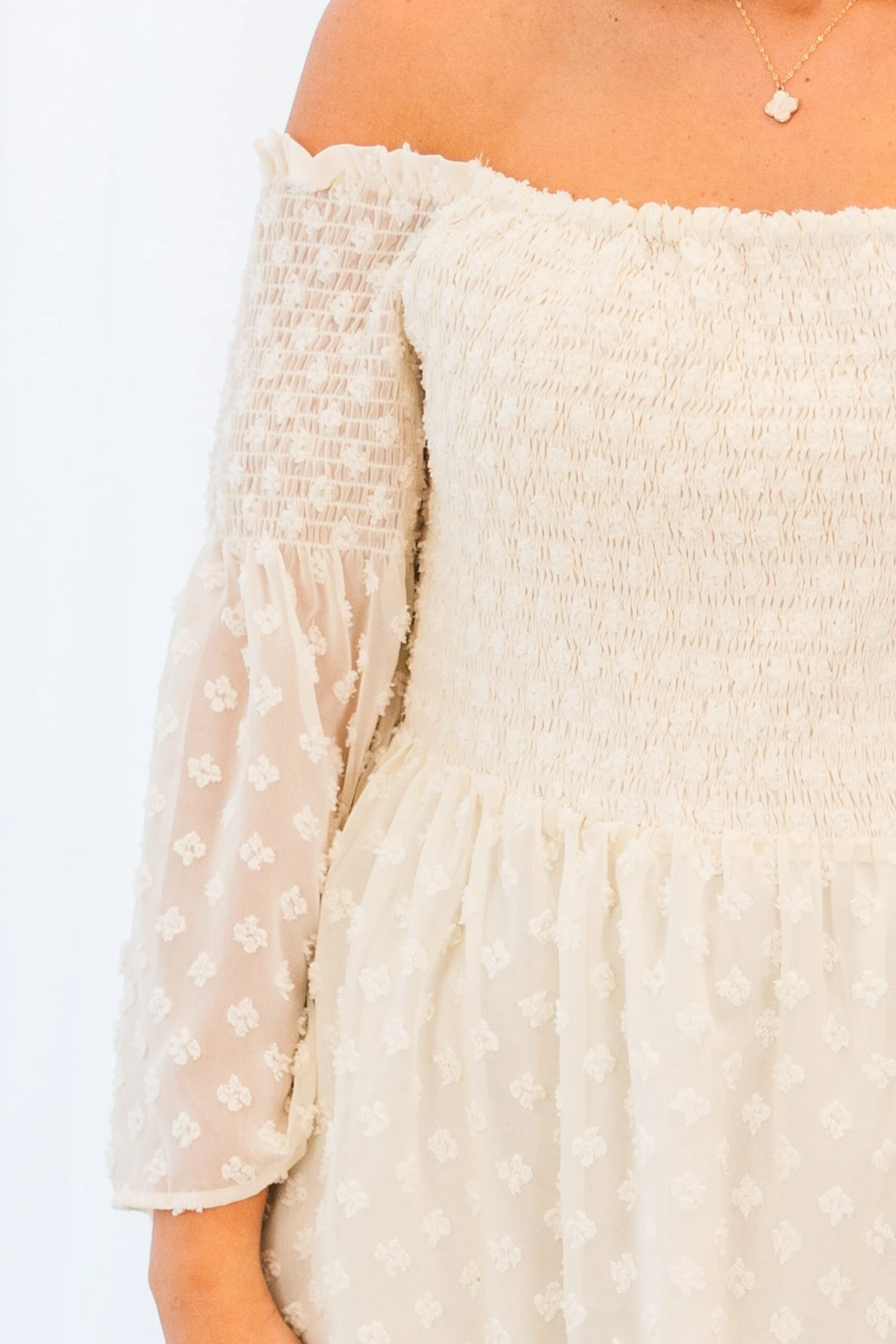 Get ready to ring in the season with this top! This charming top features delicate swiss dot detailing and trendy bell sleeves! The smocked bodice and elastic off the shoulder design add a touch of femininity to the babydoll style! Embrace the warm weather in style!
