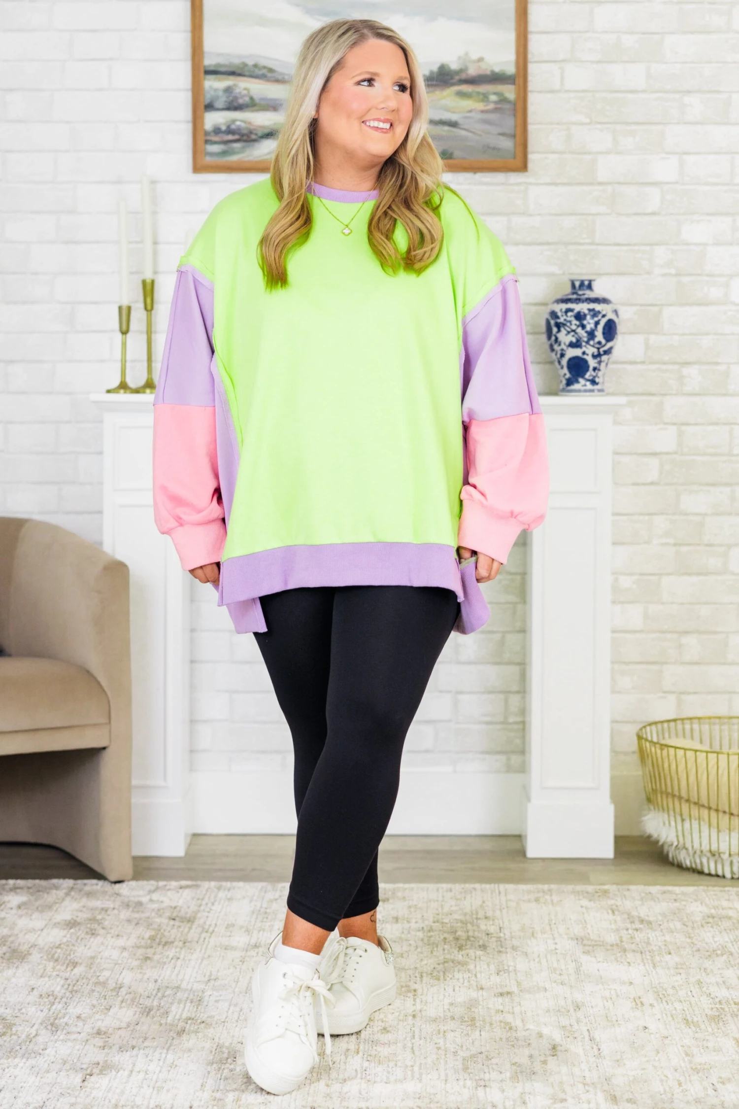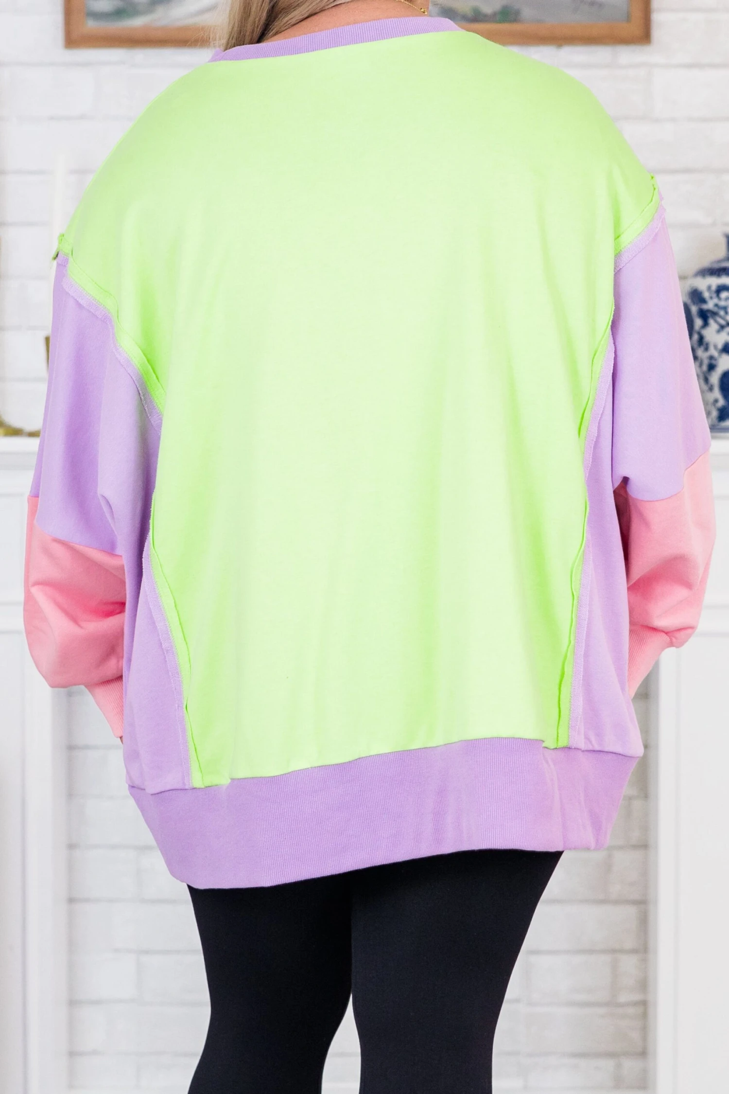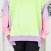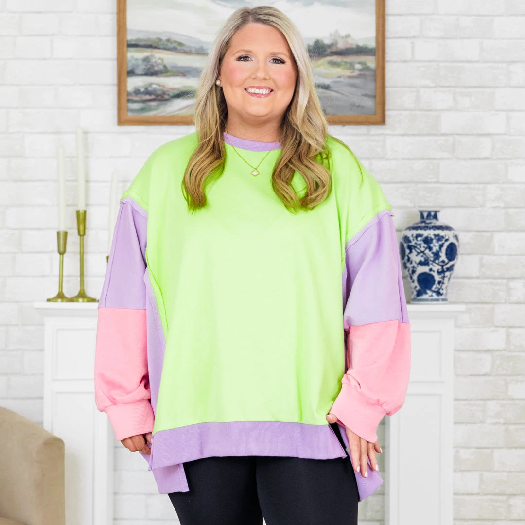 Get ready to rise to any opportunity in this color block pullover! With bright neon green, purple, and pink colors, you’ll stand out in style! The front slits add a touch of uniqueness, while the reverse seam detail adds an extra edge! Don’t miss out on this playful and quirky addition to your wardrobe!