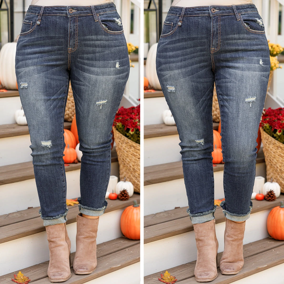 These FAB jeans are the perfect addition to any wardrobe! These jeans feature a trendy dark wash and a distressed design for a classic vintage look! In addition, the frayed hemline offers a modern twist to the garment!
