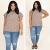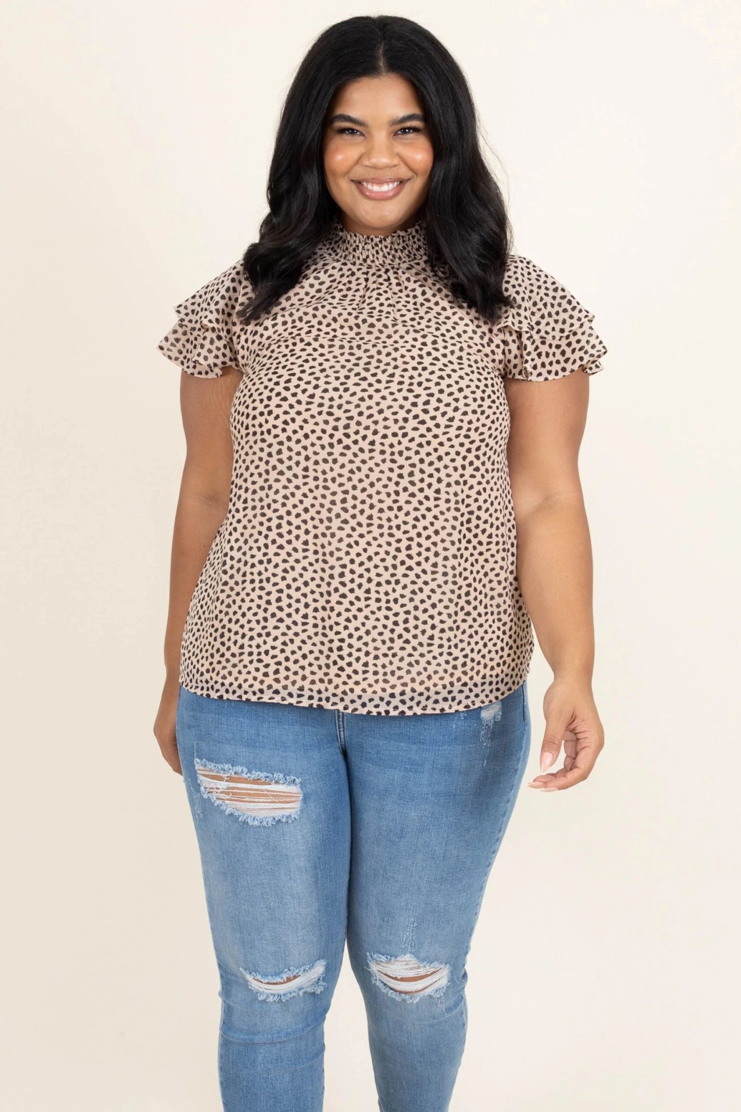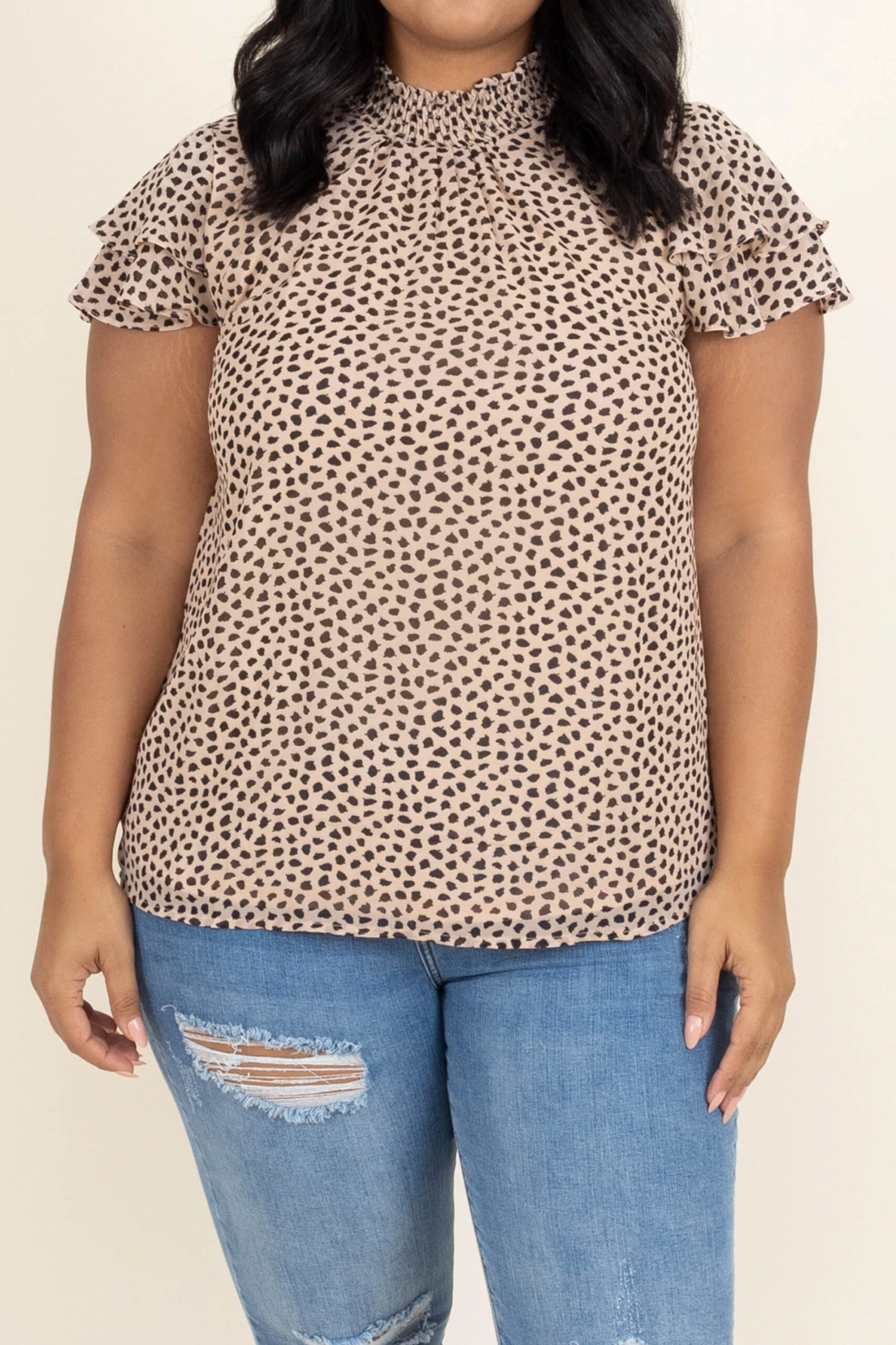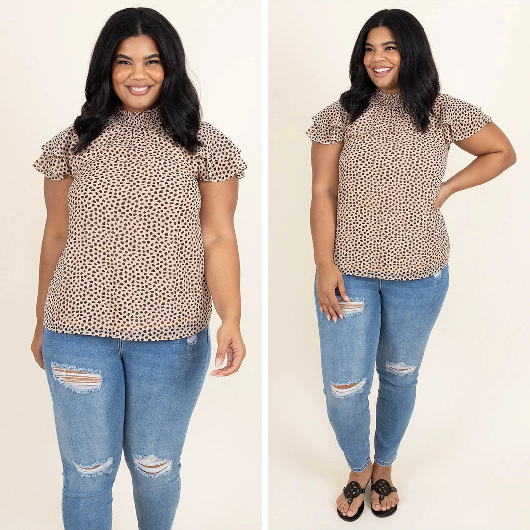 Go on a safari adventure with this fierce top! This cutie has a neutral taupe color with a leopard pattern that is so sassy! The high neck ruffle sleeve look is so trendy right now and the smocked detailing on the neck will keep this comfy all day! Style it with some skinnies and sandals for a super chic look!