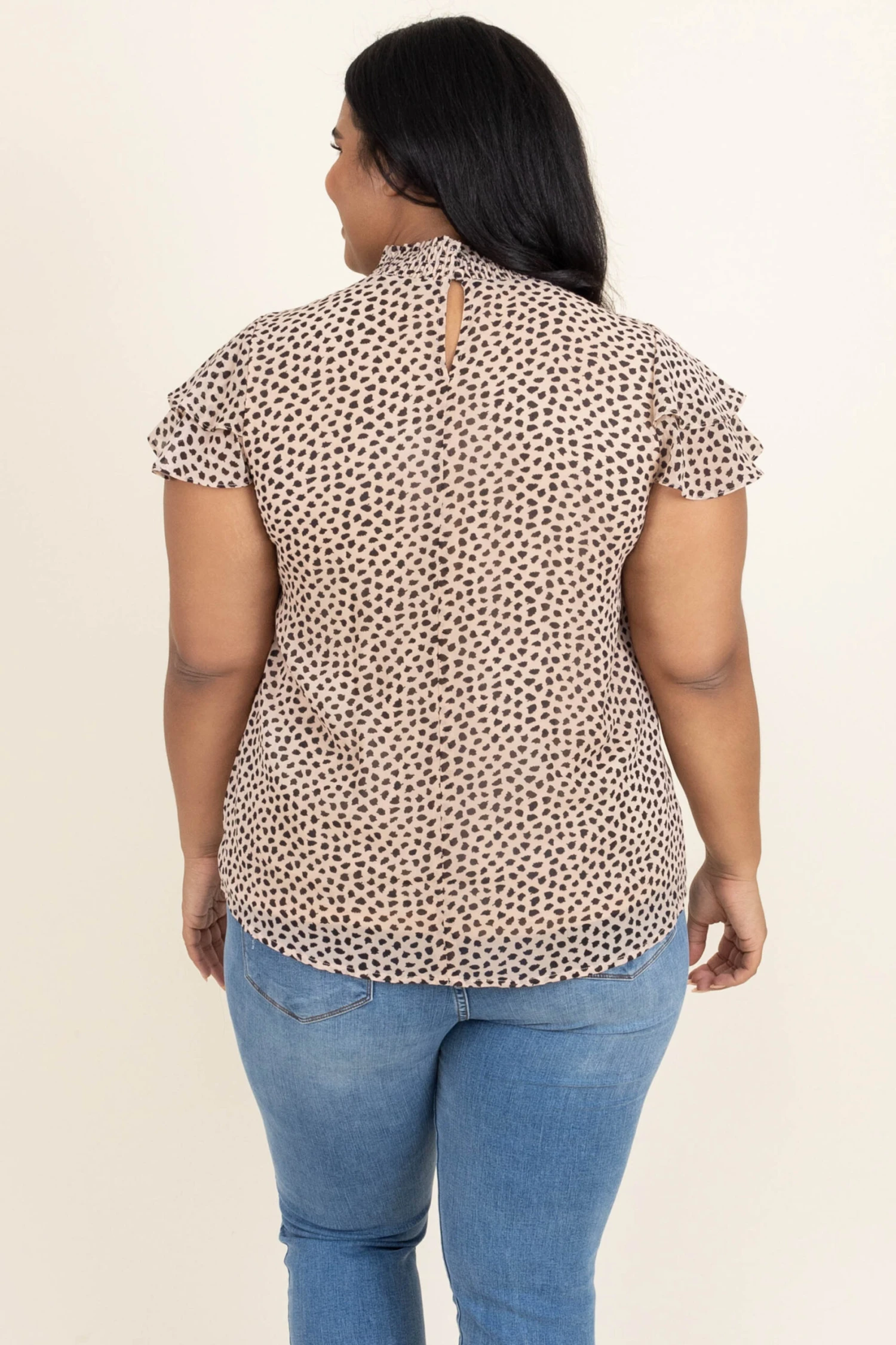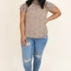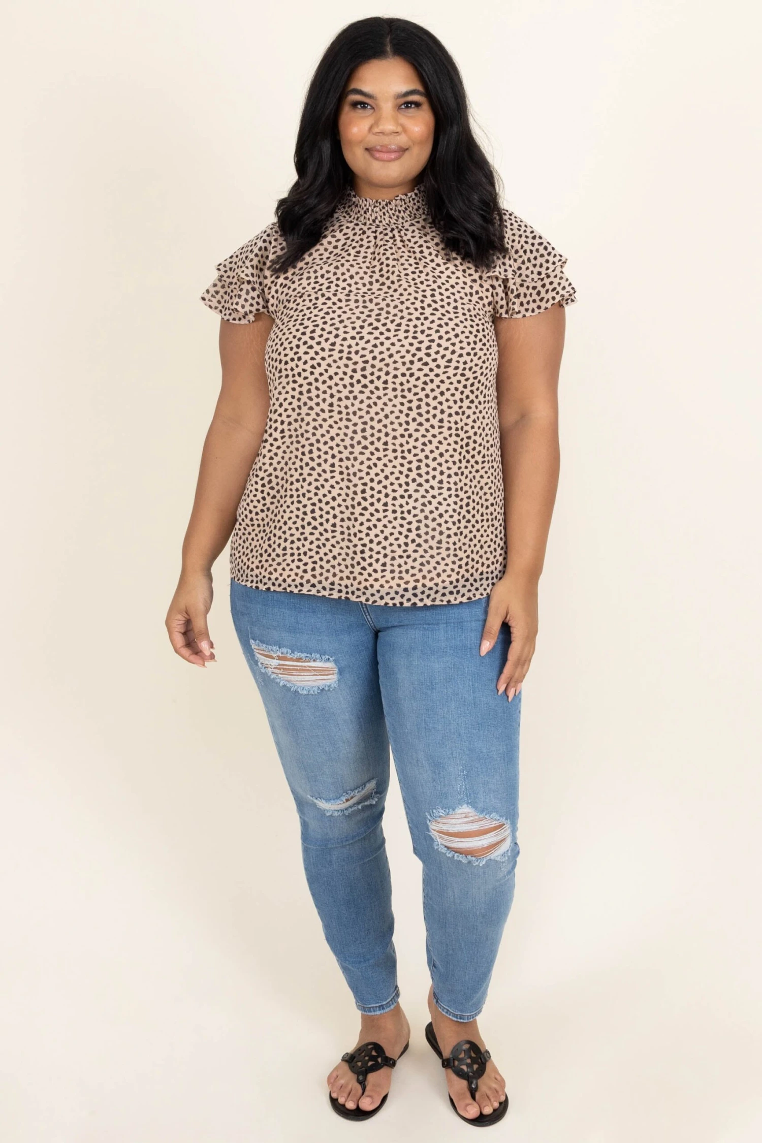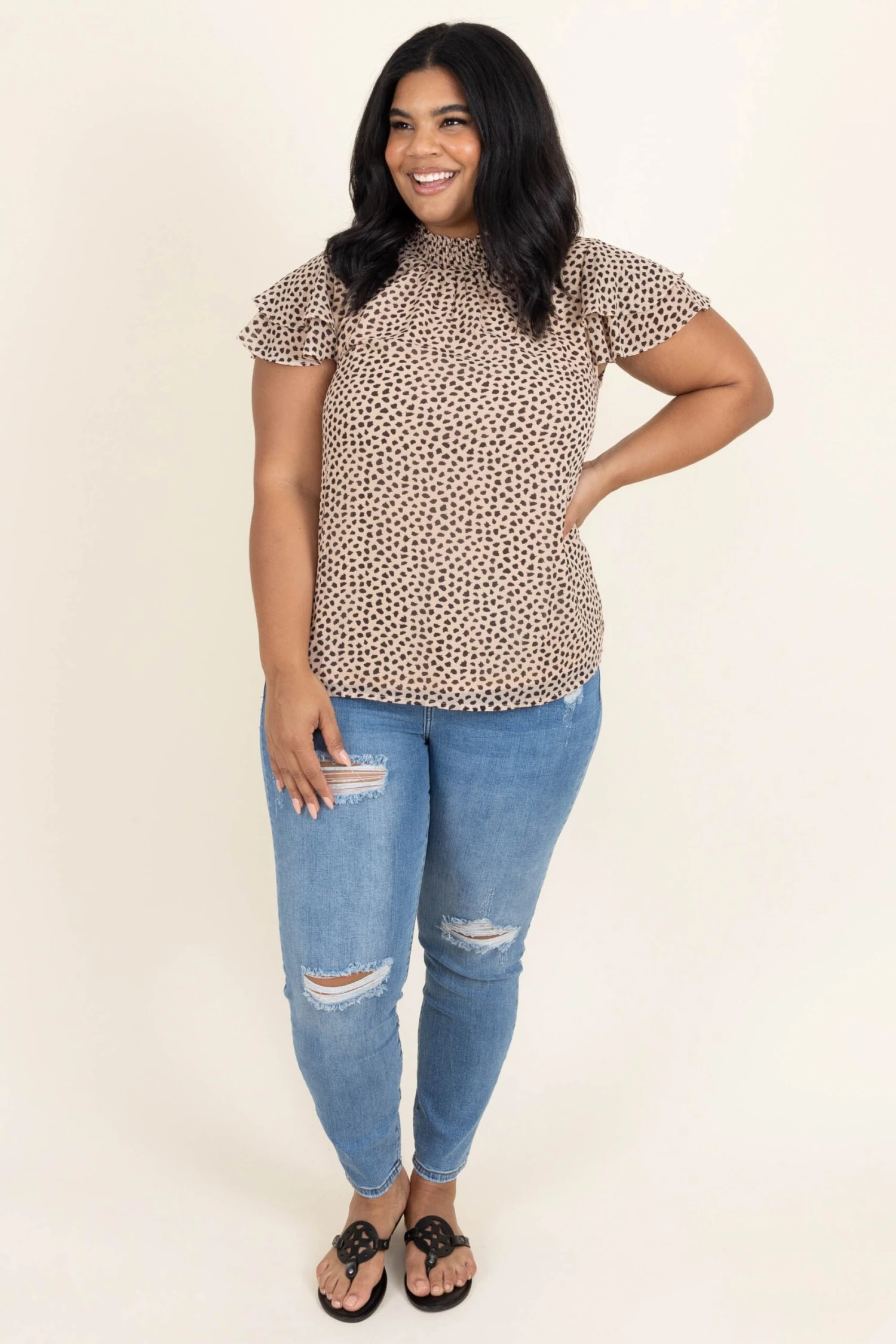 Go on a safari adventure with this fierce top! This cutie has a neutral taupe color with a leopard pattern that is so sassy! The high neck ruffle sleeve look is so trendy right now and the smocked detailing on the neck will keep this comfy all day! Style it with some skinnies and sandals for a super chic look!