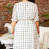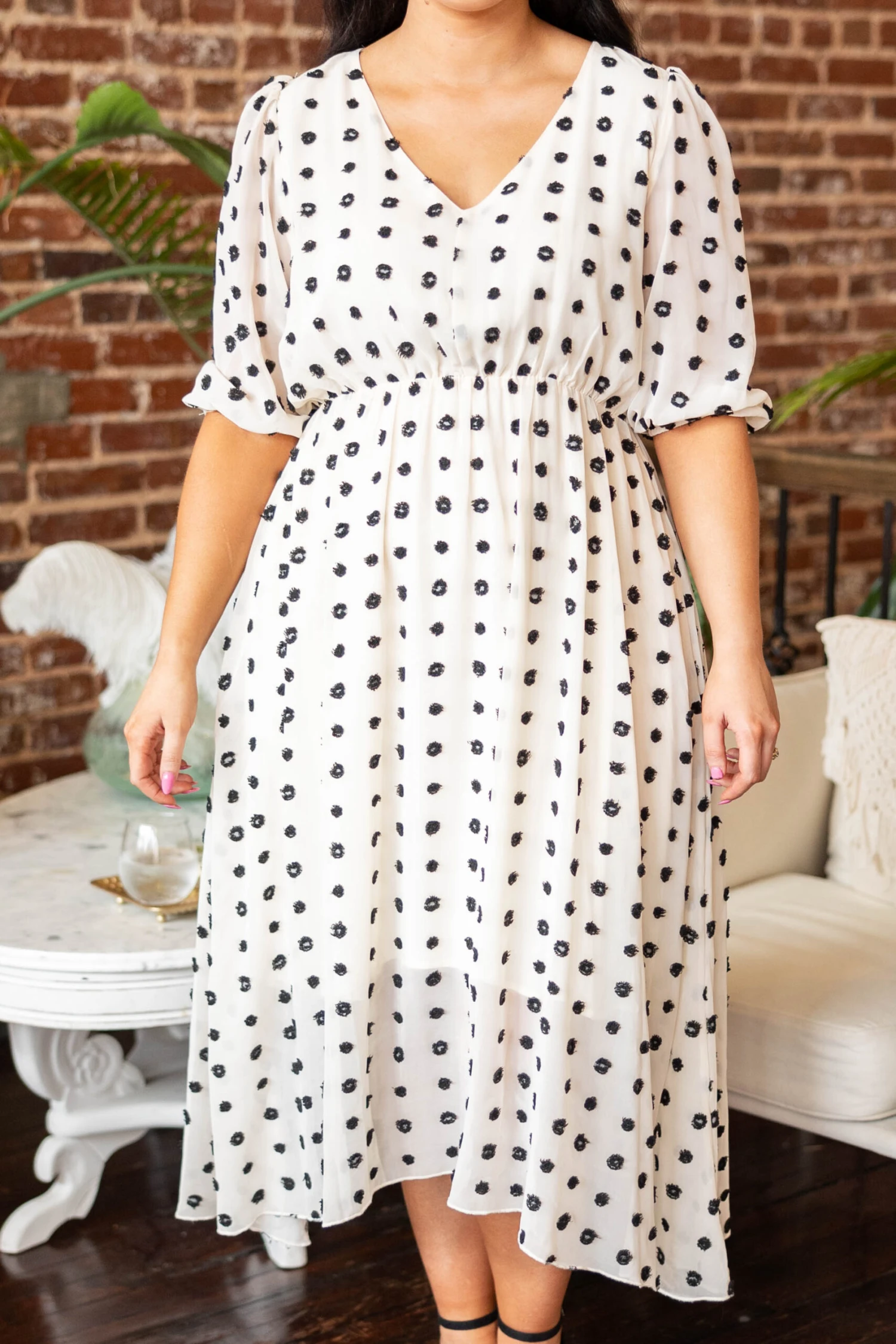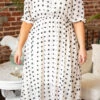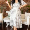 Don’t pass by this gorgeous dress! This dress has a neutral ivory color and a trendy raised polka dot pattern that is super sweet! The flowy fit and stretchy waistline is perfect for all day wear! Whether you are headed on a date night or brunch date with the girls this dress is perfect for every occasion! Style this beauty with some heels or wedges for a sassy chic look!Â