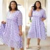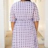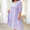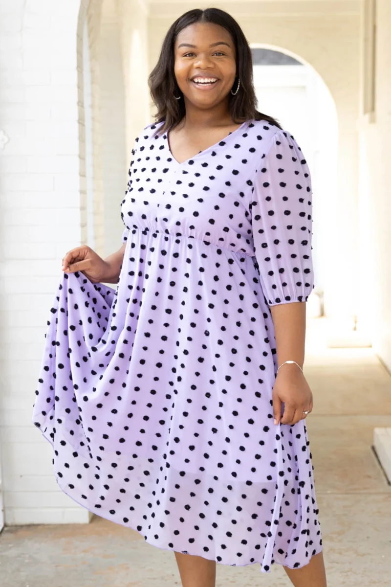 Don’t pass by this gorgeous dress! This dress has a soft, lavender color and a trendy raised polka dot pattern that is super sweet! The flowy fit and stretchy waistline is perfect for all day wear! Whether you are headed on a date night or brunch date with the girls this dress is perfect for every occasion! Style this beauty with some heels or wedges for a sassy chic look!Â