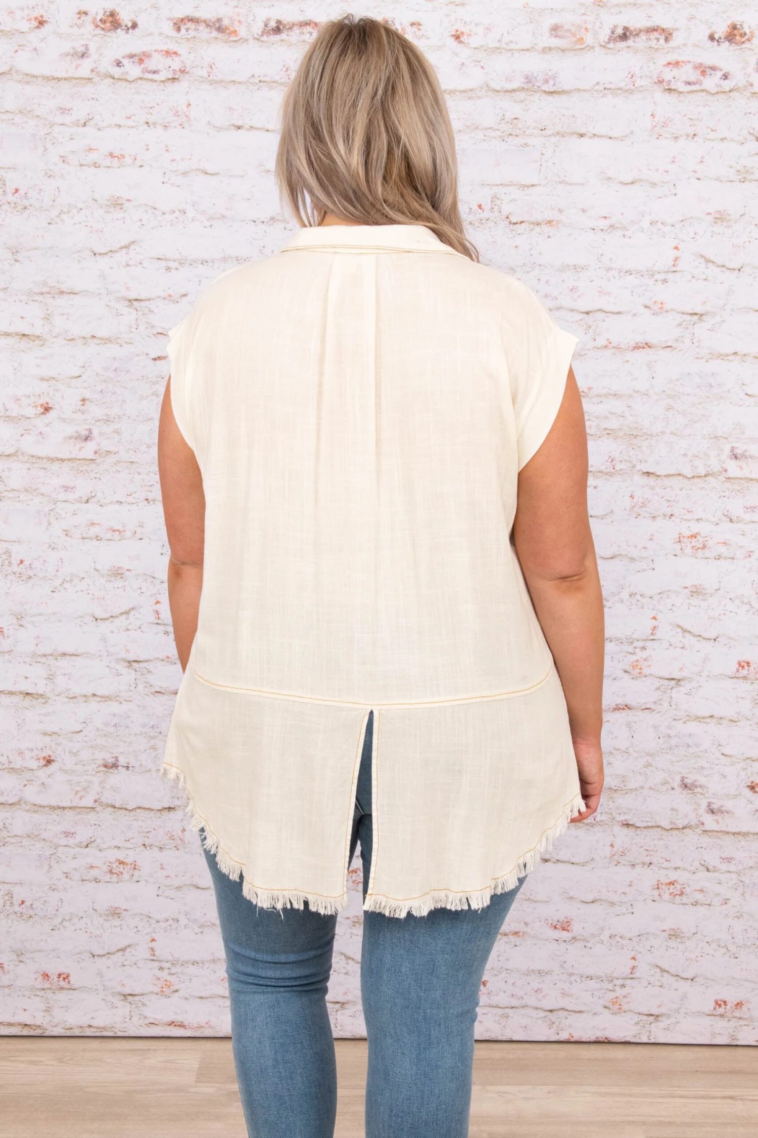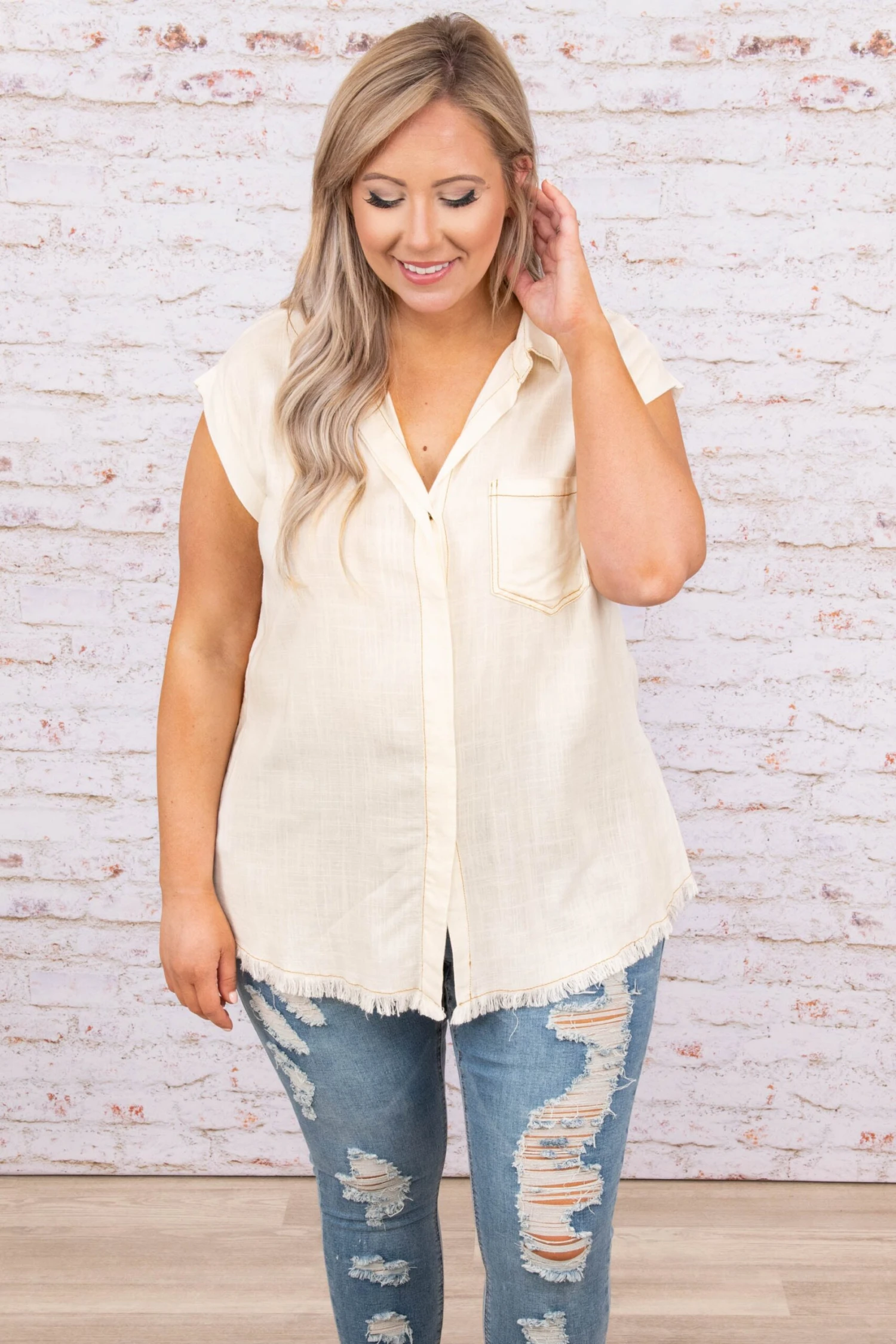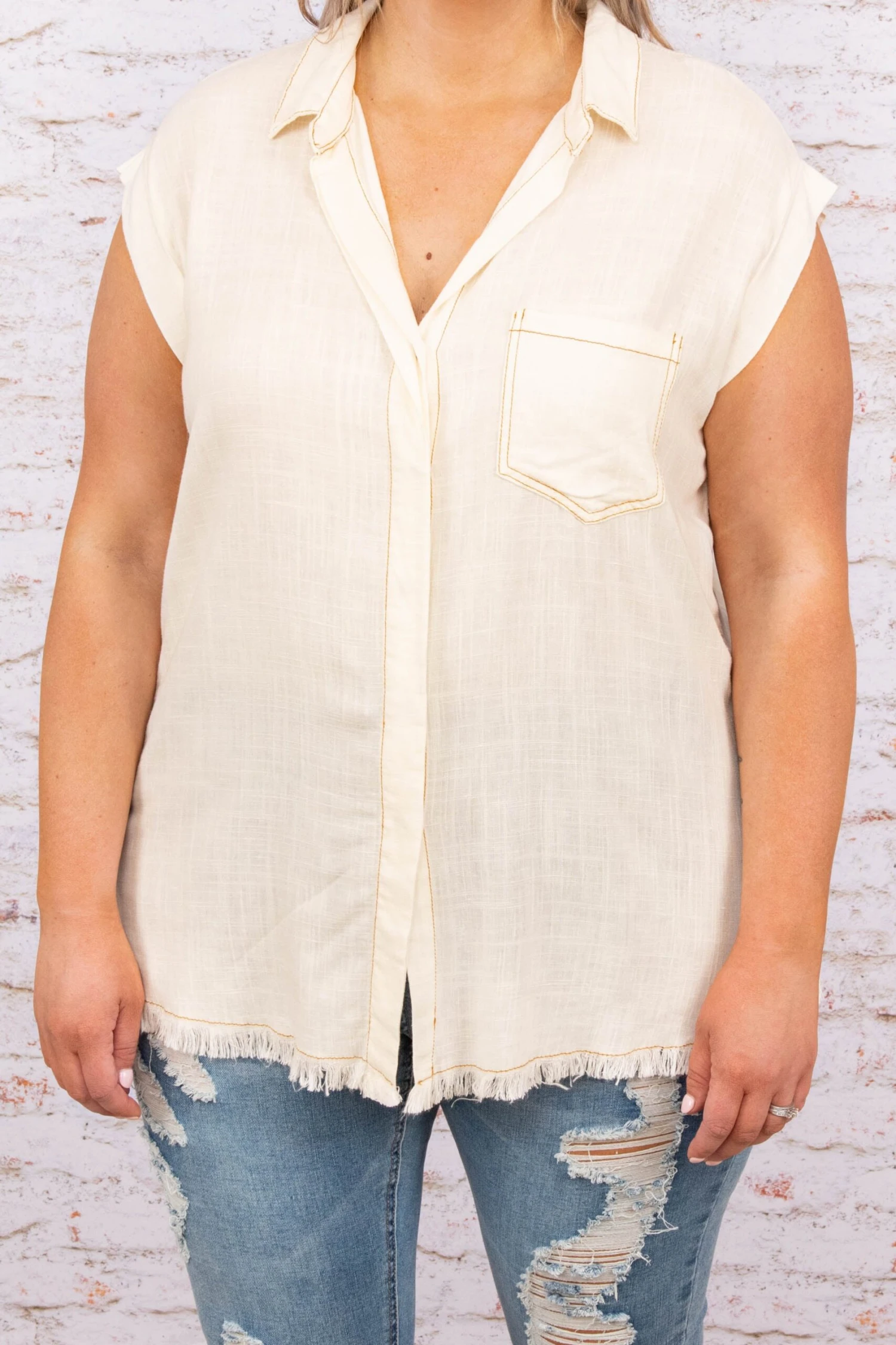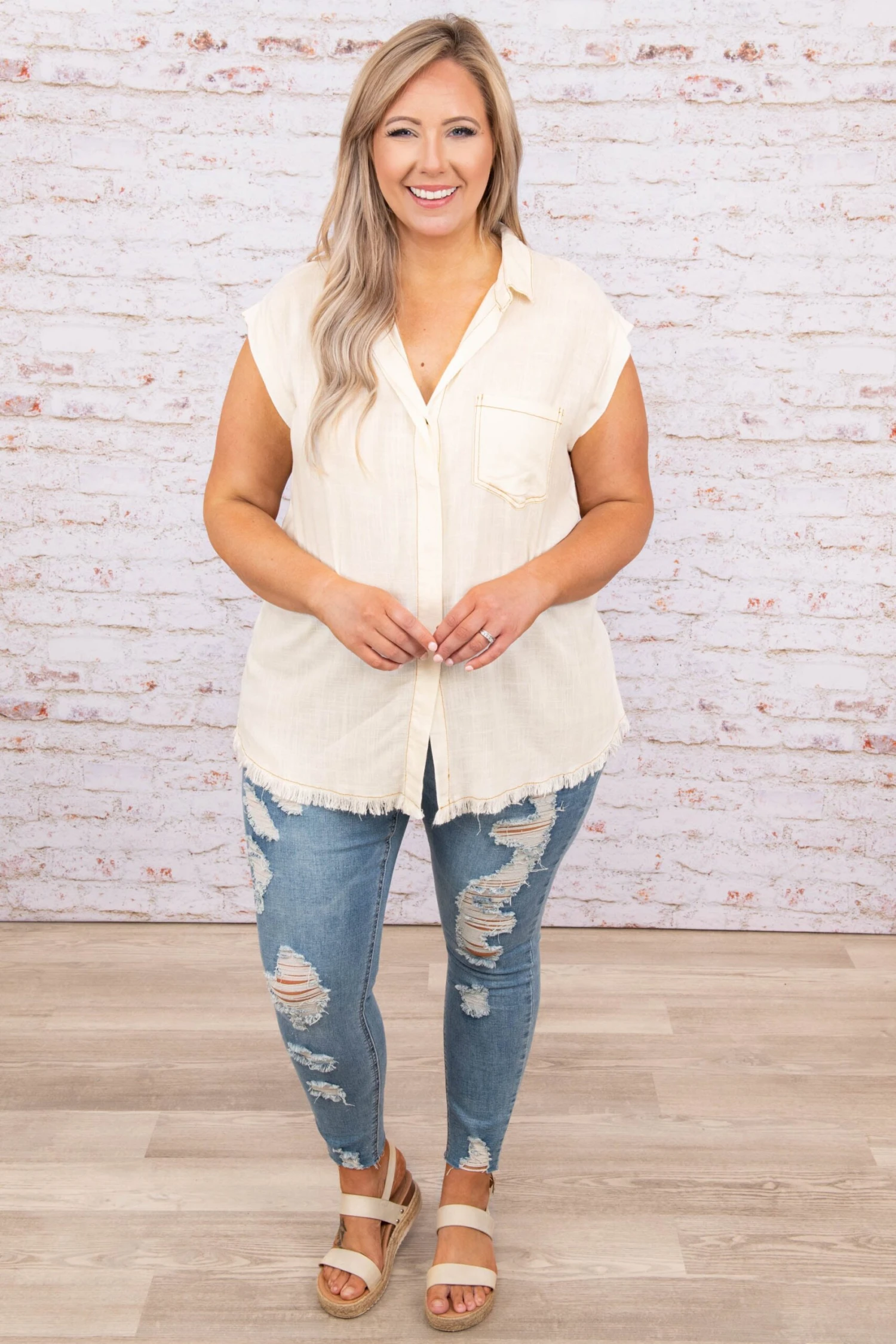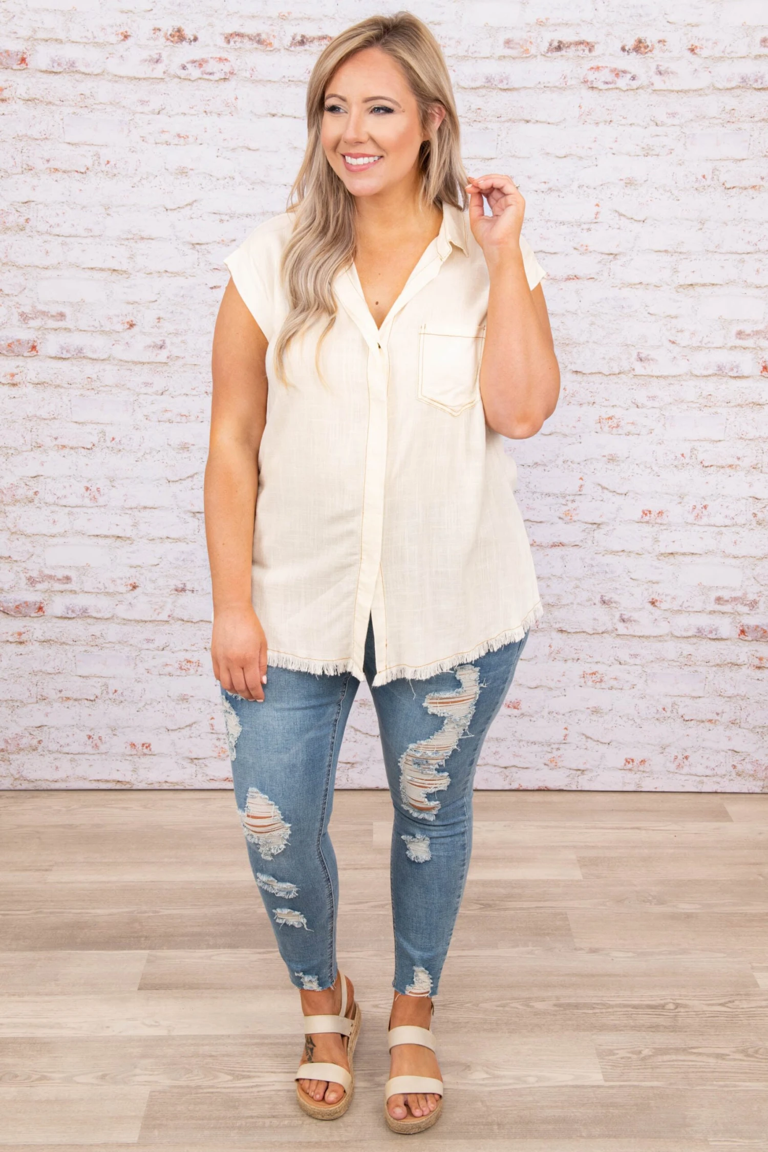 This is the top of your dreams! It has a flirty and feminine design with a figure-flattering fit you’ll want to wear all day long! It’s light and flowy to keep you cool on warm summer days and has the cutest frayed details! Not to mention how easy the solid ivory color is to pair with your favorite shoes and accessories! Style this top with skinnies and wedges for an effortlessly chic look!