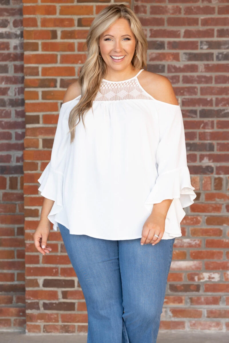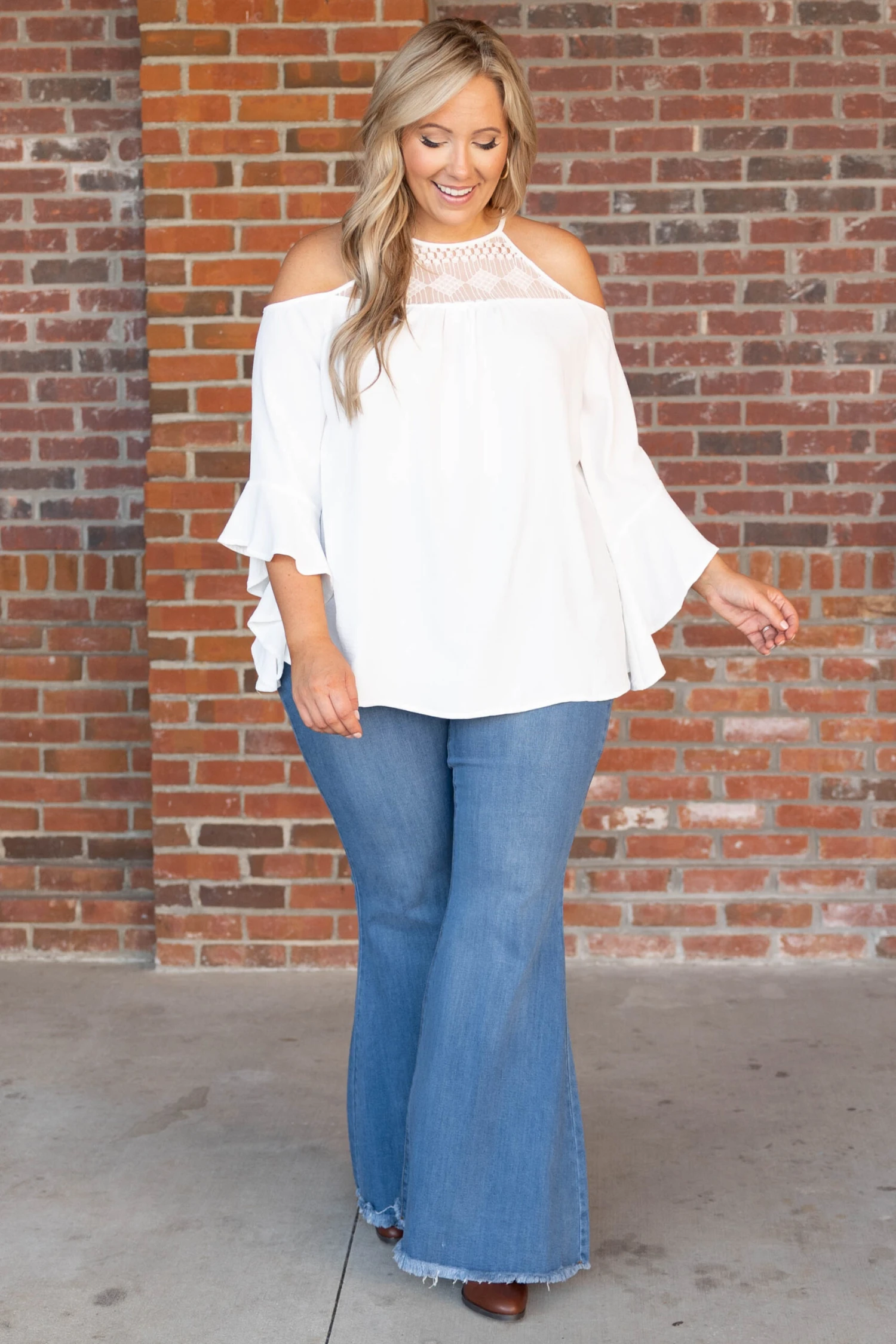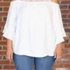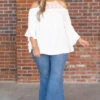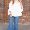 You’ll want to wear this top on your next romantic adventure! We love the cold shoulder, white color, and sweet ruffle detail! Plus, it’s SO soft and comfy! Wear it to your next outing with flare jeans and booties for a super trendy outfit!