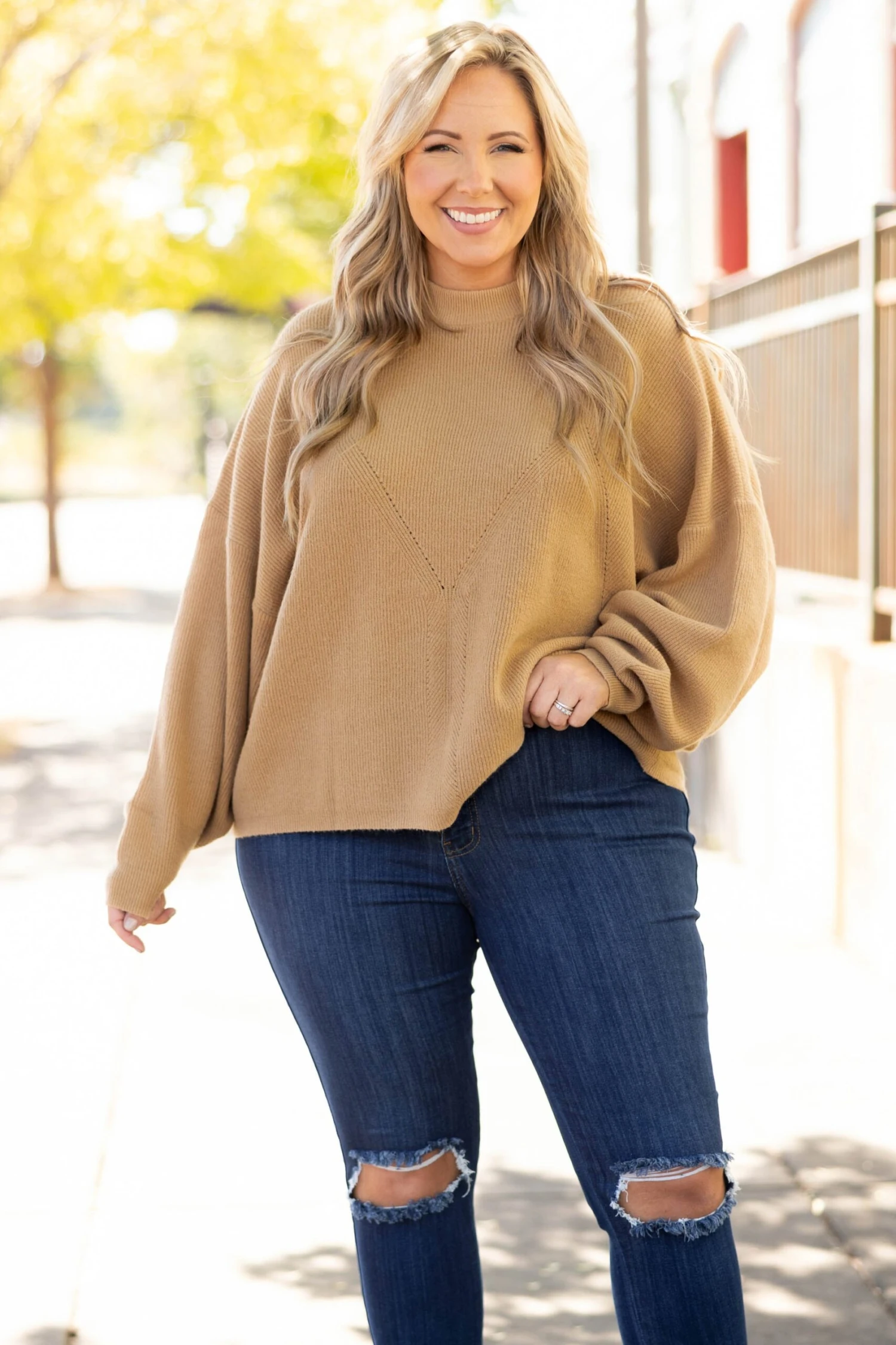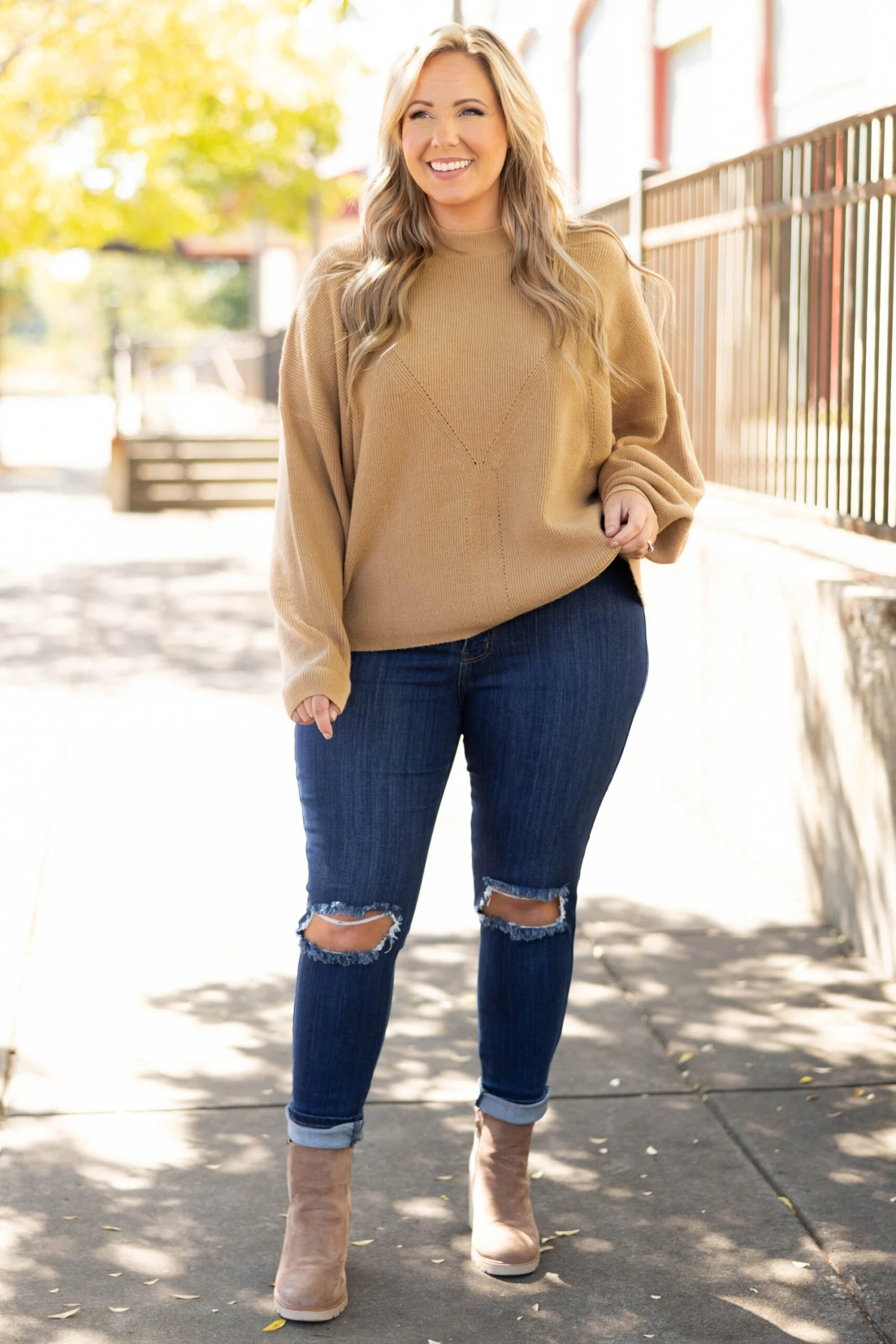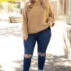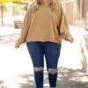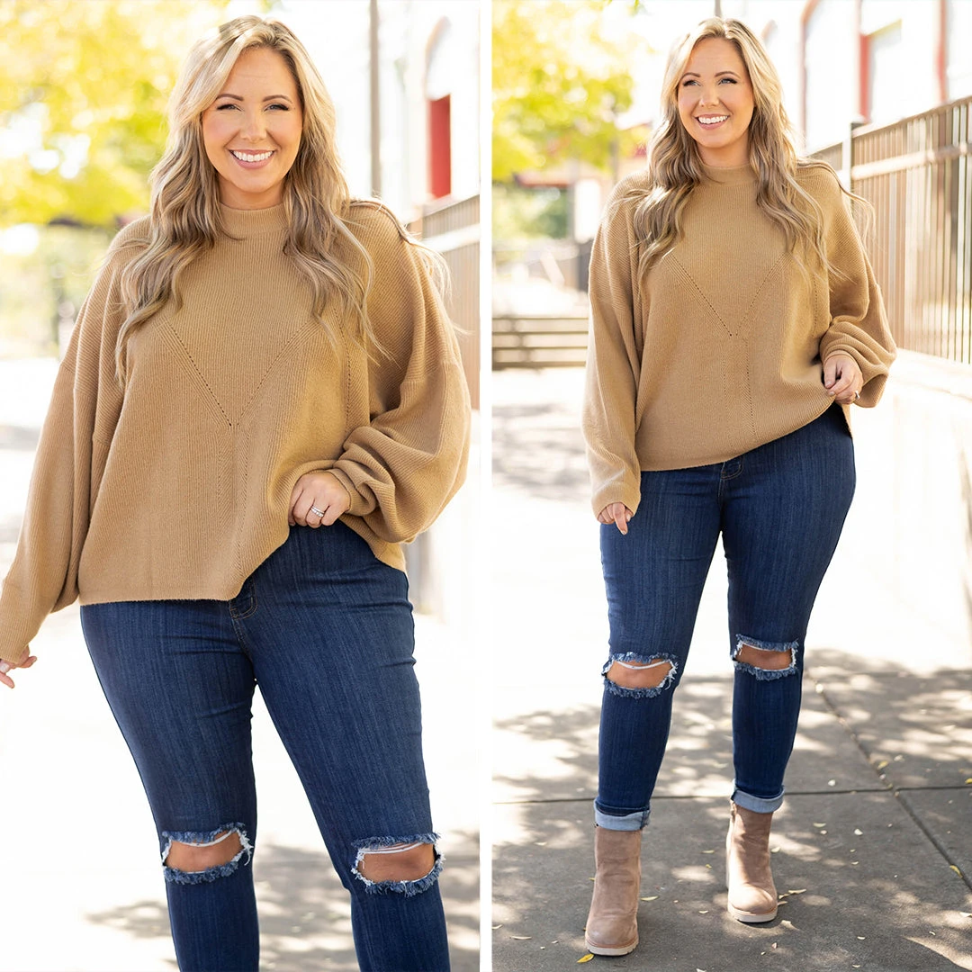 If you are looking for the perfect sweater for the season, your search is over! This sweater has a neutral camel color and a cozy, figure flattering fit that is perfect for the season! It has a textured feel and bubble sleeves that are so sweet! Style this sweater with some distressed skinnies and booties for a classic chic look!
