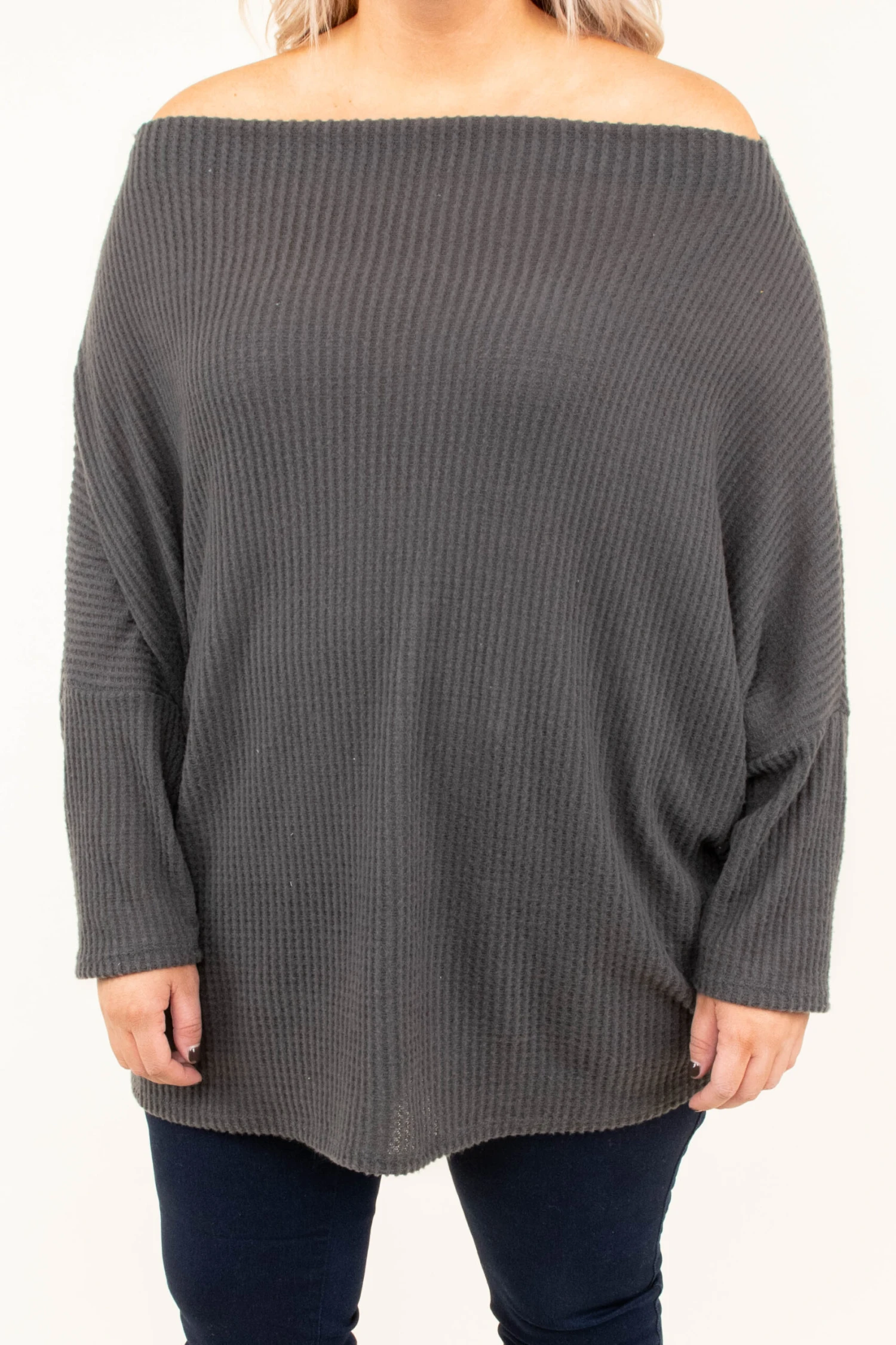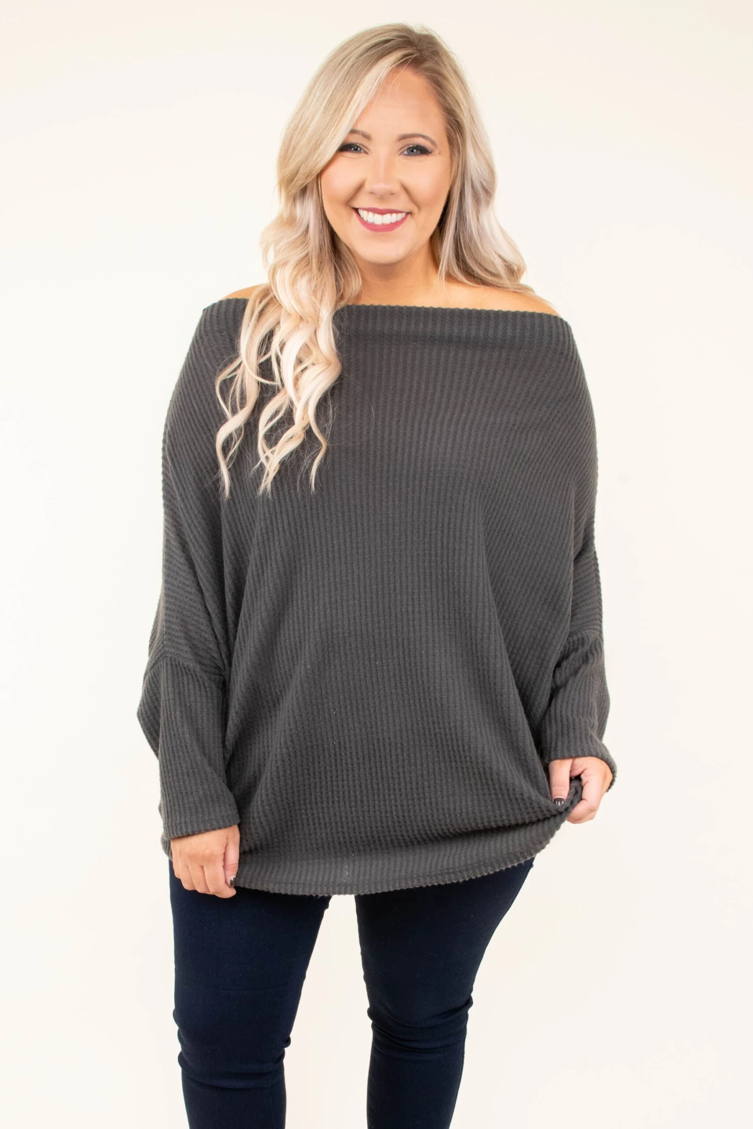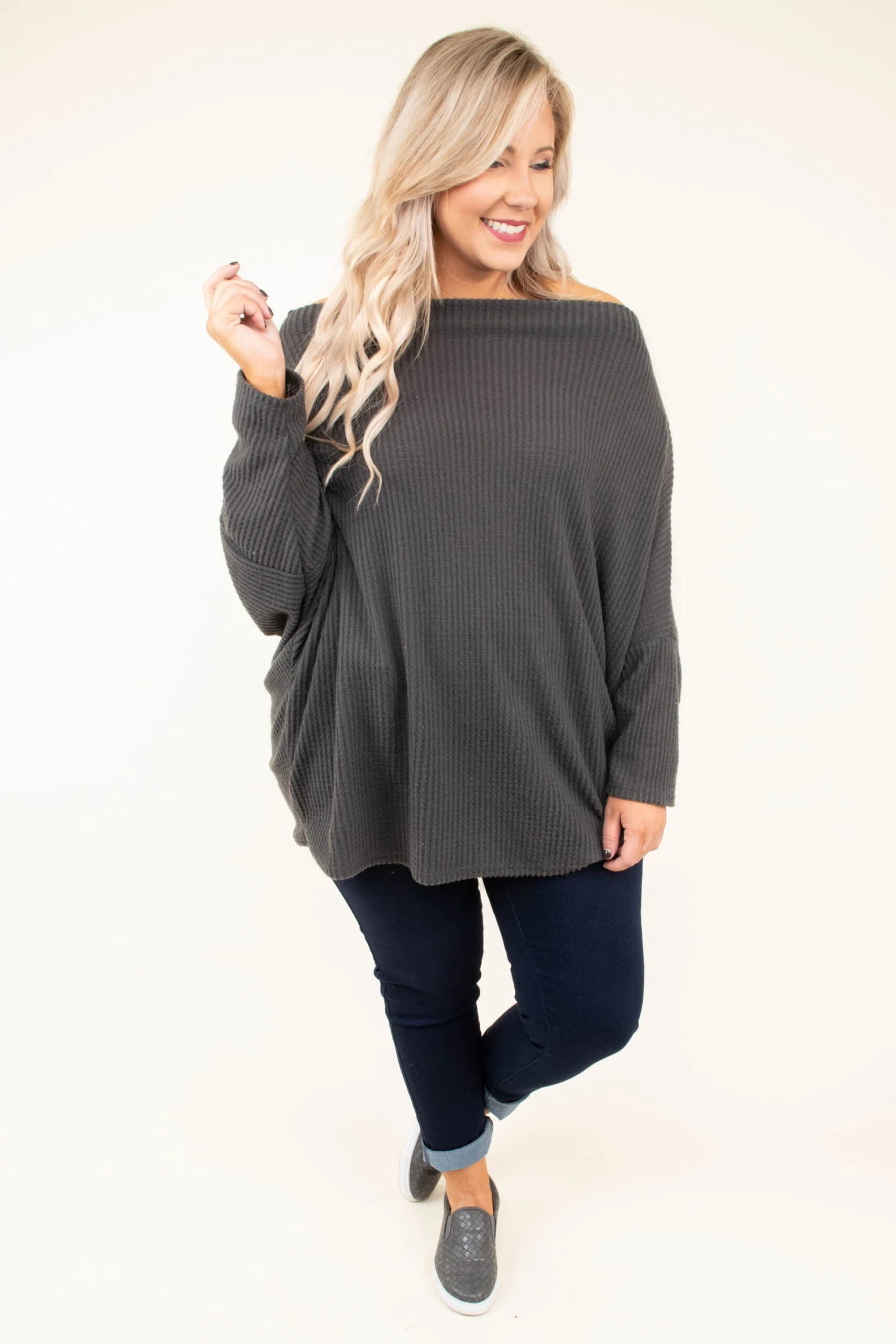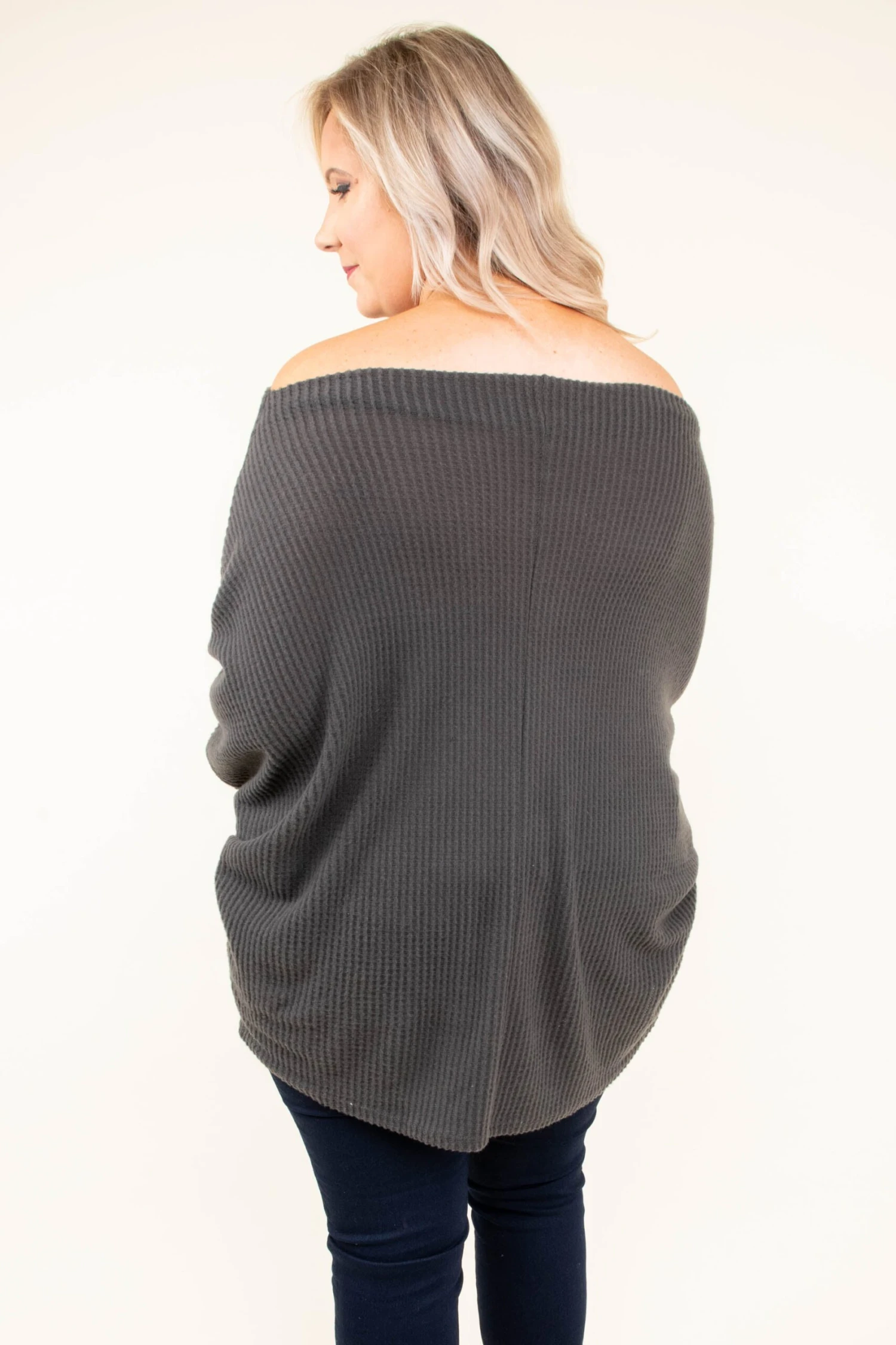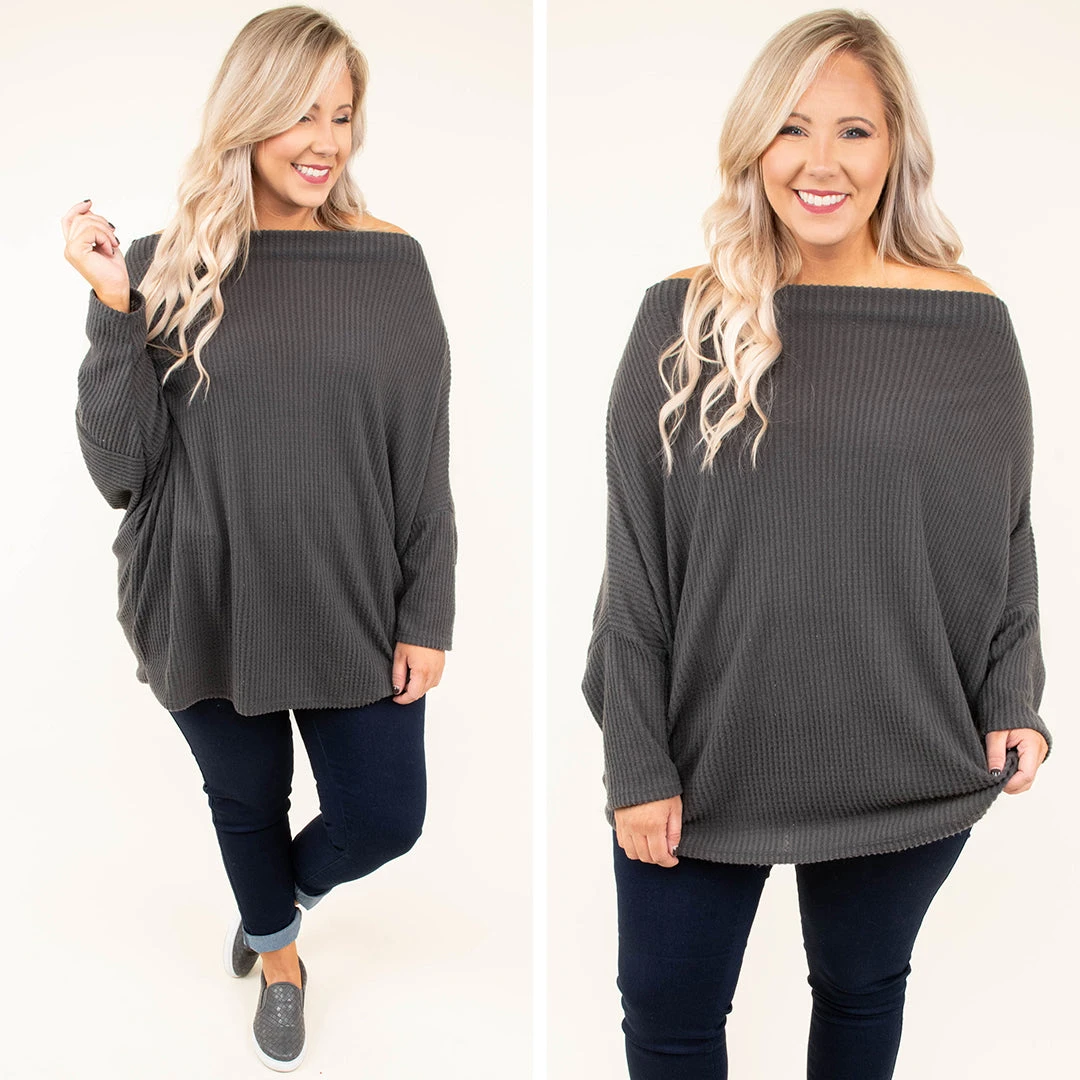 Expect a second date after he sees you in this sweater! This sweater has a classic charcoal color you can dress up or down and style with your favorite shoes and accessories! It’s comfortable for all day wear, has a relaxed fit to flatter your figure, and can even be worn off the shoulder for the ultimate trendy look! Simply style this sweater with skinnies and booties for an effortlessly chic outfit!