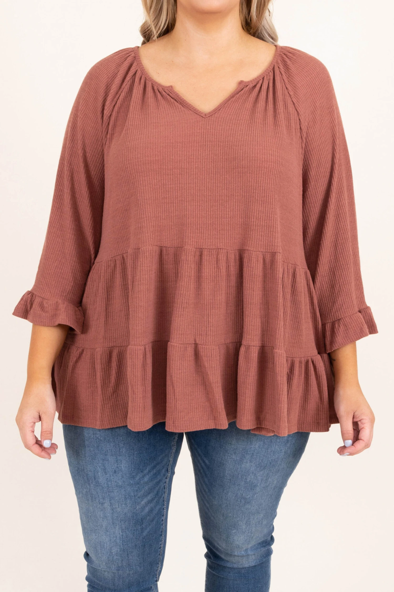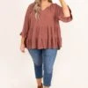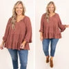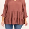 We would love to see you in this beautiful top! This top has a flowy, figure flattering style and soft rust color that are perfect for the season! Style this top with some skinnies and booties for a classic, trendy look!Â