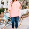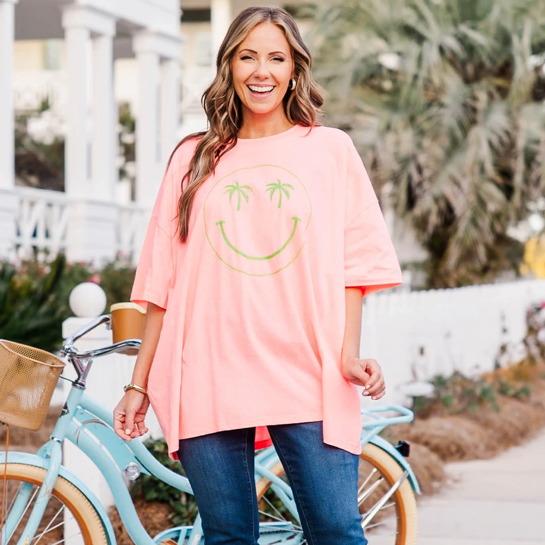 We can see you in this cute-tee! This adorable boyfriend tee features a smiley graphic and a vibrant neon coral pink color! With its oversized fit, this tee is both stylish and comfortable! Perfect for adding a pop of color to your wardrobe!