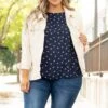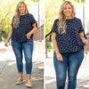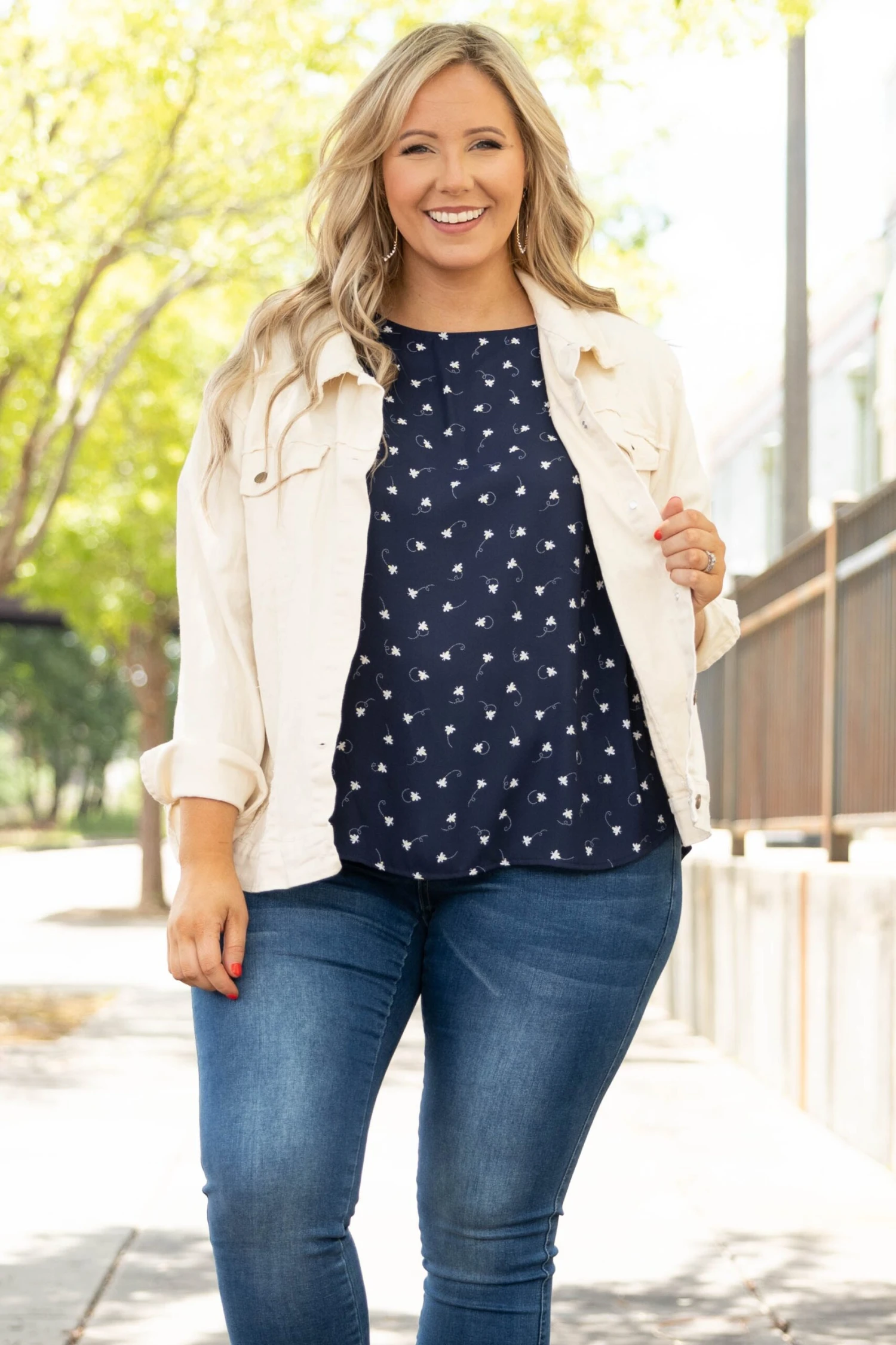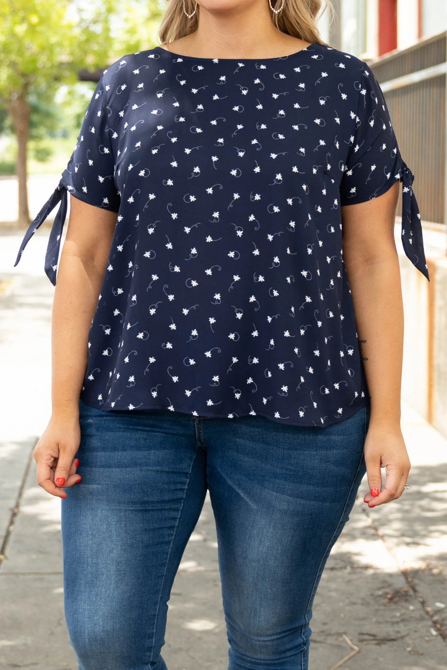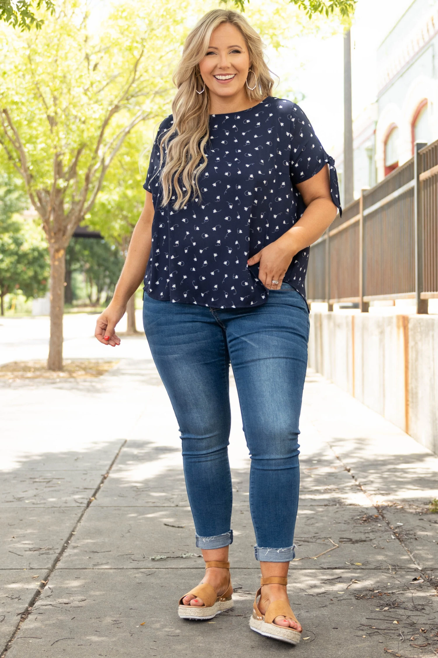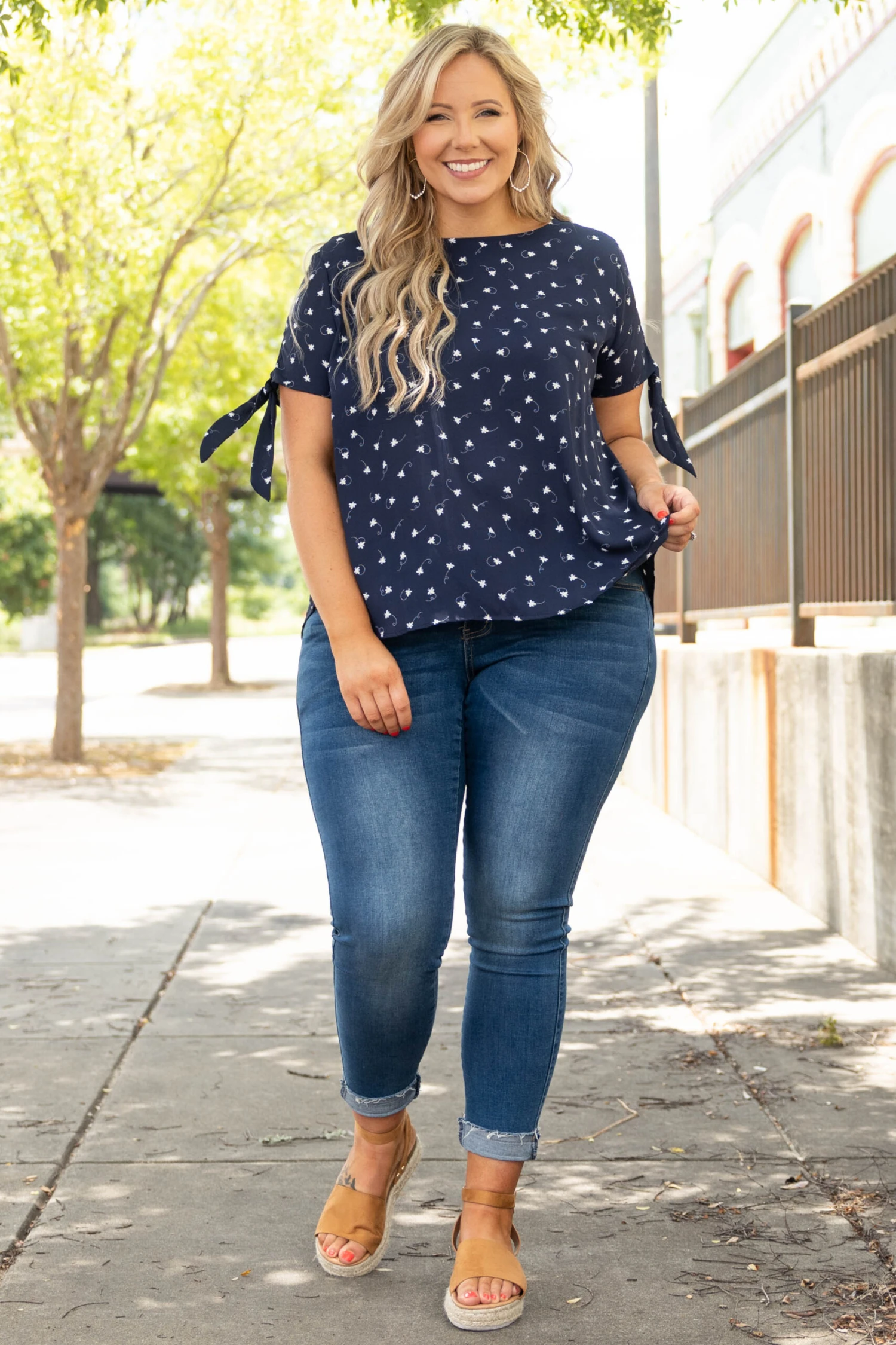 This top will have you looking sew in style! The navy color is classic and the cute firefly pattern is so unique! We love the tie details on the sleeves! This cutie is perfect for a day in the office or just being out on the town! Style this with some skinnies and sandals for a super stylish look!