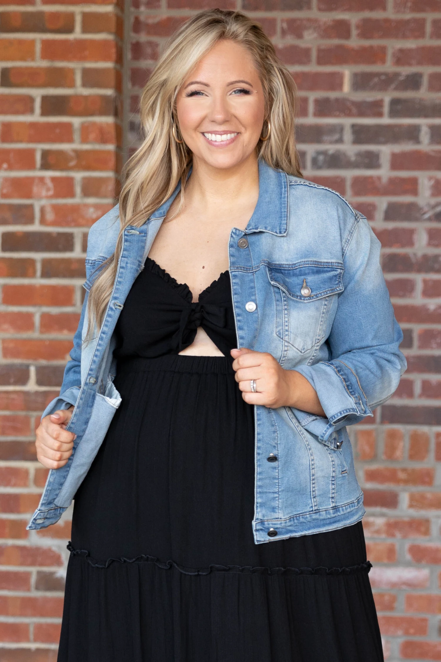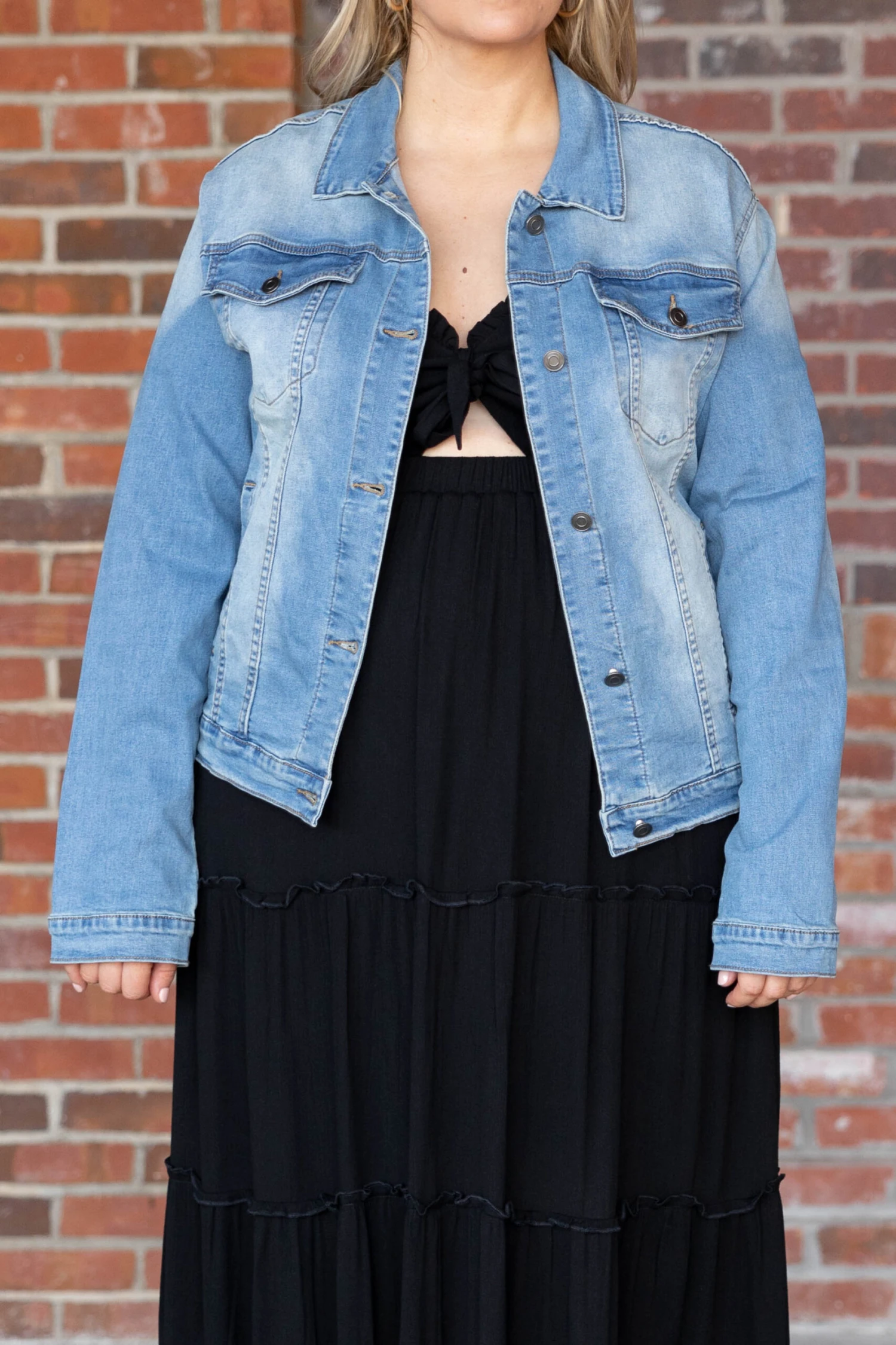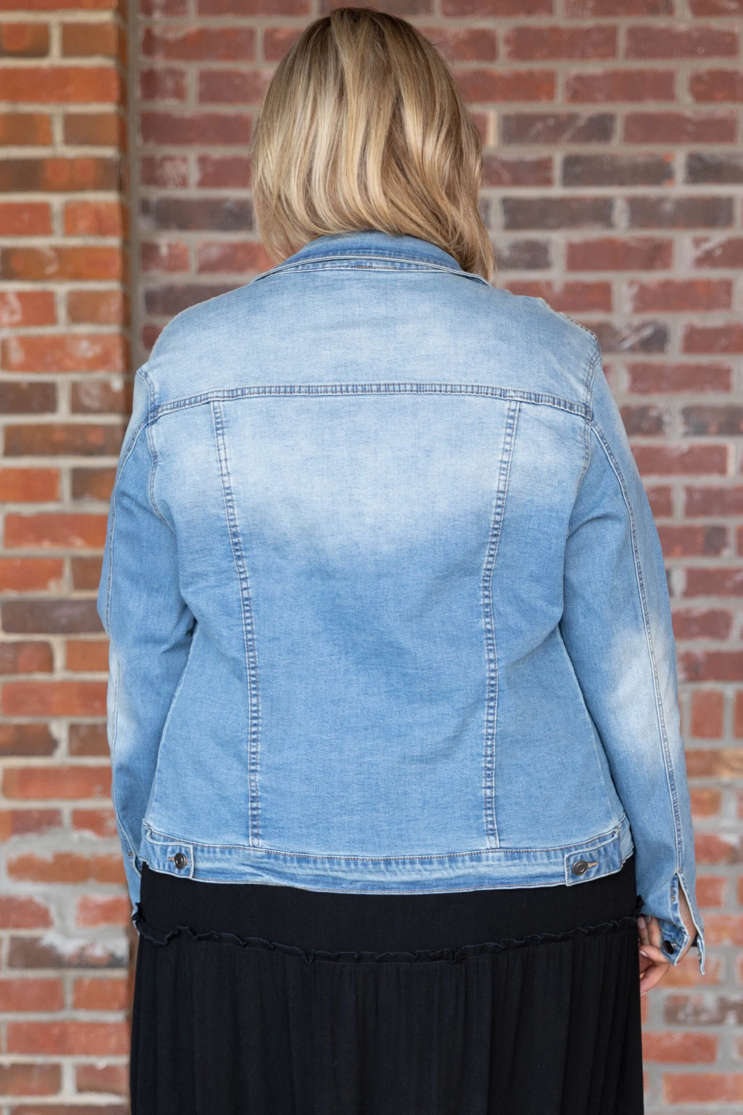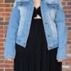 We want to share the news about this gorgeous jacket! This lovely button-down jacket has a medium wash and is comfortable to wear all day! You can style this jacket with all your favorite outfits for a trendy, chic look this season!Â