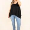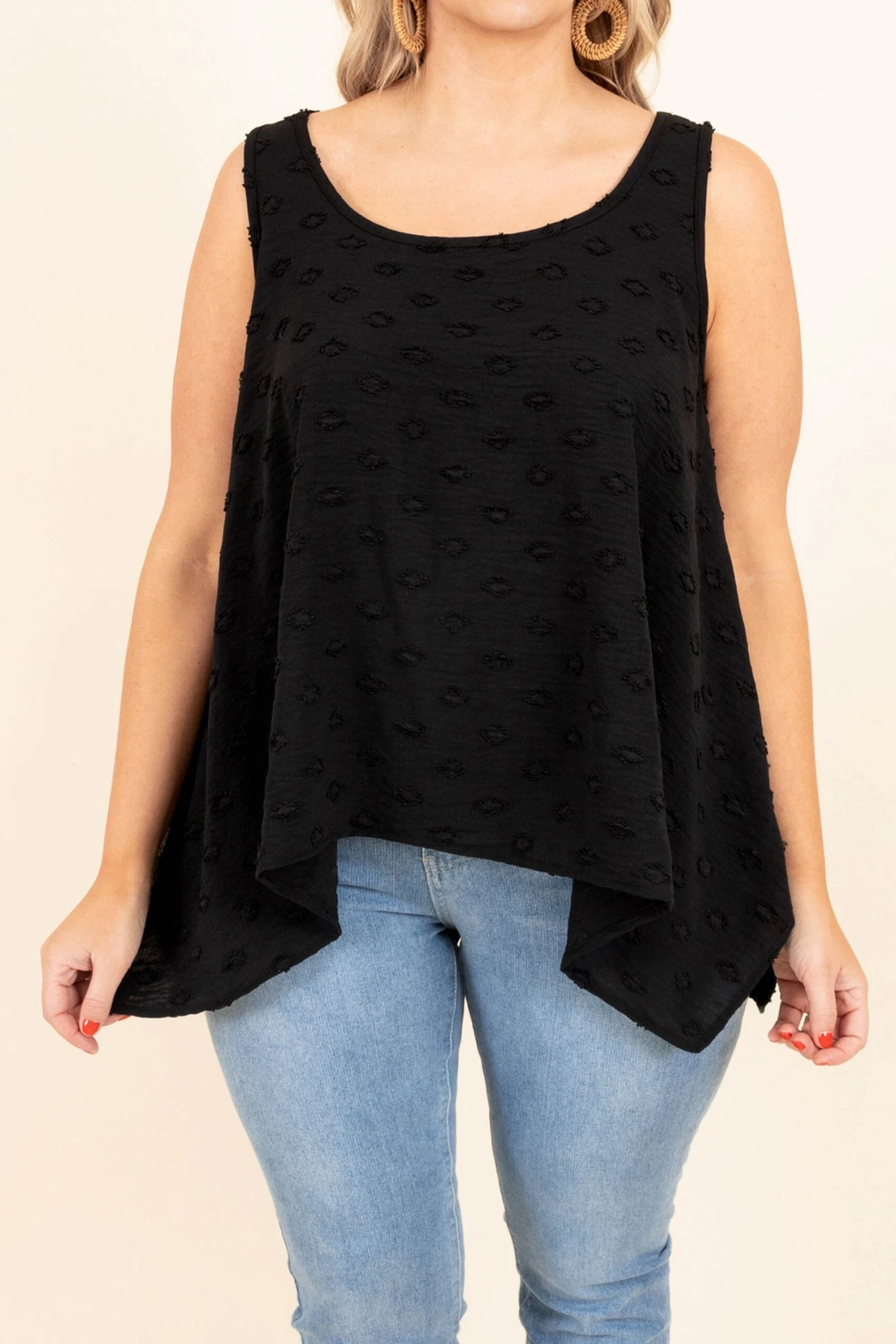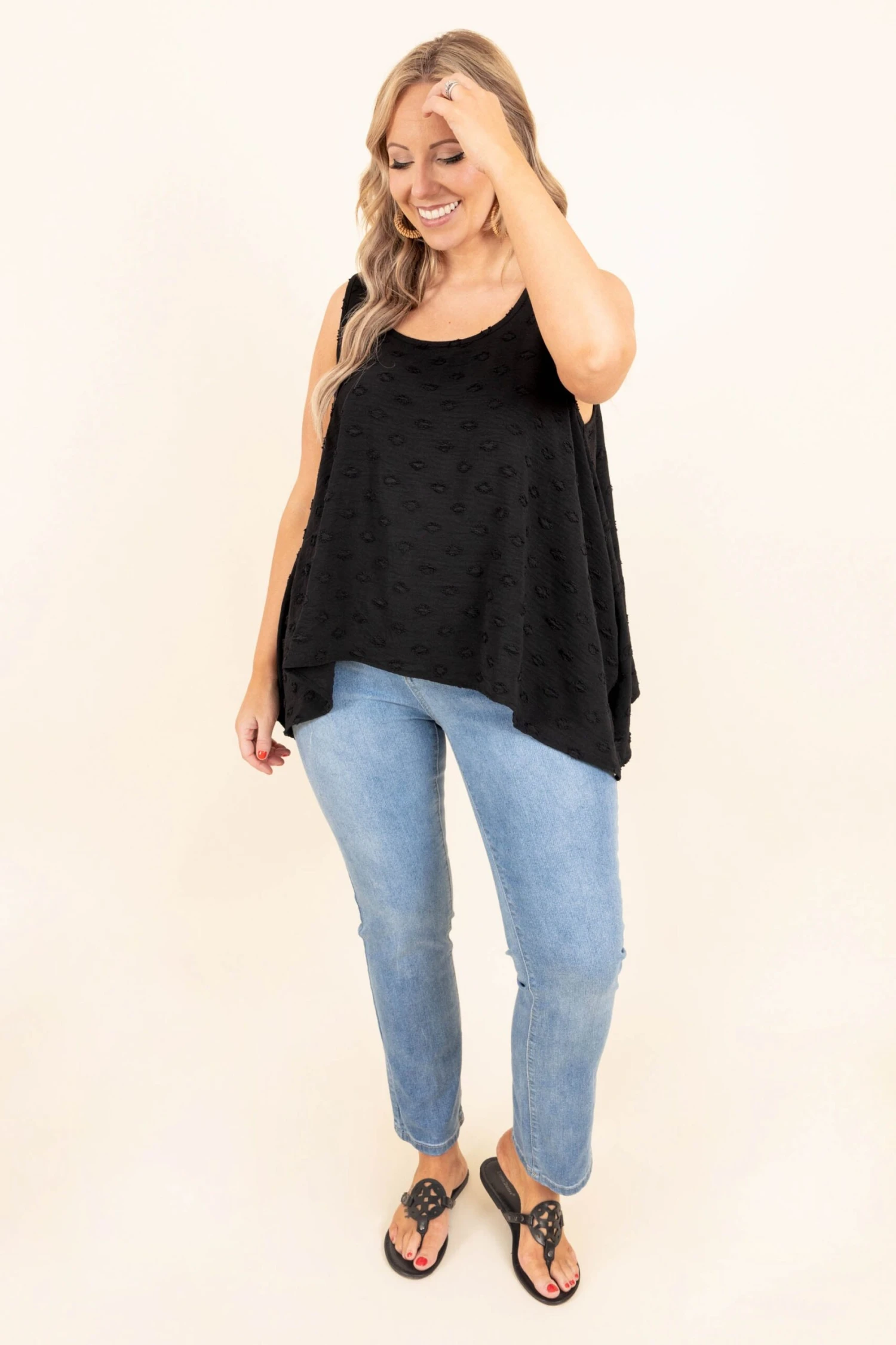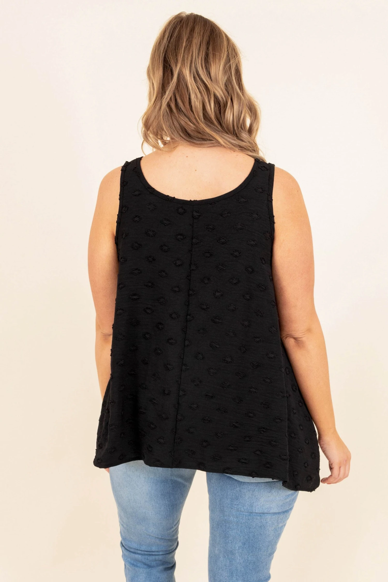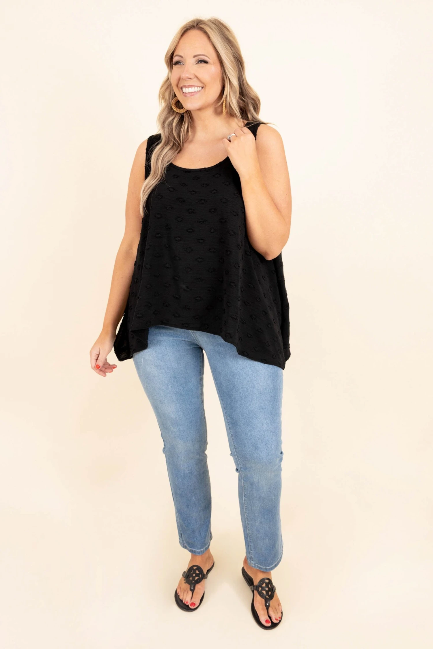 This beauty can be all yours in just a few clicks! This tank has a neutral black color that is so easy to pair with all of your favorite cardigans and jeans! The raised polka dot pattern is a season fave! Style this tank with skinnies and sandals for an every day chic look!