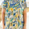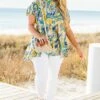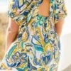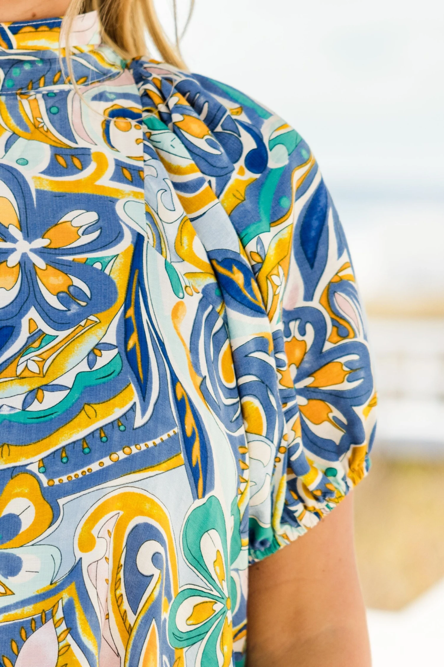 Add a touch of fun to your wardrobe with this top in a vibrant blue color! The floral paisley print adds a pop of color, while the elastic puff sleeves and tie back provide comfort and style! Perfect for any occasion, this top is a must-have for any fashion-forward woman!