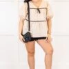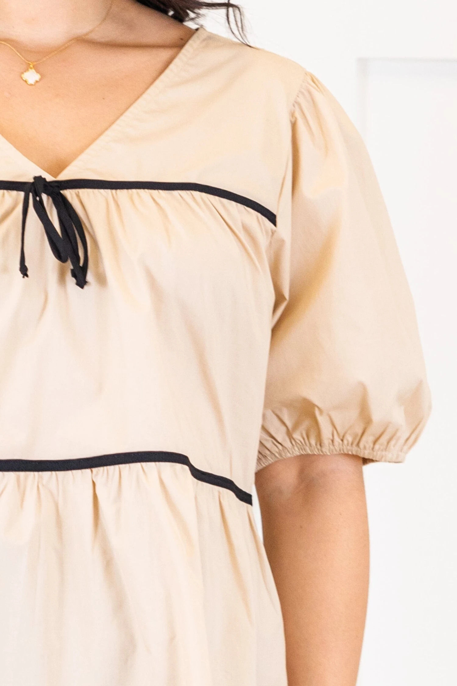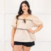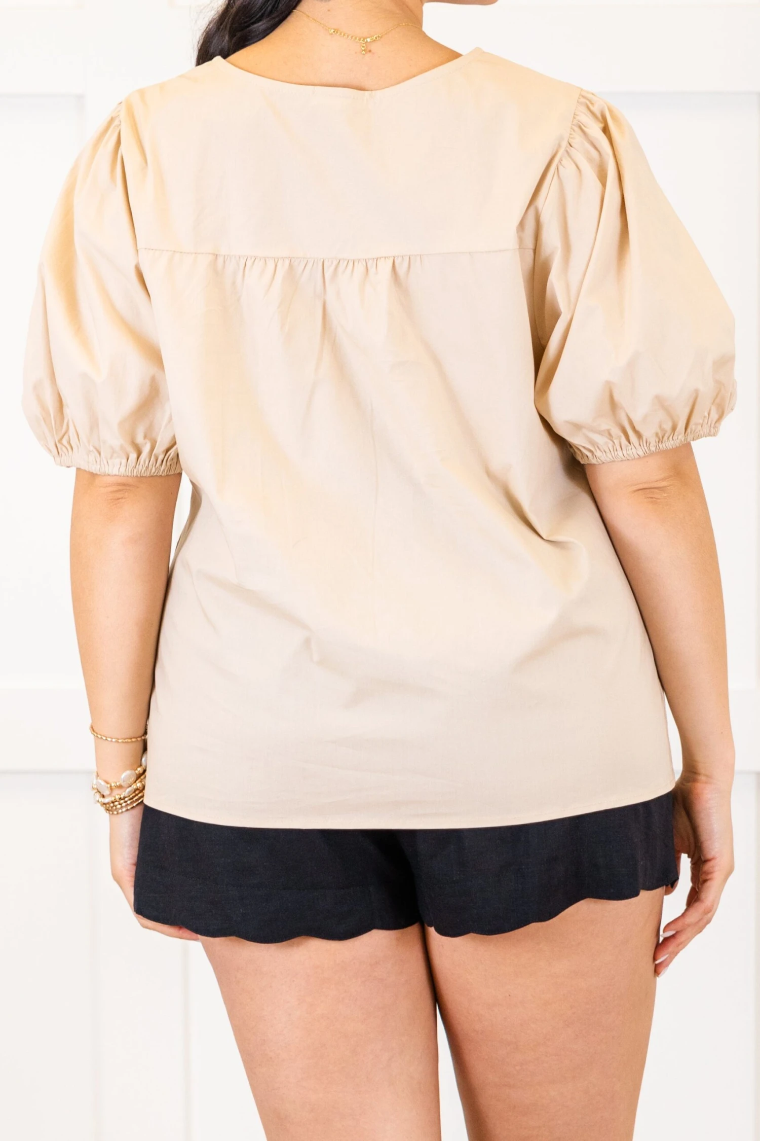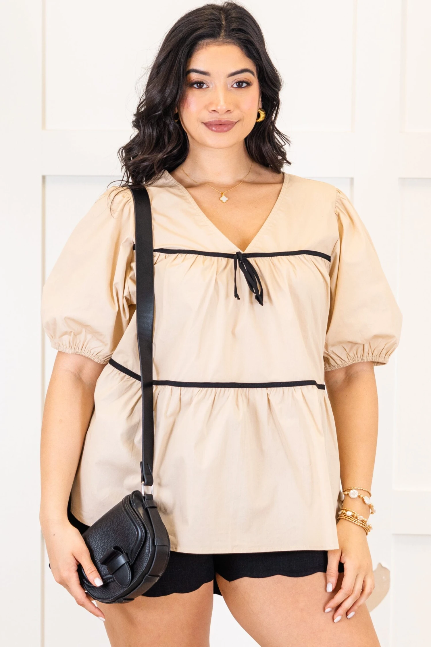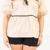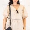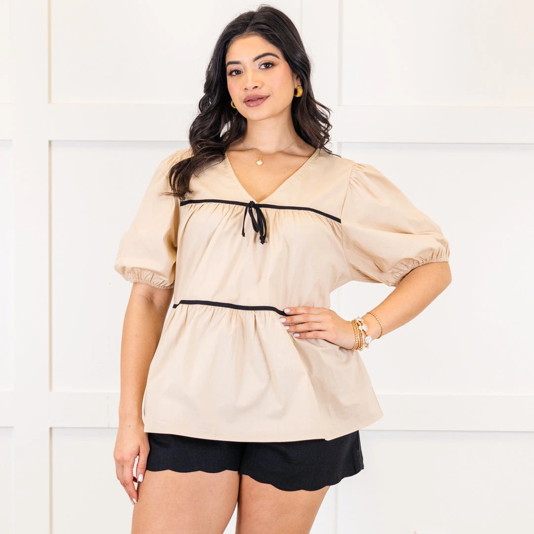 Elevate your wardrobe with this top in taupe, featuring a babydoll silhouette and delicate black pinstripe detailing! Complete with a charming bow accent and v-neckline, this top exudes sophistication and femininity! The elastic puff sleeves add a touch of luxury, making it the perfect addition to your collection!