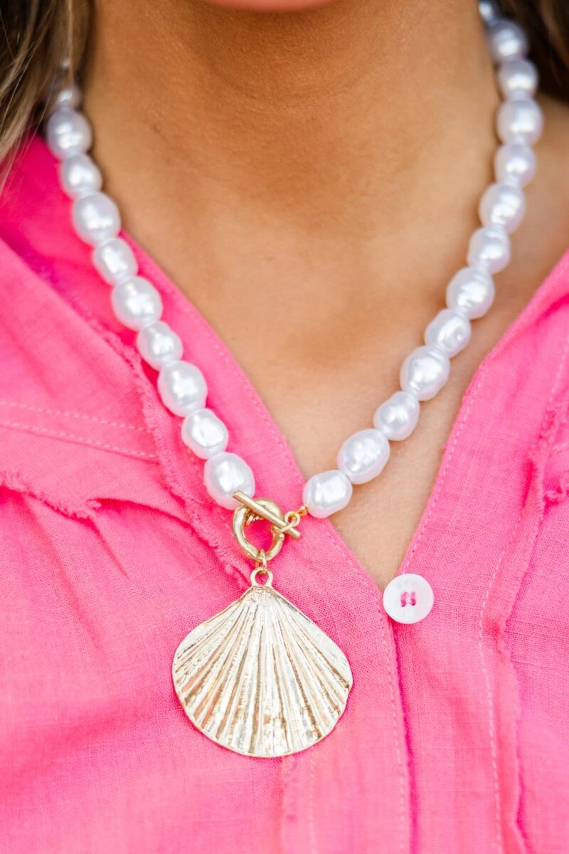 Add some playful charm to your wardrobe with this necklace! This unique piece features a gold shell pendant adorned with lustrous pearls, sure to make a statement! Plus, the lobster claw clasp ensures a secure fit! Perfect for any fashionista looking to stand out!