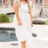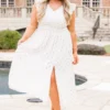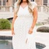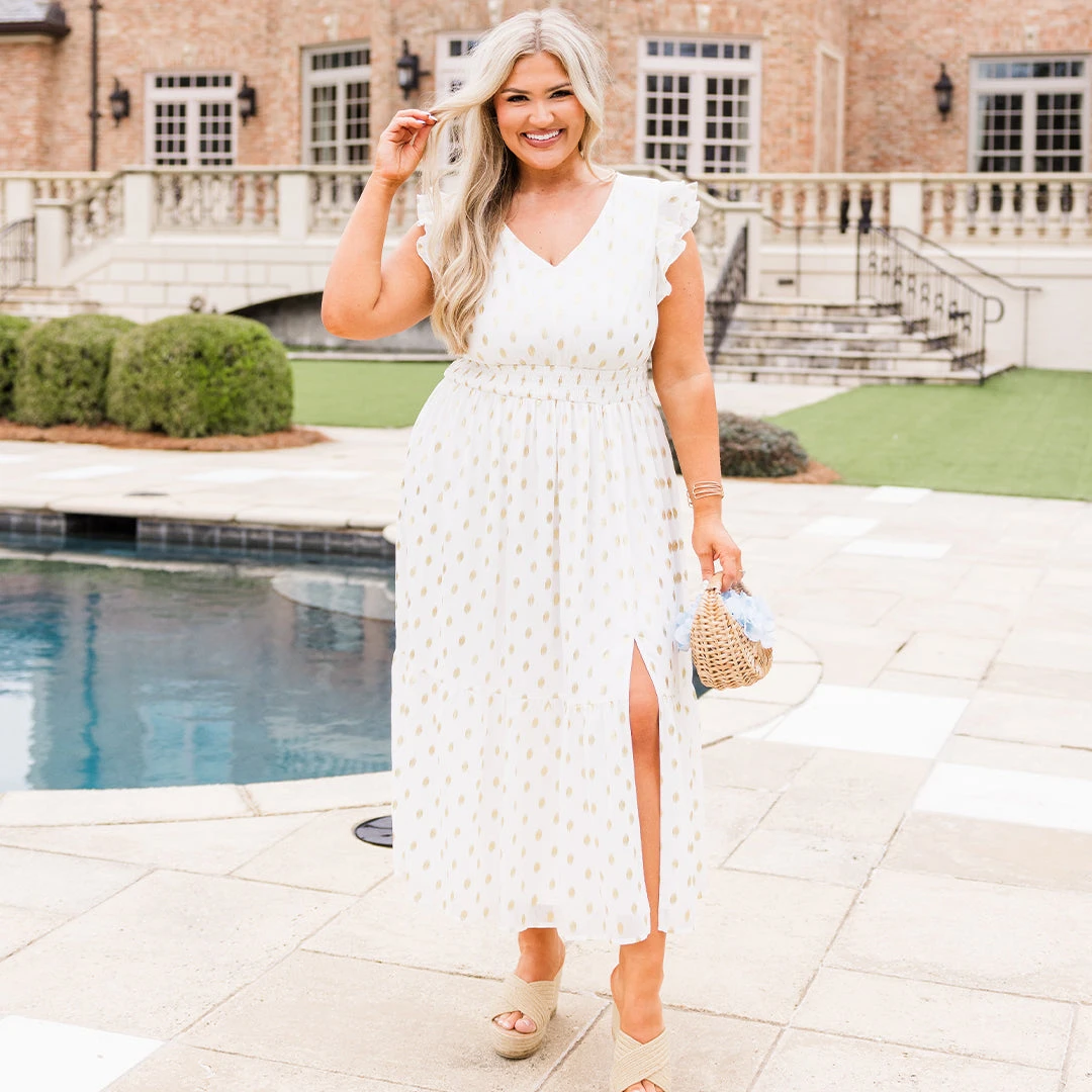 Shine like the star you are in this lovely dress! It was designed with a smocked waistline and flutter sleeves, and it offers a flowy, flirty fit! The gold polka dot pattern adds a touch of elegance, while the front split adds a playful touch! Perfect for any occasion, this dress will have you ready to conquer the day!