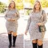 Show off your body in this dress! This dress has a beautiful polka dot leopard pattern with a bold taupe brown color perfect for demanding attention when you walk into the room! It is comfortable for all-day wear and has a classic hugging figure-flattering fit making it perfect for any and every occasion! Style this dress with any shoe and some accessories for the perfect chic look!