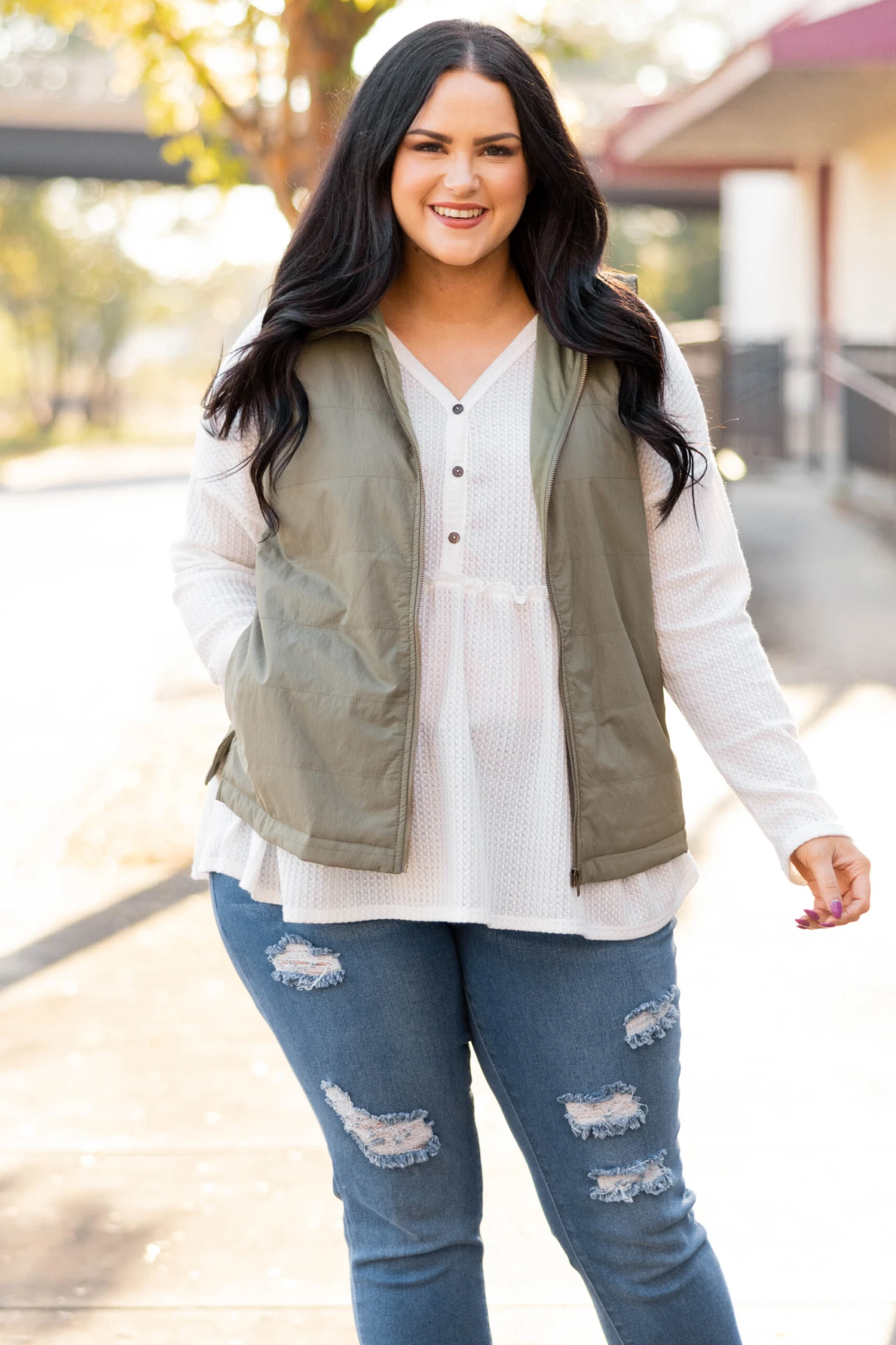 Don’t leave without adding this vest to your cart! The light olive color is easy to dress up or down and can be styled with everything in your wardrobe! It’s comfortable, figure-flattering, and has a trendy design you can wear all season long! Pair this vest with a patterned top and skinnies for an effortlessly trendy look!