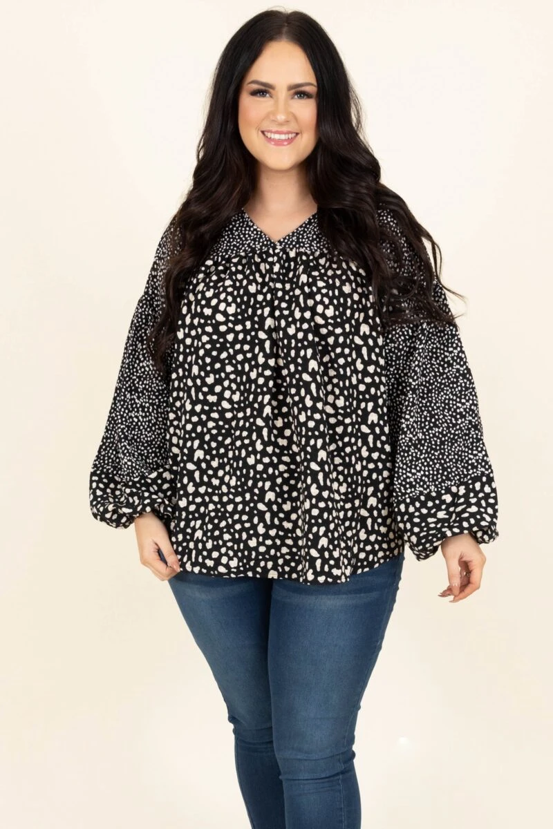 No need to be shy in this cutie! This top has a neutral, black color and a trendy leopard pattern that is just in time for the season! The stretchy, textured material is great for all day wear! Pair this top with some skinnies and booties for a casual chic look!