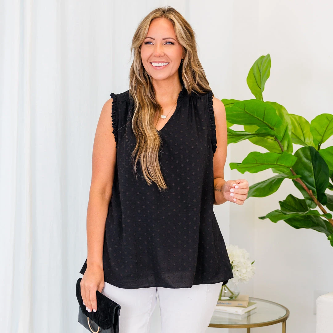 This tank is sure to be come one of your FAVES! It features a delicate swiss dot design and a neutral black color! This versatile piece can be effortlessly paired with white denim and heels for a classy chic look! With its stylish design and flattering color, this tank is a must-have for your wardrobe!