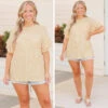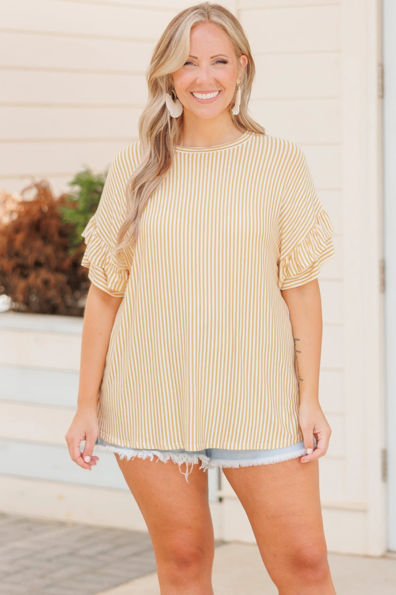 Take a walk in the park in this cutie! This top will give you the perfect look for a summer day out! It’s made with a soft fabric for a comfortable feel, and the beautiful mustard color pairs well with shorts or skinnies! This top also features flutter sleeves and a stripe pattern, creating a flattering silhouette! Get ready to turn heads and make a statement!