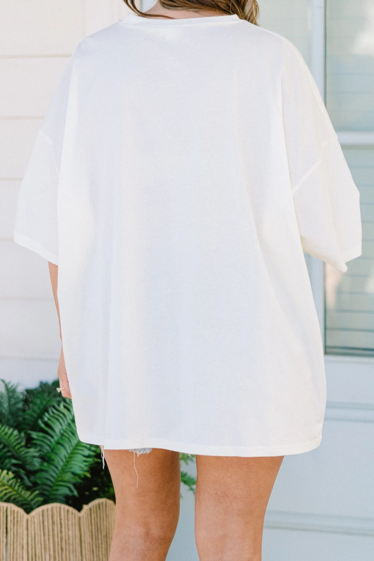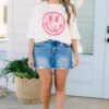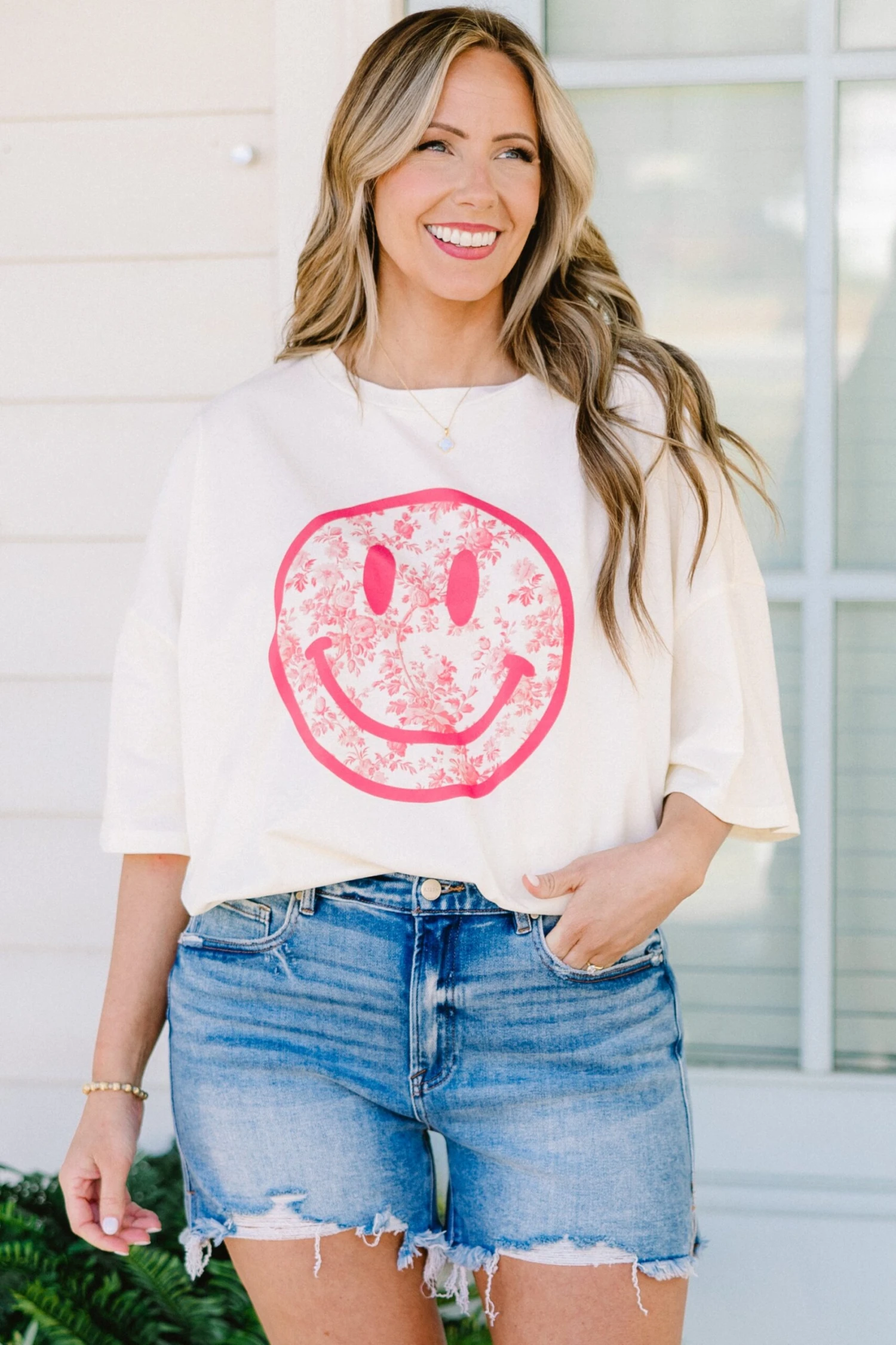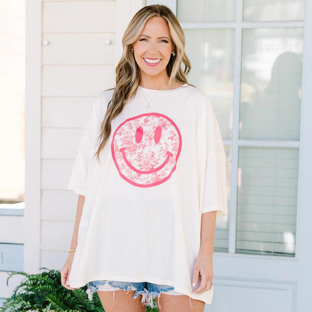 Upgrade your casual wardrobe with this boyfriend tee! This oversized tee features a fun toile smiley face graphic that is sure to bring a smile to your face! Its loose fit provides both comfort and style! Perfect for a day out at the beach or a casual hangout with friends!