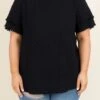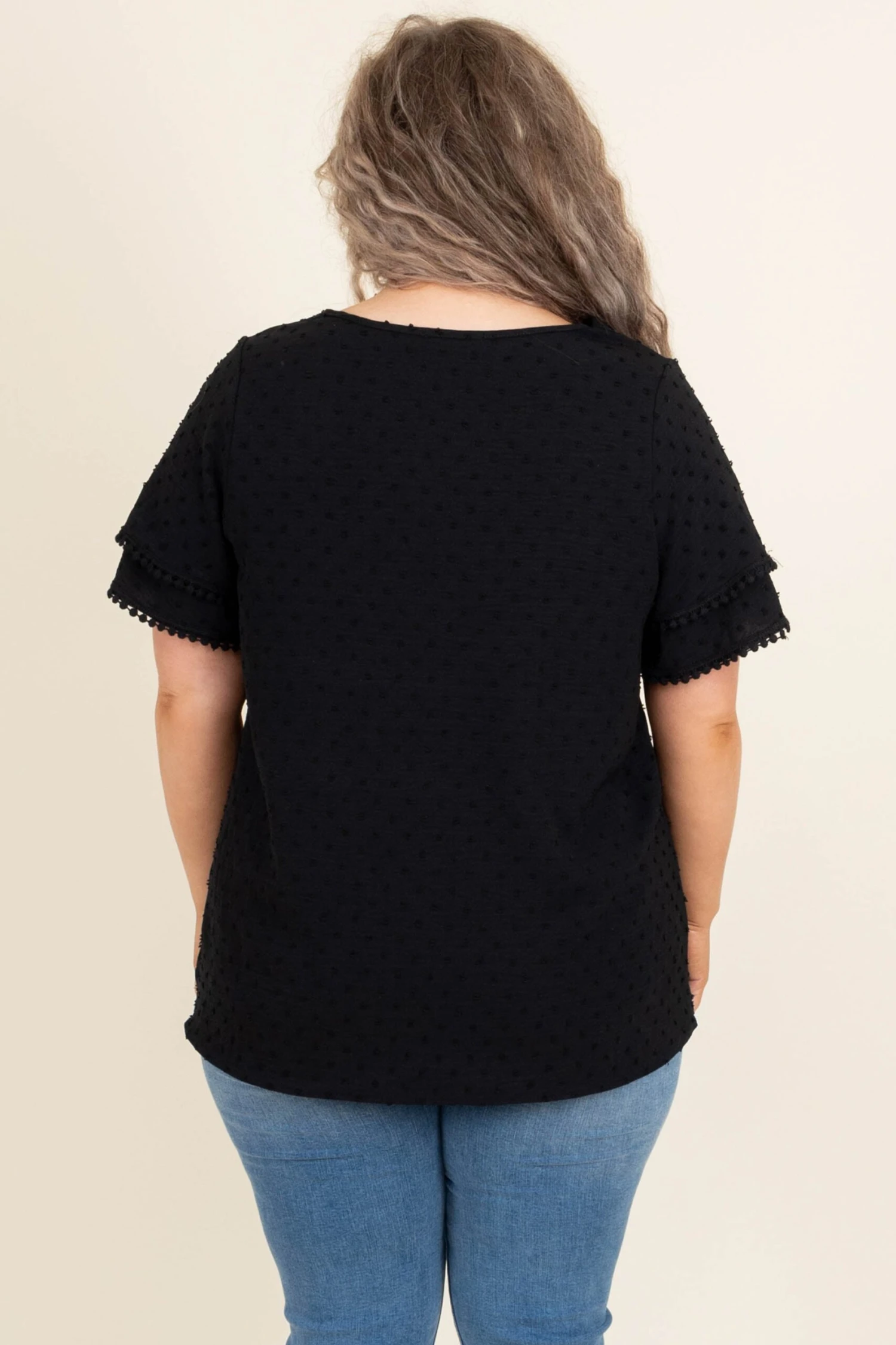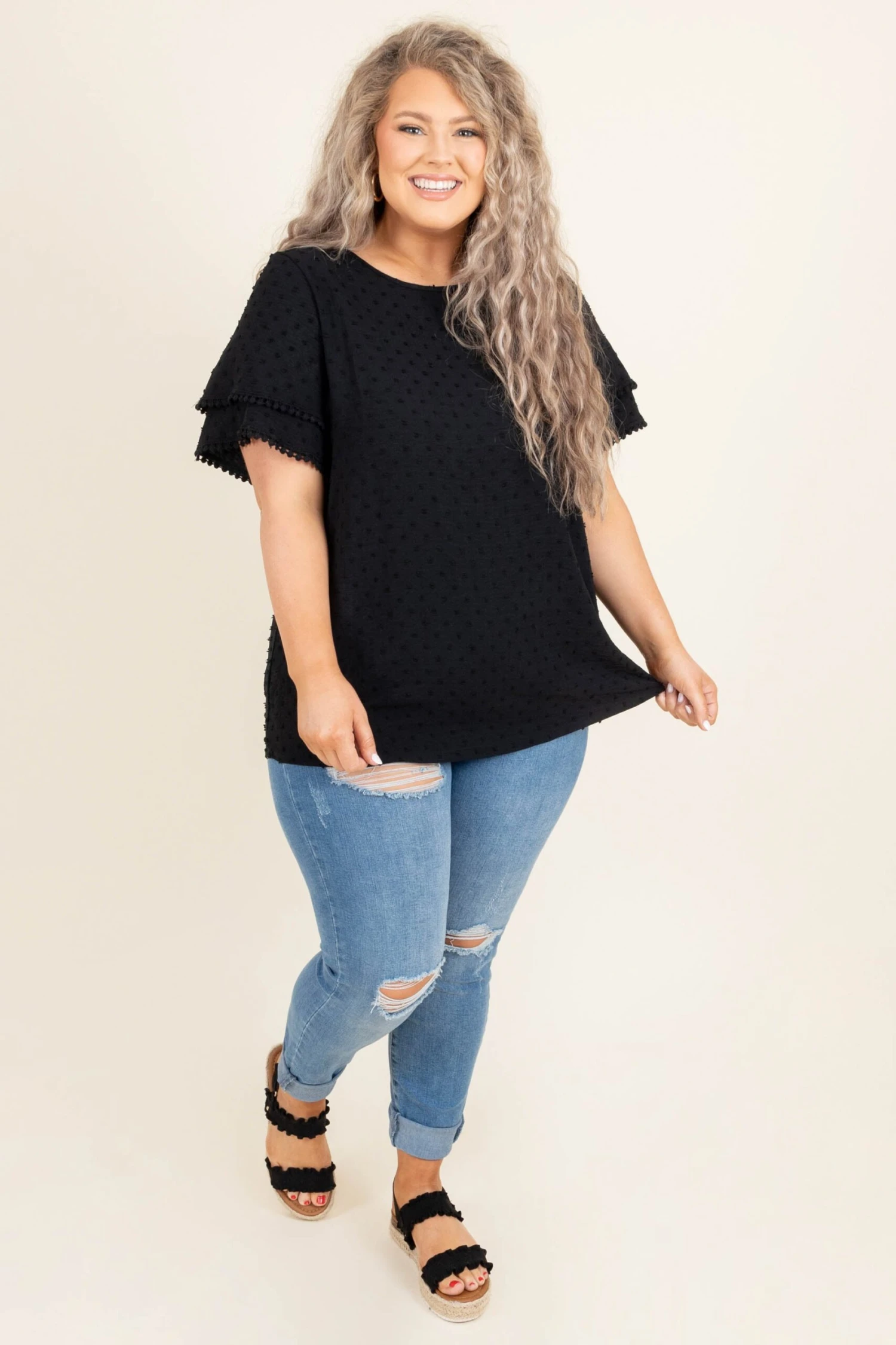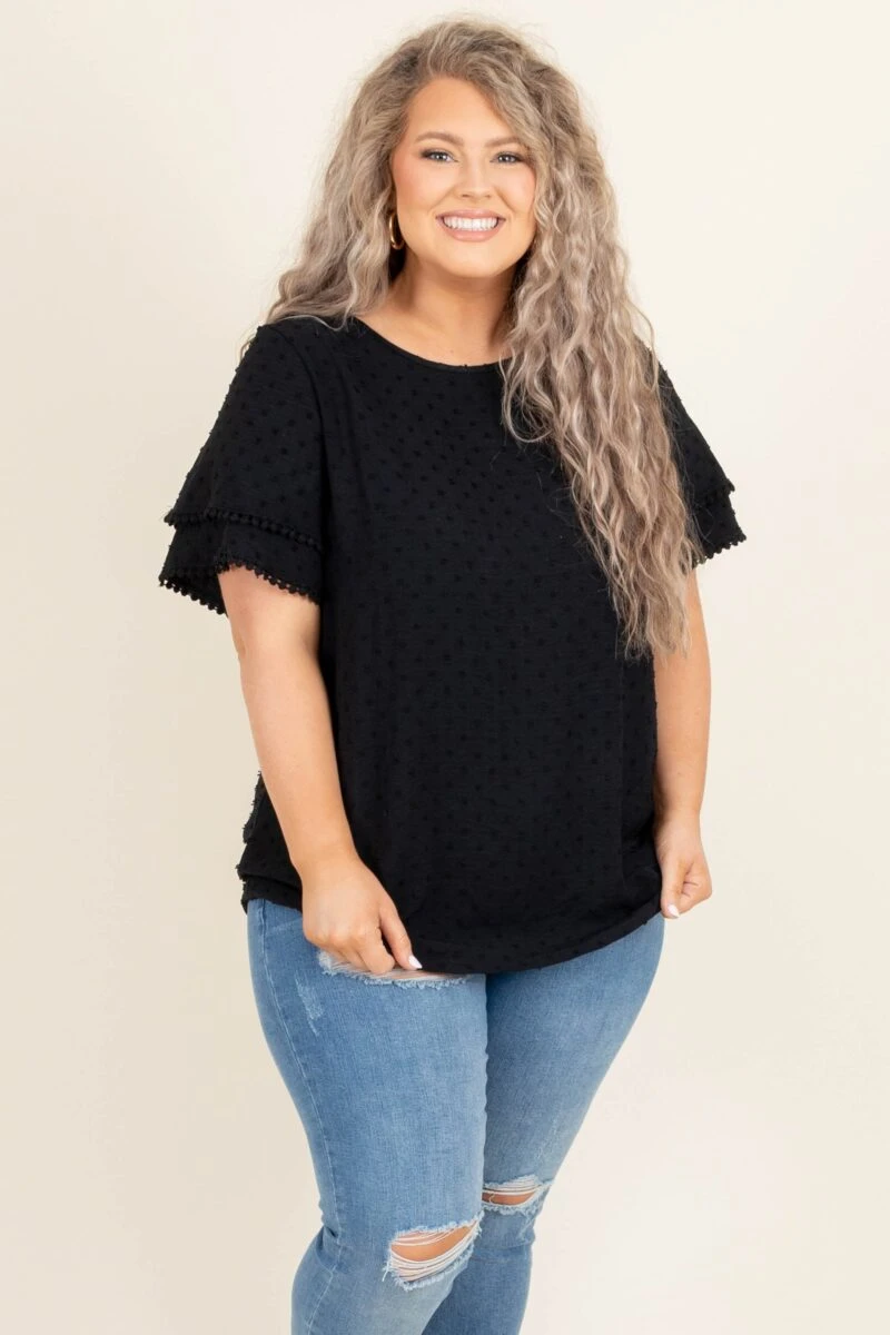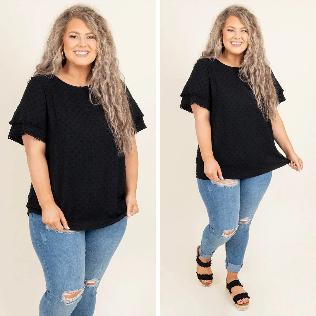 Everyone will be smitten with you while you’re wearing this top! This elegant black top can easily match any color and is the perfect addition to any wardrobe! The swiss dot pattern and the extra touch of trim along the sleeves will add the perfect amount of flair to any look! Simply pair with skinnies and sandals for a look that will catch everyone’s attention!