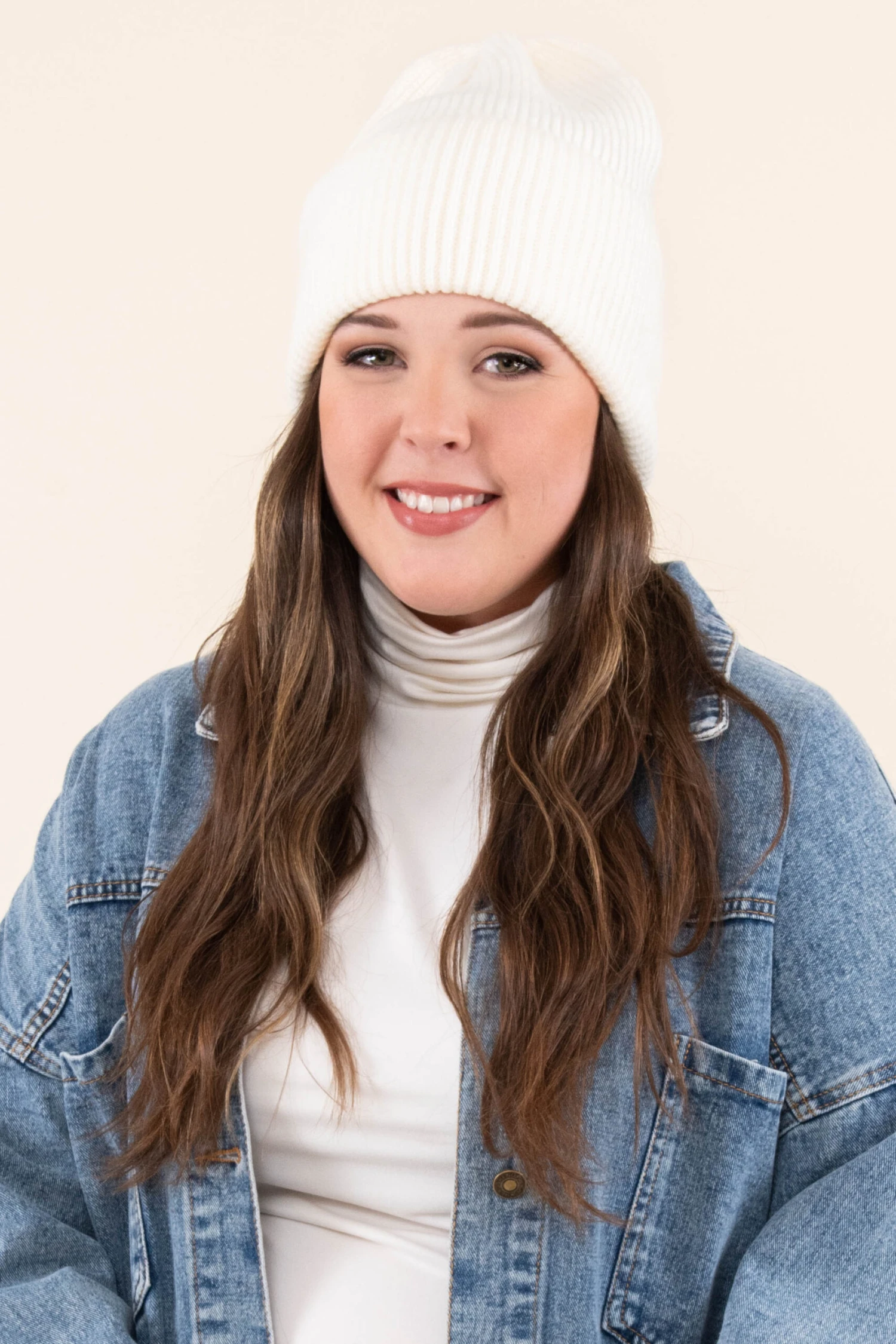 Stay warm and cozy in this beanie! It has the cutest solid white color, a trendy ribbed fabric, and a cozy feel that’s perfect for snow days! Style this beanie with a warm sweater and scarf for a fun cold weather look!