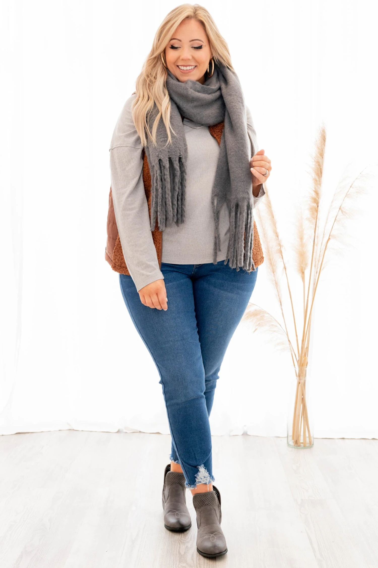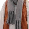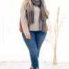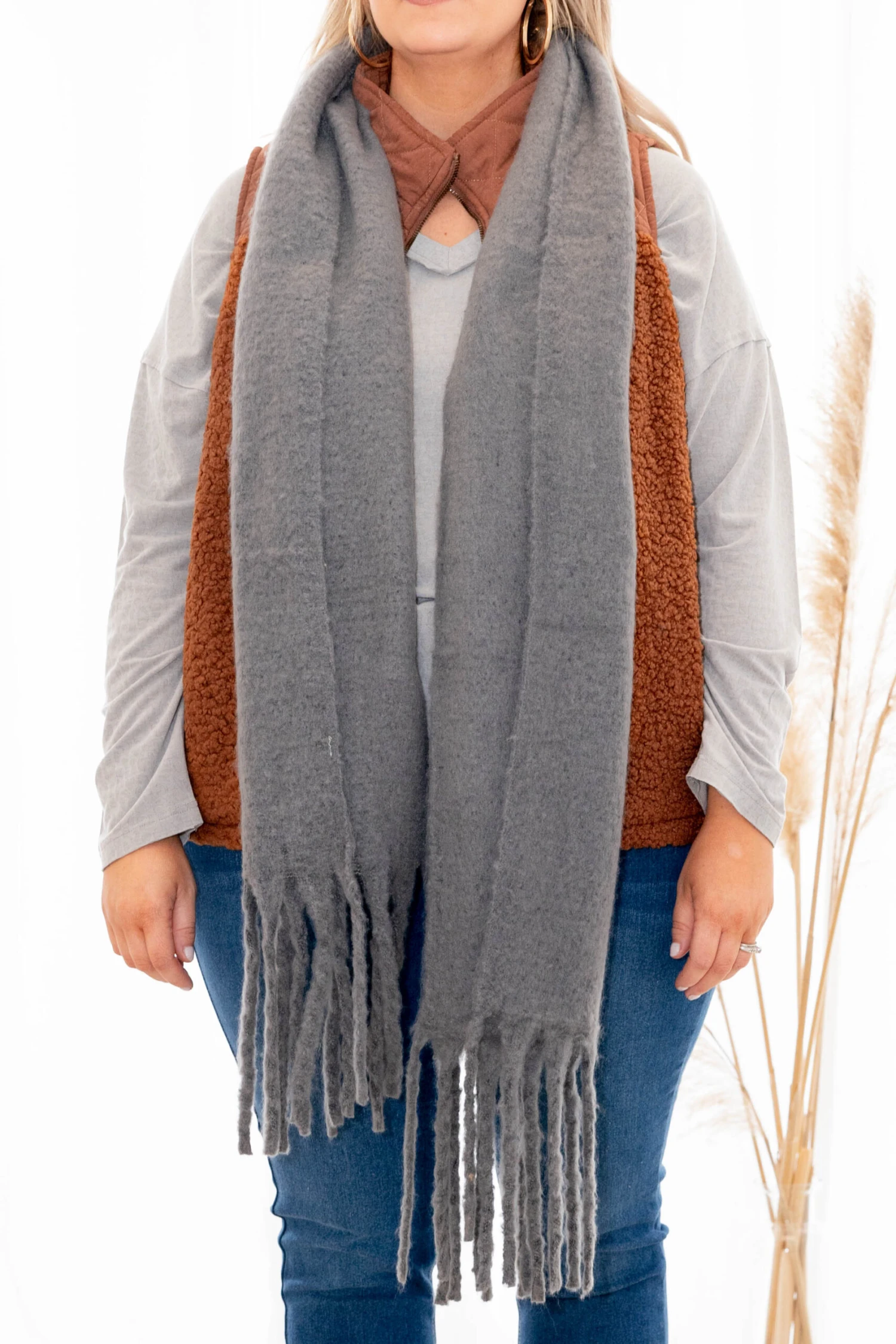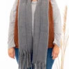 Snuggle up in style with this new gray scarf! It is perfectly soft and features tassel ends. Style with a vest or sweater for a winter look!
