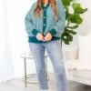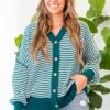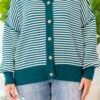 Cozy up this fall with our Snuggly Stripe Button-Up Sweater! This new favorite features a trendy jade green and ivory stripe design and functional buttons for added style and convenience! Say goodbye to boring sweaters and hello to a playful and chic addition to your wardrobe!