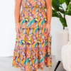 Introducing your new wardrobe favorite – the So Happily Dress! This playful, tiered maxi dress features a smocked bodice and adjustable tie straps for a comfortable and flattering fit! The bright abstract print, adorned with ric rac detail, adds a touch of fun to any occasion!