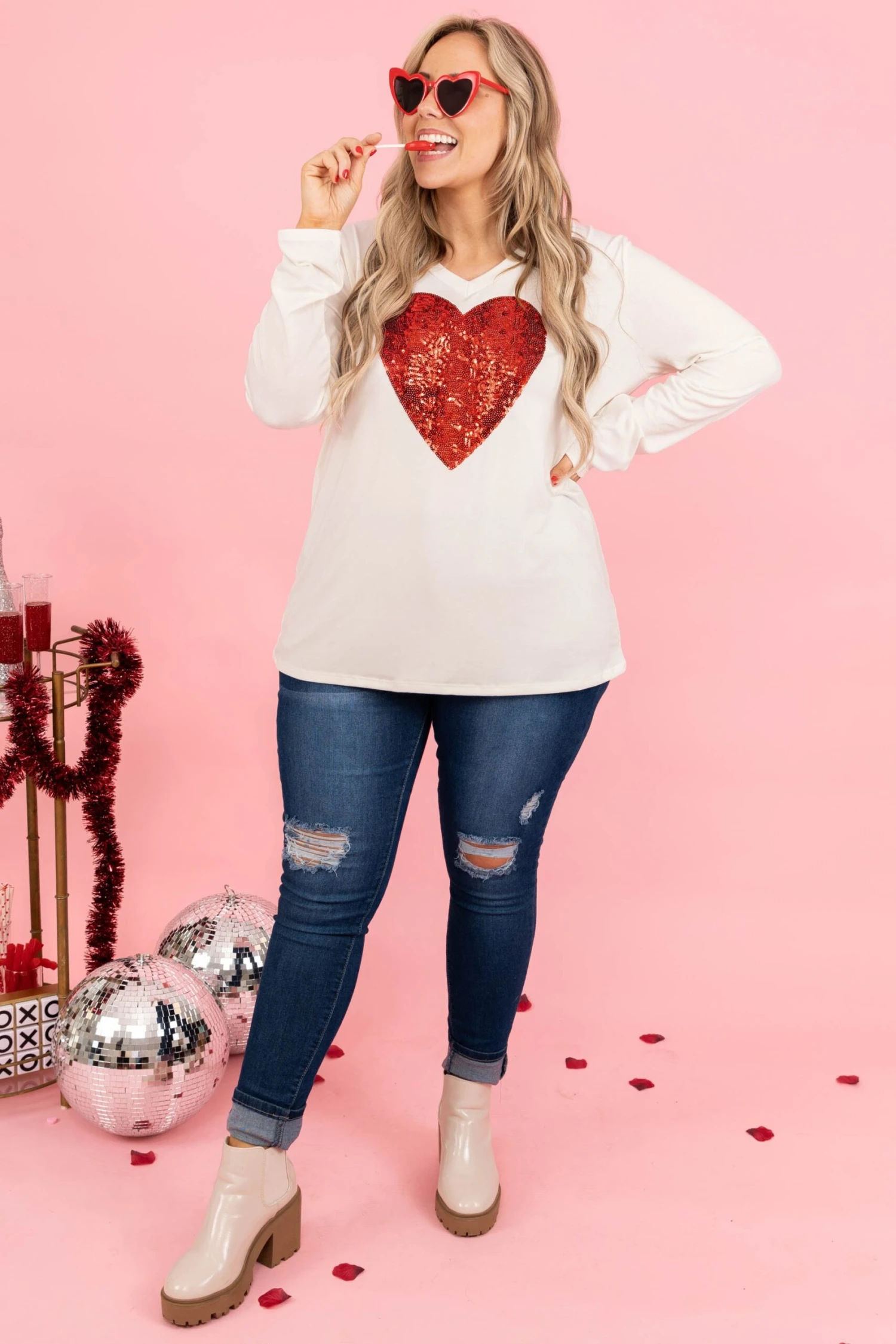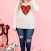 We a re blowing kisses at this sweet top! It has a neutral ivory color with a sequin heart that so fun and chic! The stretchy, figure flattering fit is perfect for a Valentine’s party! Pair this top with some distressed skinnies and boots for a classic chic look!