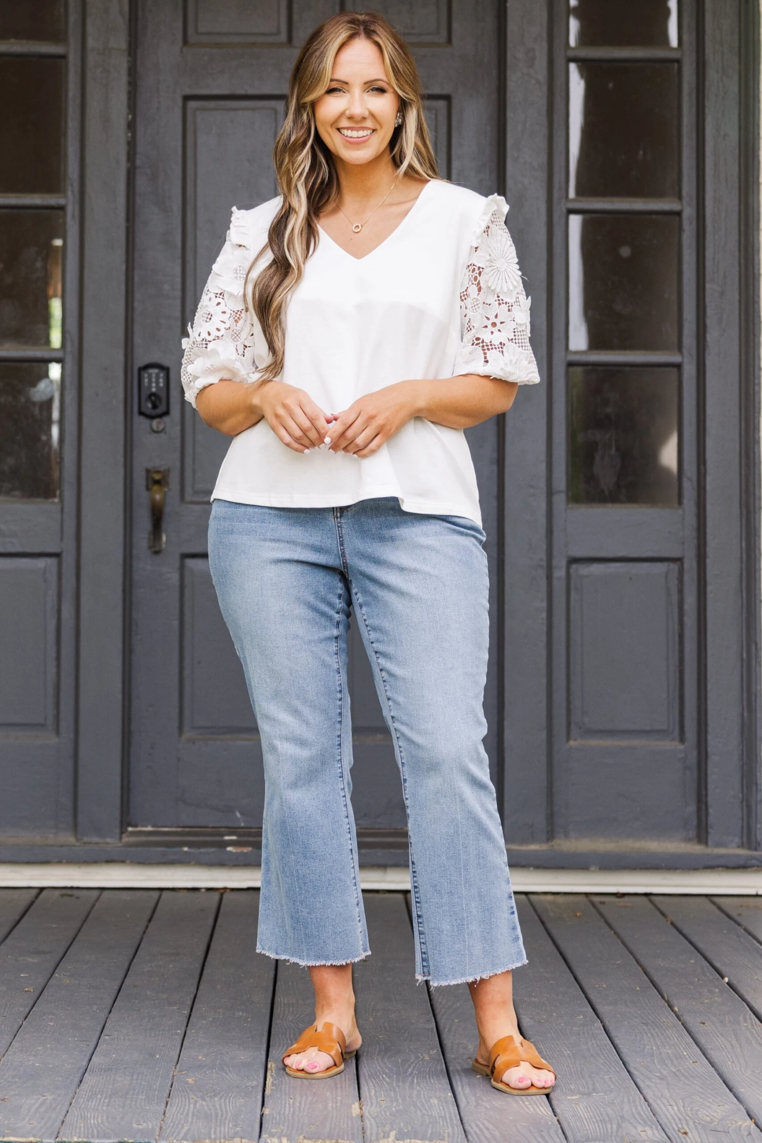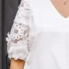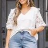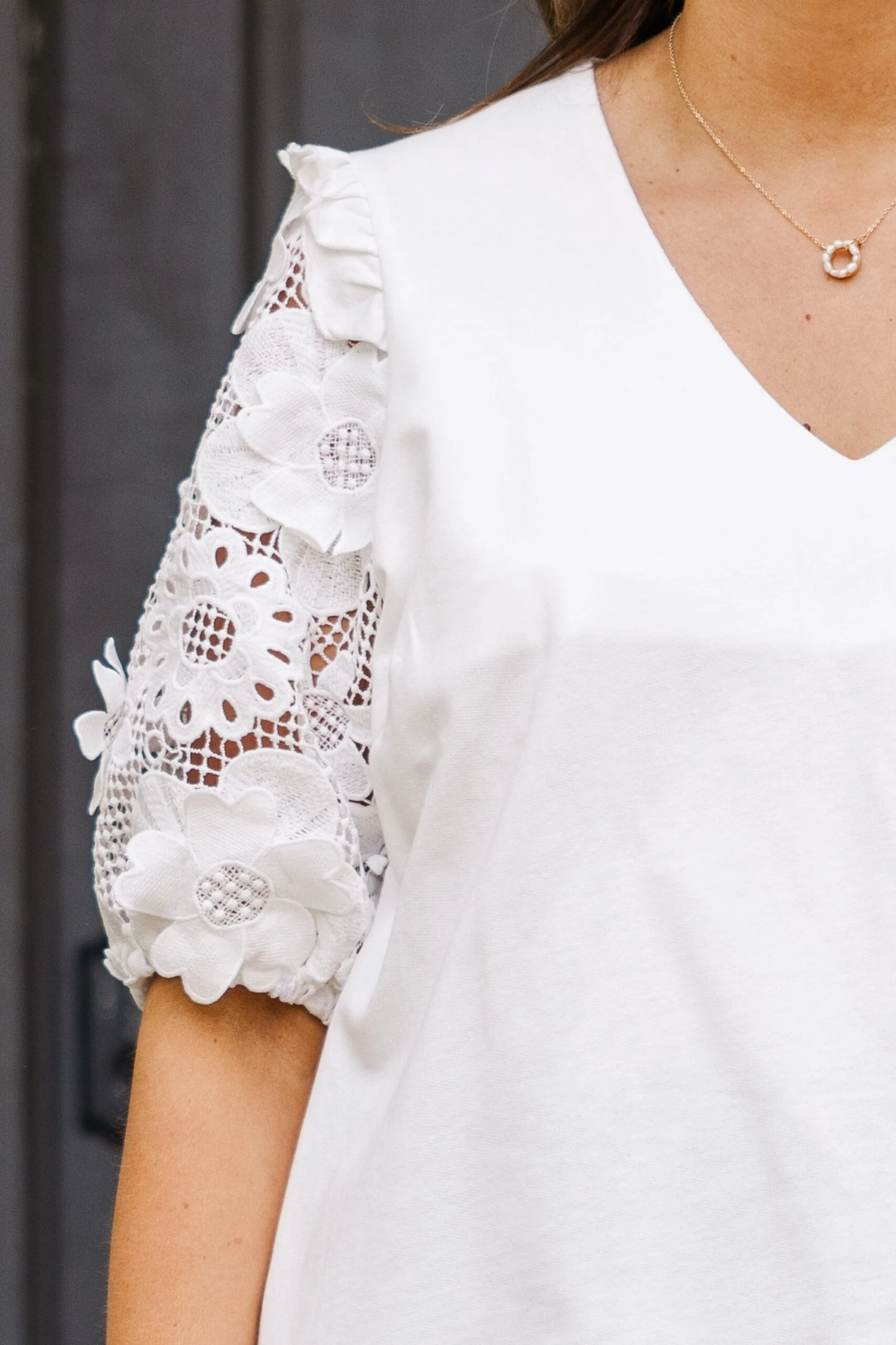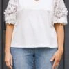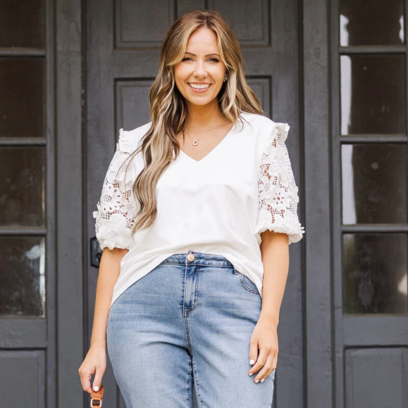 You + this top = combo unmatched! It is the perfect addition to any wardrobe! With its delicate floral lace sleeves and neutral color, it exudes elegance! Plus, it’s incredibly comfy and can easily be dressed up or down! Pair with your favorite denim or colored pants for a timeless and chic look!