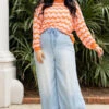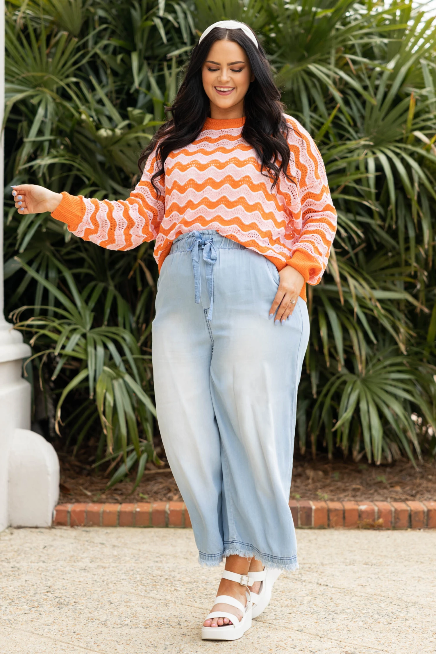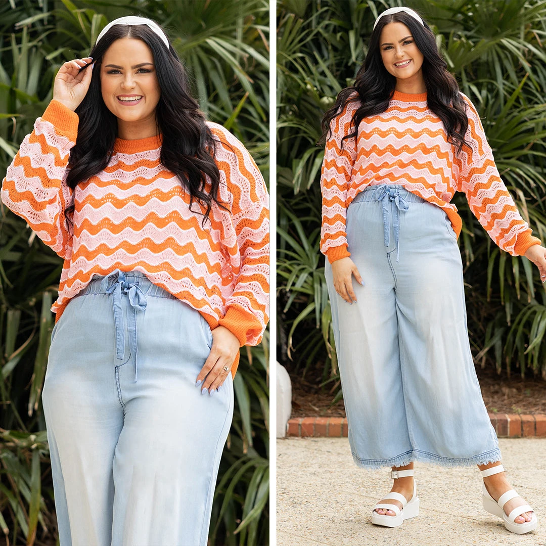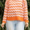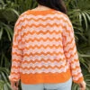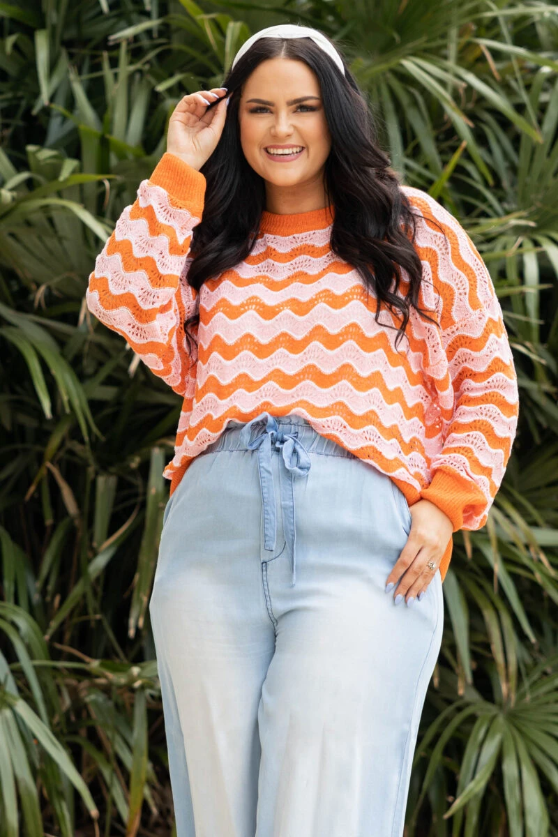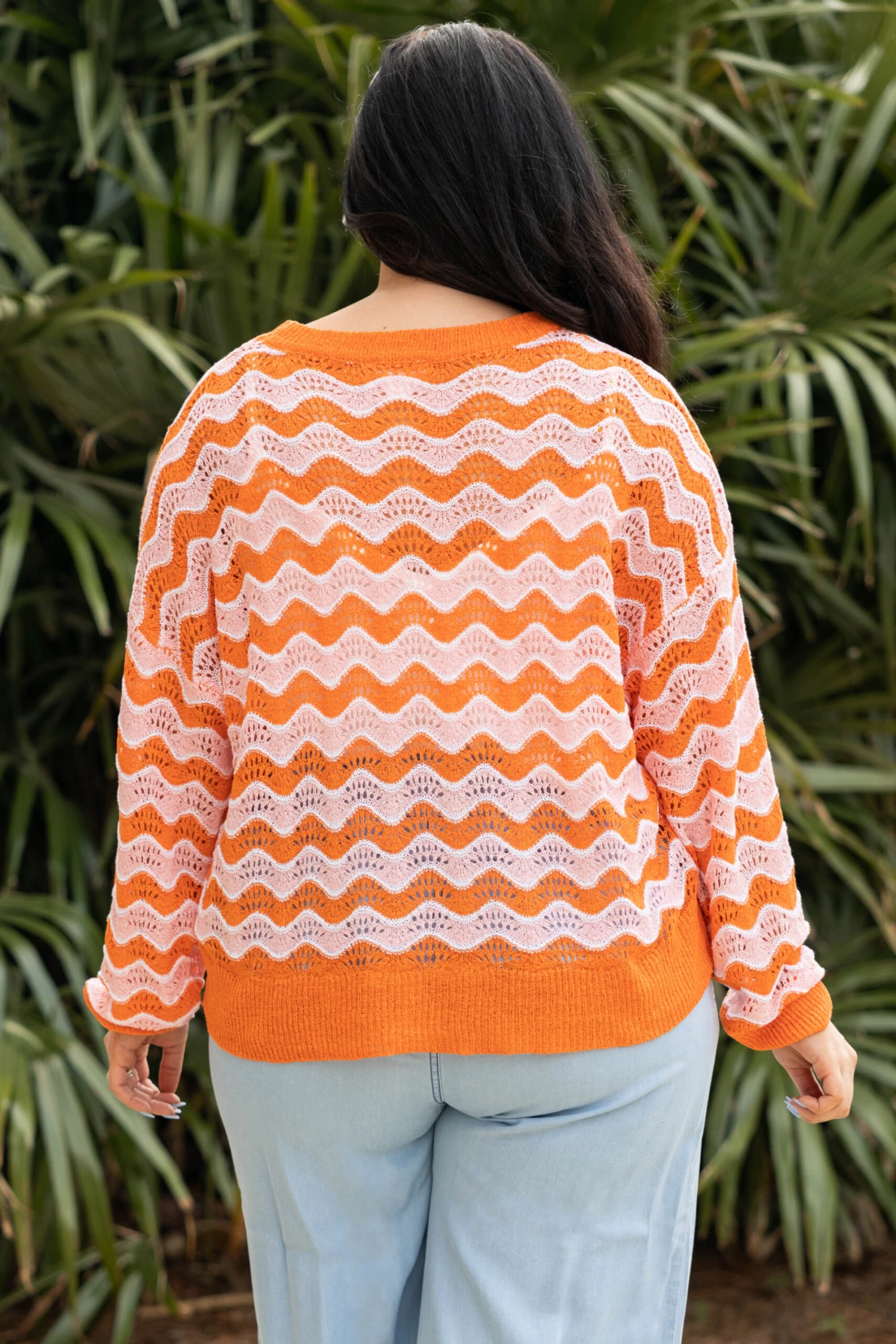 Make some waves in your wardrobe with this lovely top! This sweater has a bold orange with a chevron design that is super trendy and chic! The stretchy, figure flattering fit is just what you need for the season! Style this top with some cute pants and wedges for a sassy chic look!