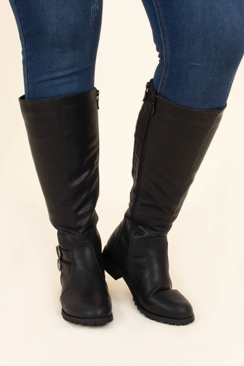 These boots can be solely yours with just one click! Add these trendy boots to your cart now! They have a classic black color you can dress up or down and style with everything in your wardrobe! They feature the cutest buckle detail, have a tall design, and an adjustable wide calf fit you’ll want to wear all day long! The extra zipper detail allows for an additional three inches of width, and did we mention how easy they are to style? Pair these boots with skinnies or a patterned dress for an effortlessly chic look!