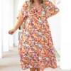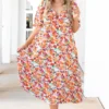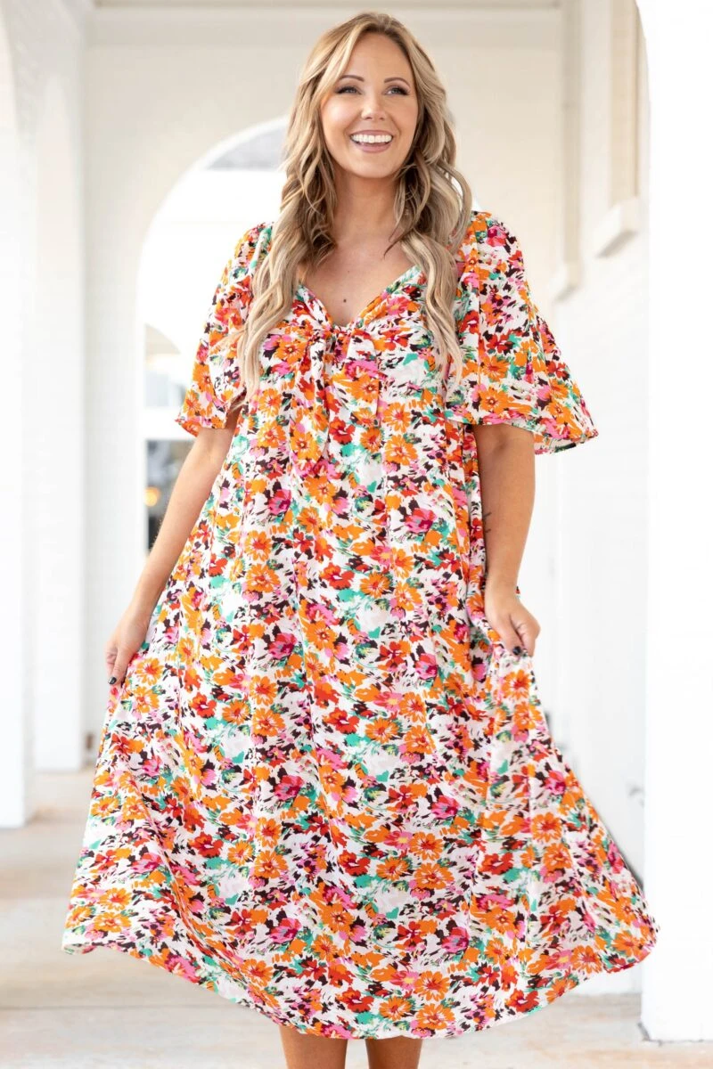 We know you will LOVE this dress! It has a bold orange color with a trendy floral pattern that is just in time for the season! The vintage neckline is so sassy and sweet! The flowy fit and midi length is great for any occasion! Pair this dress with heels or wedges for a classy chic look!