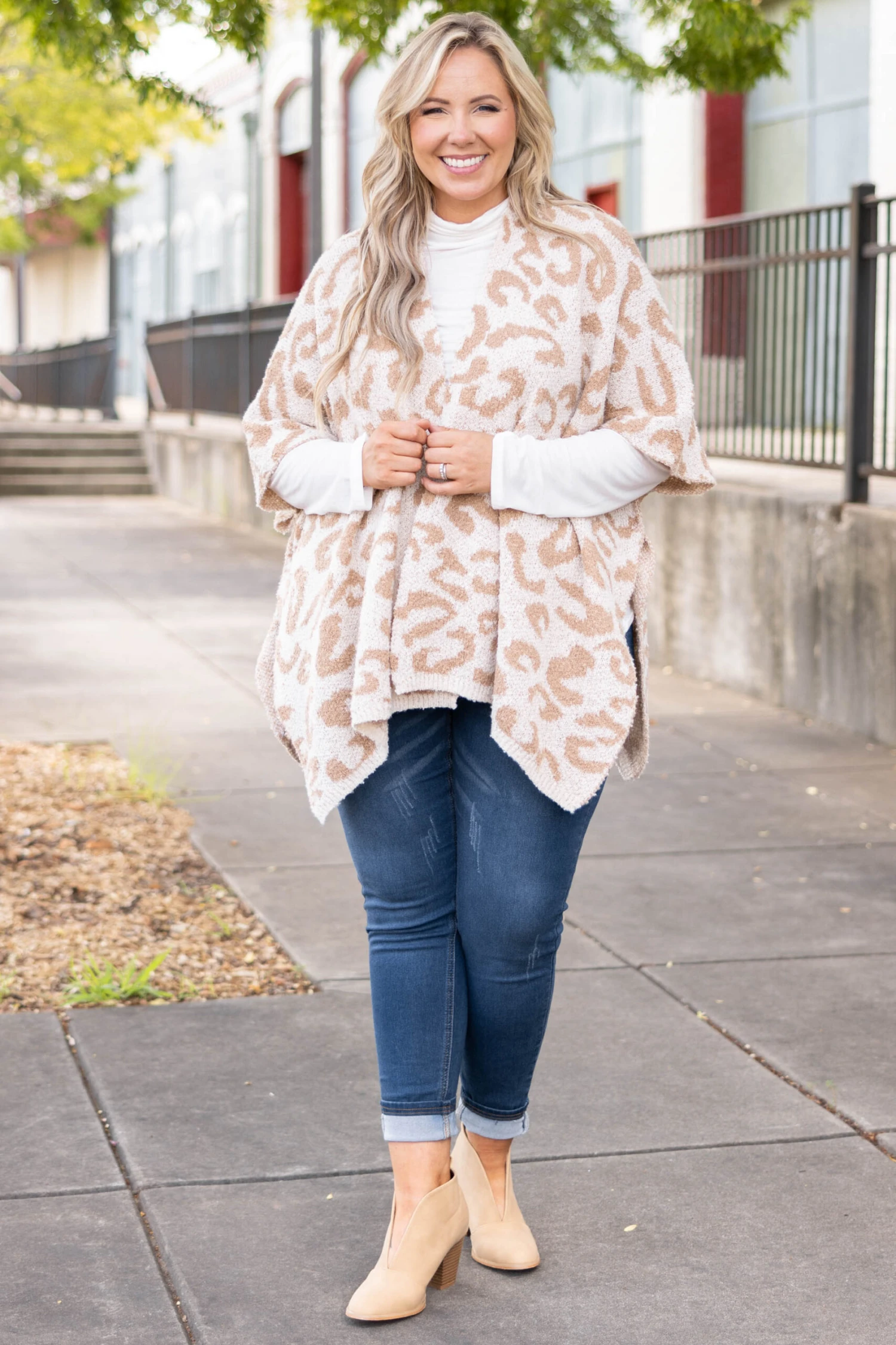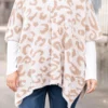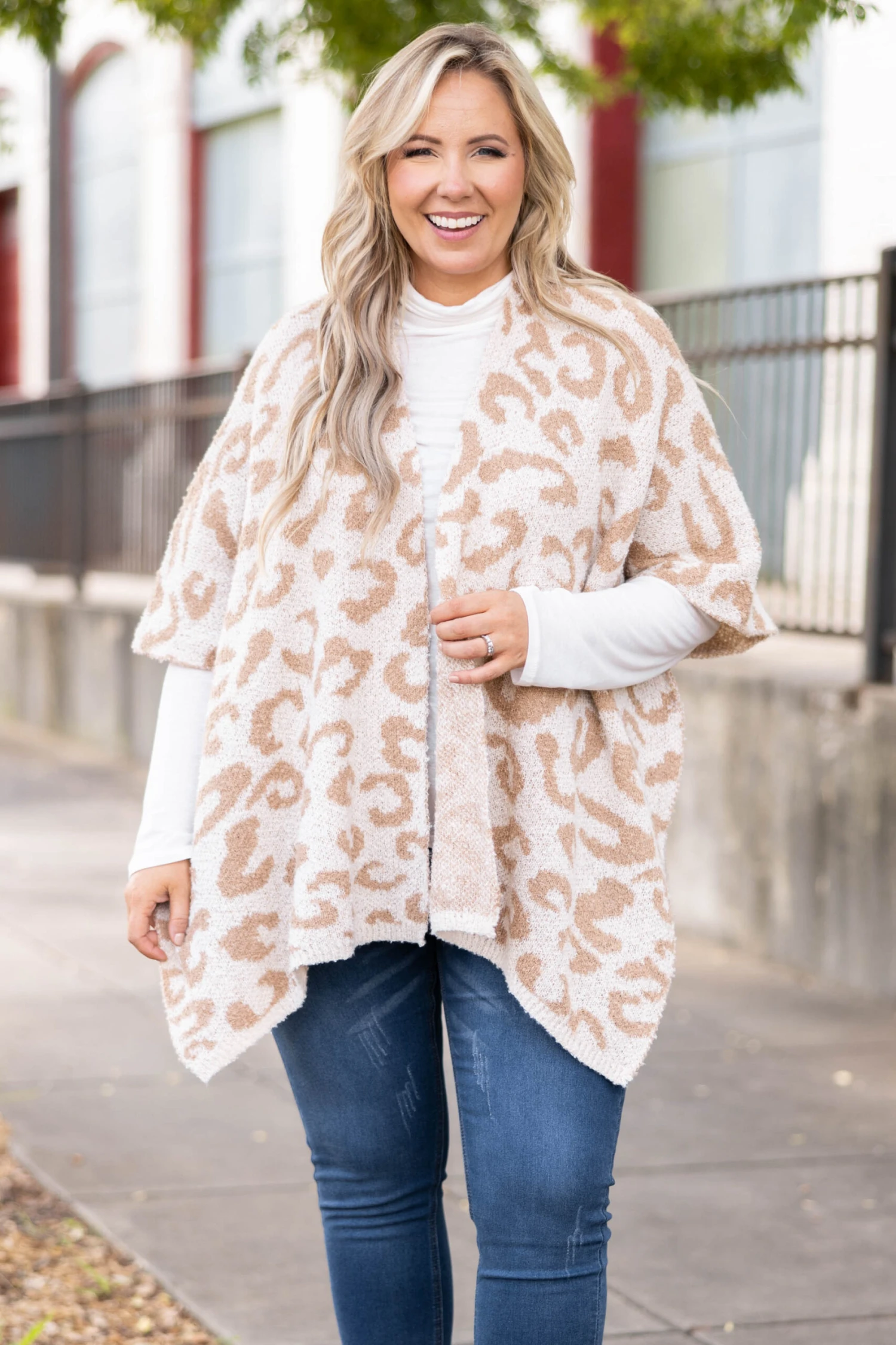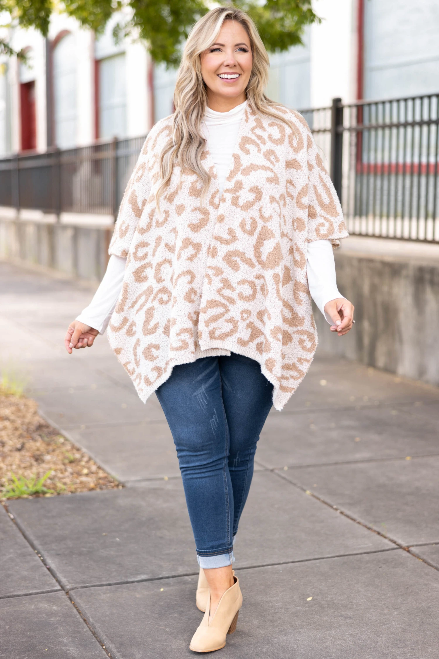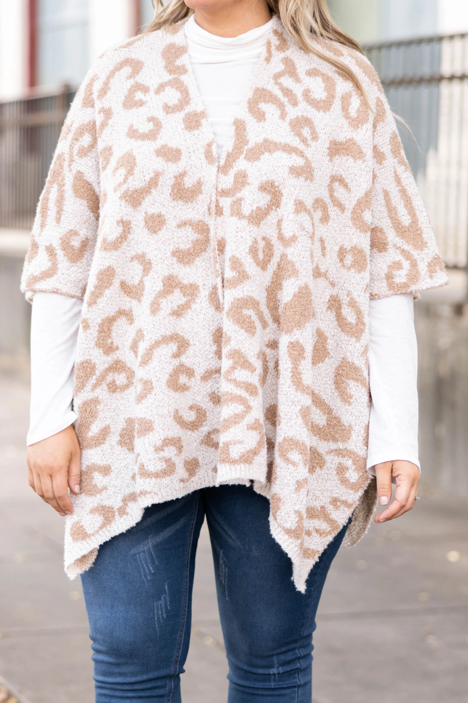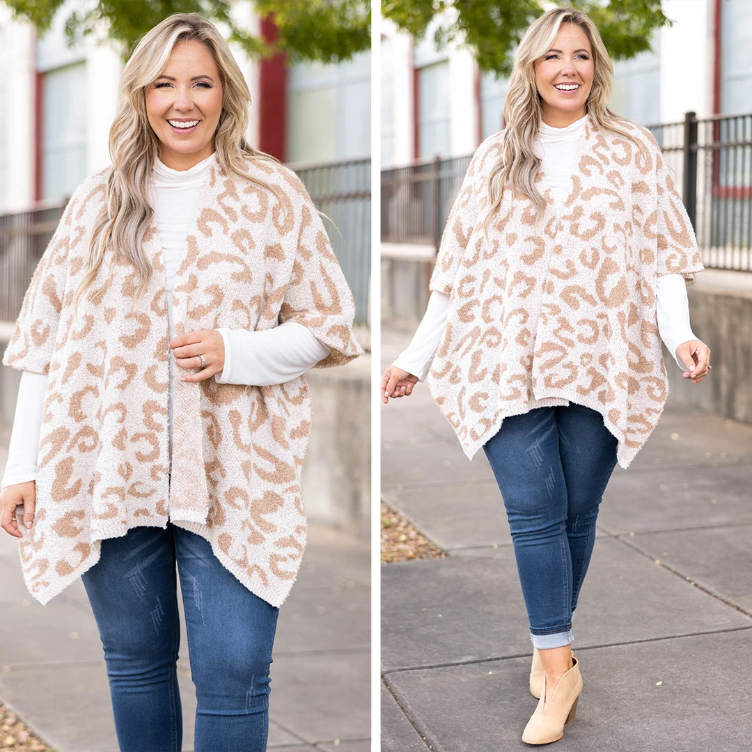 We simply love this amazing poncho! It has a soft neutral color with a trendy leopard pattern that is perfect for the season! The stretchy figure flattering fit is great to pair with all of your favorite outfits for a sassy chic look!