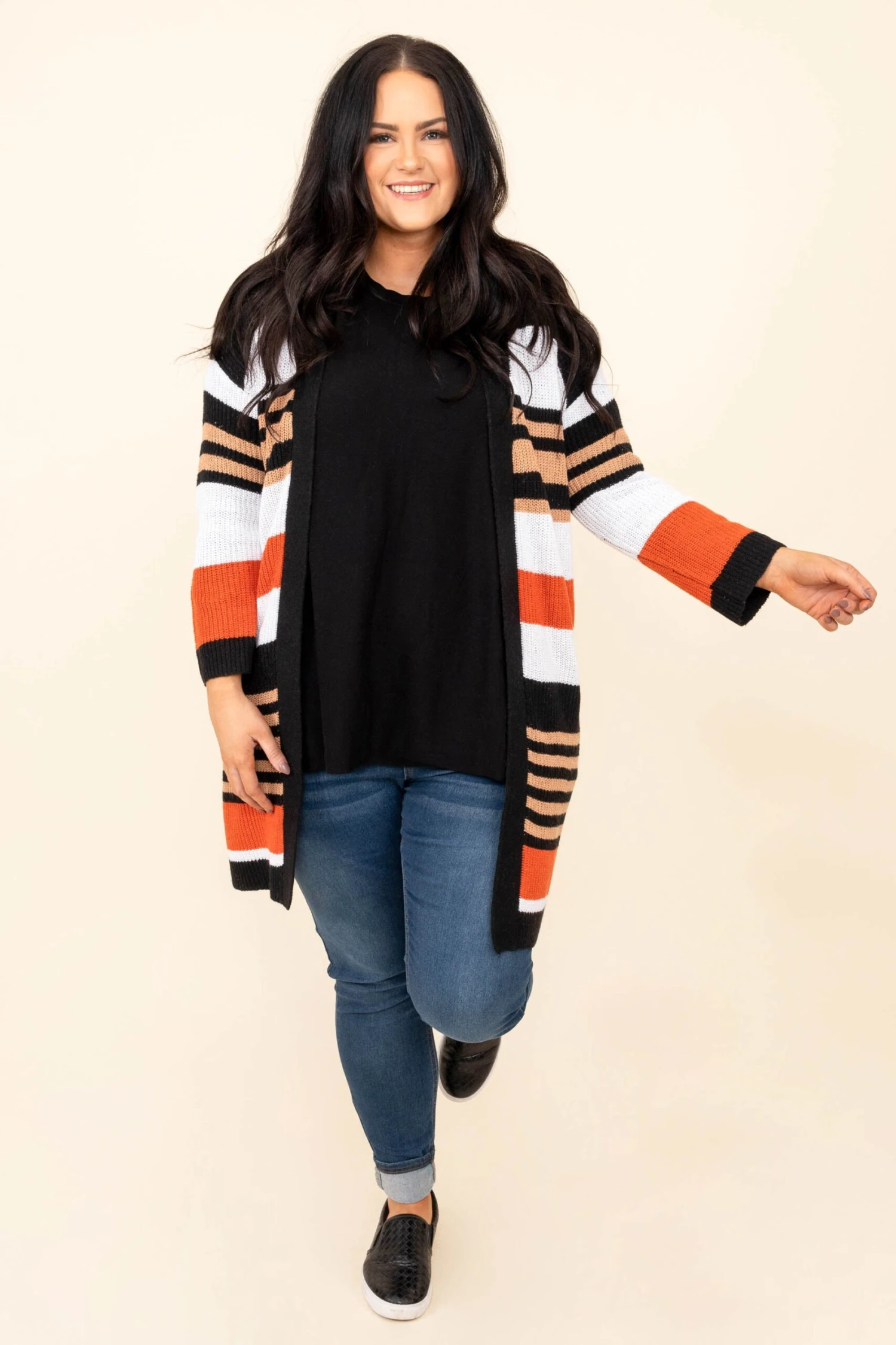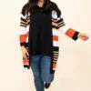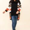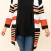 We simply love this top! This cardigan has a gorgeous multi color with a stripe pattern and colorblock design that pairs well with all of your faves! The stretchy, figure flattering fit is perfect for all day wear throughout the season!