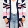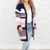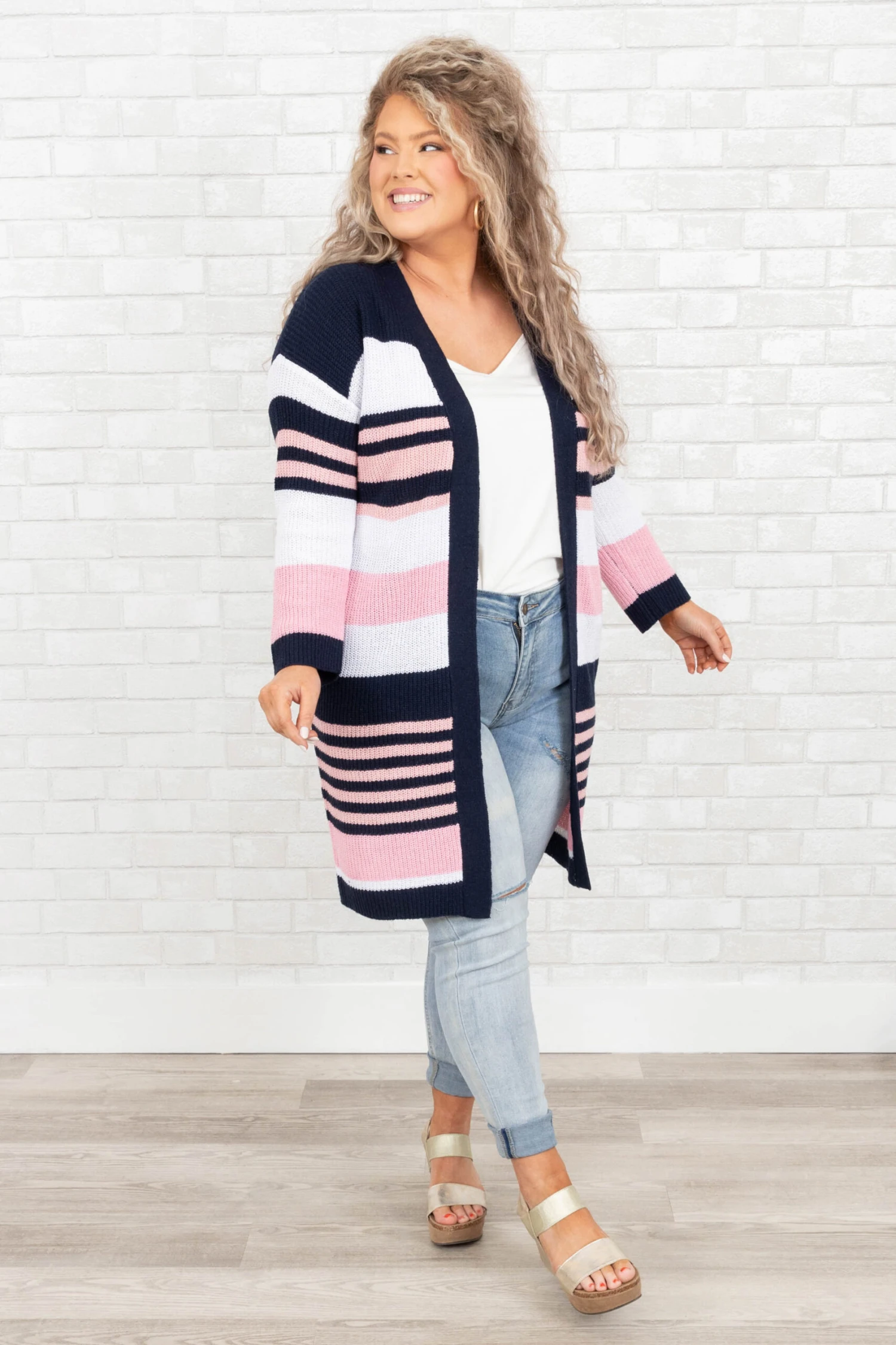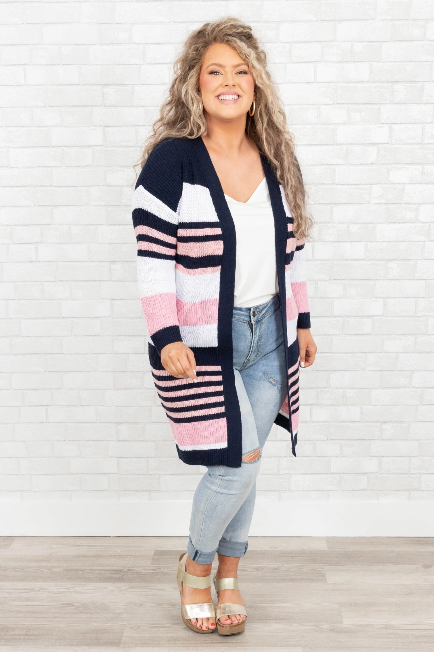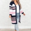 We simply love this top! This cardigan has a gorgeous navy multi color with a stripe pattern and colorblock design that pairs well with all of your faves! The stretchy, figure flattering fit is perfect for all day wear throughout the season!