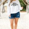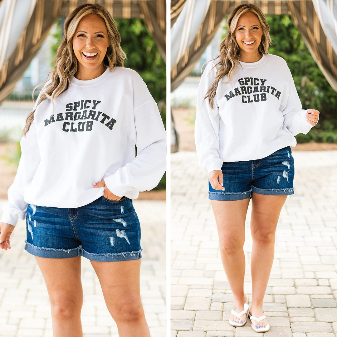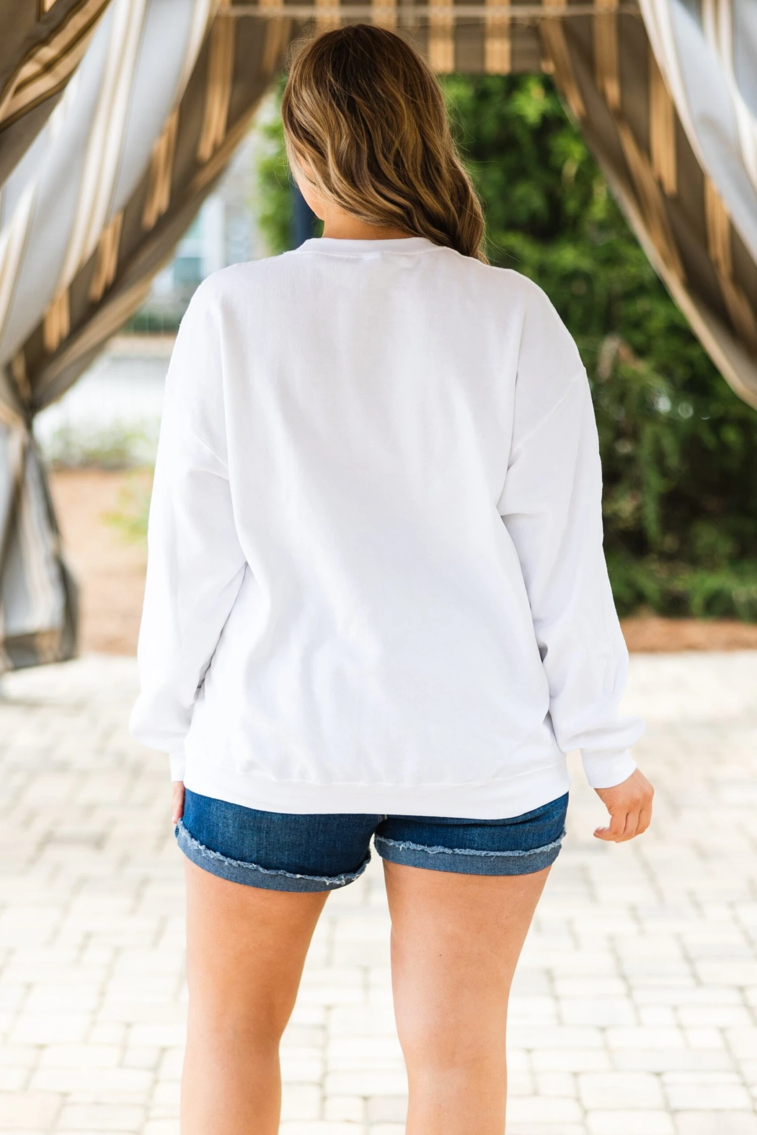 Spice up your wardrobe with the addition of this beauty! This sweatshirt has a classic white color with an adorable graphic that is simple but oh so cute! The stretchy, comfy fit is great for layering over all of your faves on a cool day or night this season! Style this sweatshirt with some cute, distressed shorts and sandals or sneakers for the ultimate chic look!